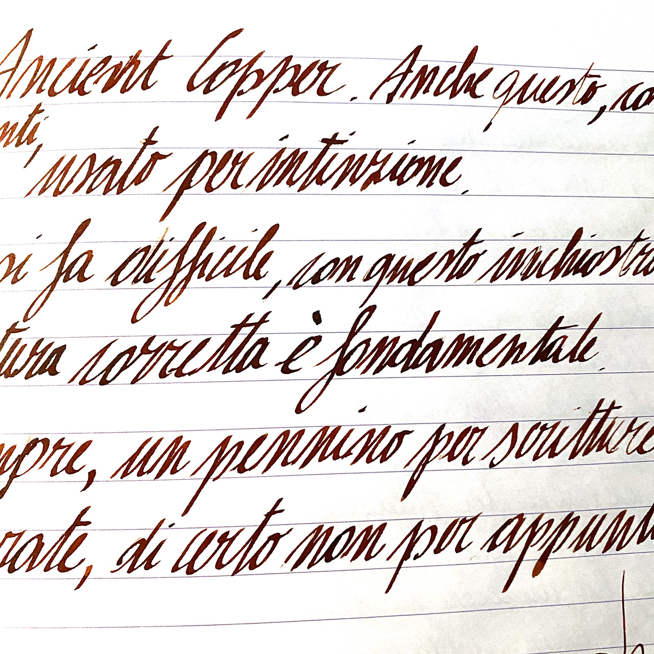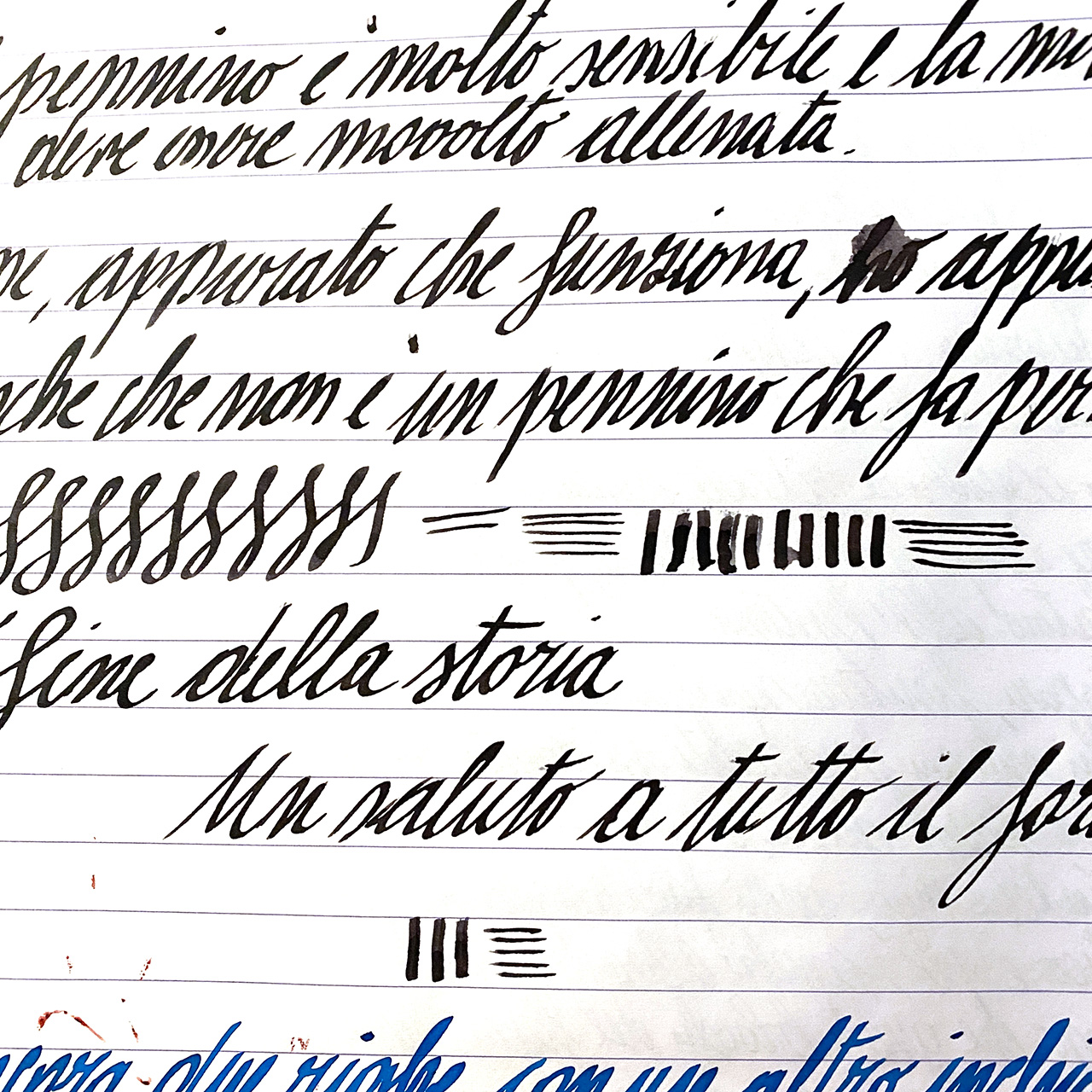 Il pennino è duro, quasi un chiodo, per cui la dimensione del tratto la si imposta prima di iniziare a scrivere regolando l’inclinazione della penna. È praticamente impossibile per me variare il tratto lettera per lettera come lo si fa, invece, con un pennino flessibile: il pennino goccia non è un pennino calligrafico ma un pennino multi tratto.