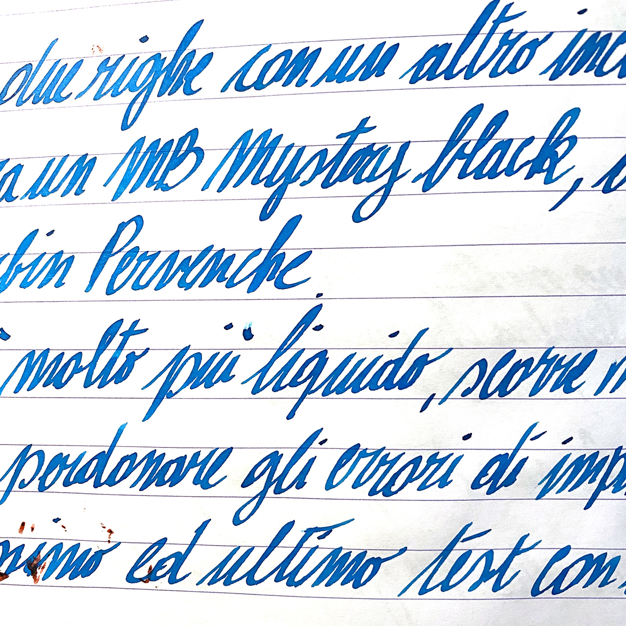 Esperienze con lo stub le avevo già avute con un 1,1 di TWSBI e un 1,9 di Lamy e sapevo che dovevo cambiare modo di scrivere per usare quei pennini al meglio. Scelsi l'italico che, a differenza dello stub, ha i bordi esterni della punta a spigolo vivo e non stondati. L'italico di Aurora, quindi, è un pennino dalla punta tagliata di netto e va usato totalmente piatto sulla carta altrimenti non scrive. Nonostante ci abbia provato ripetute volte e sia riuscito anche a prenderci un po’ la mano, rimane un pennino ostico, difficile da domare. Un’altra esperienza deludente.