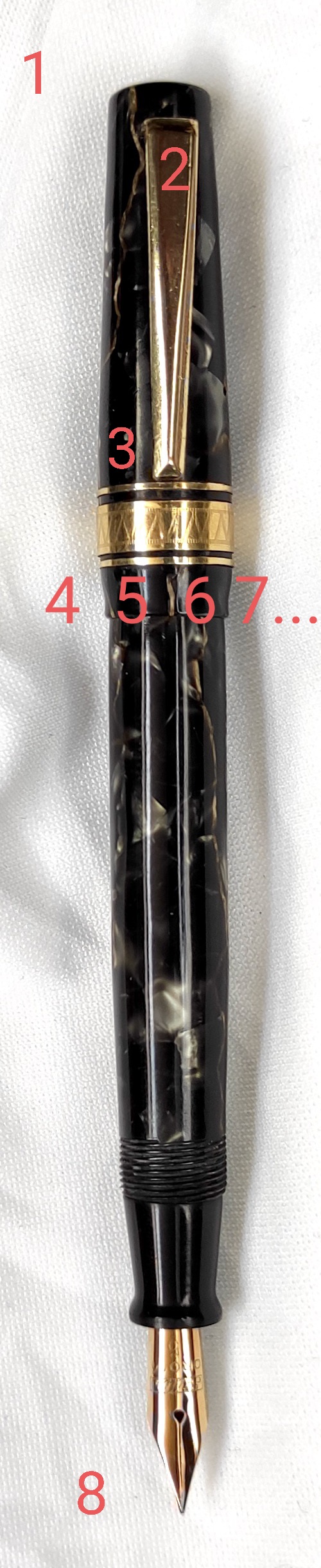 Grazie. Ah, se ci mettiamo a fare geometria e matematica, ti posso dire che la lunghezza della clip/fermaglio sommata alla lunghezza del cappuccio è pari alla lunghezza dell'intera penna non coperta dal cappuccio stesso, fino al pennino ; manco a dirlo, i rapporti tra le varie lunghezze hanno per risultato il numero (approssimato) 1,62
