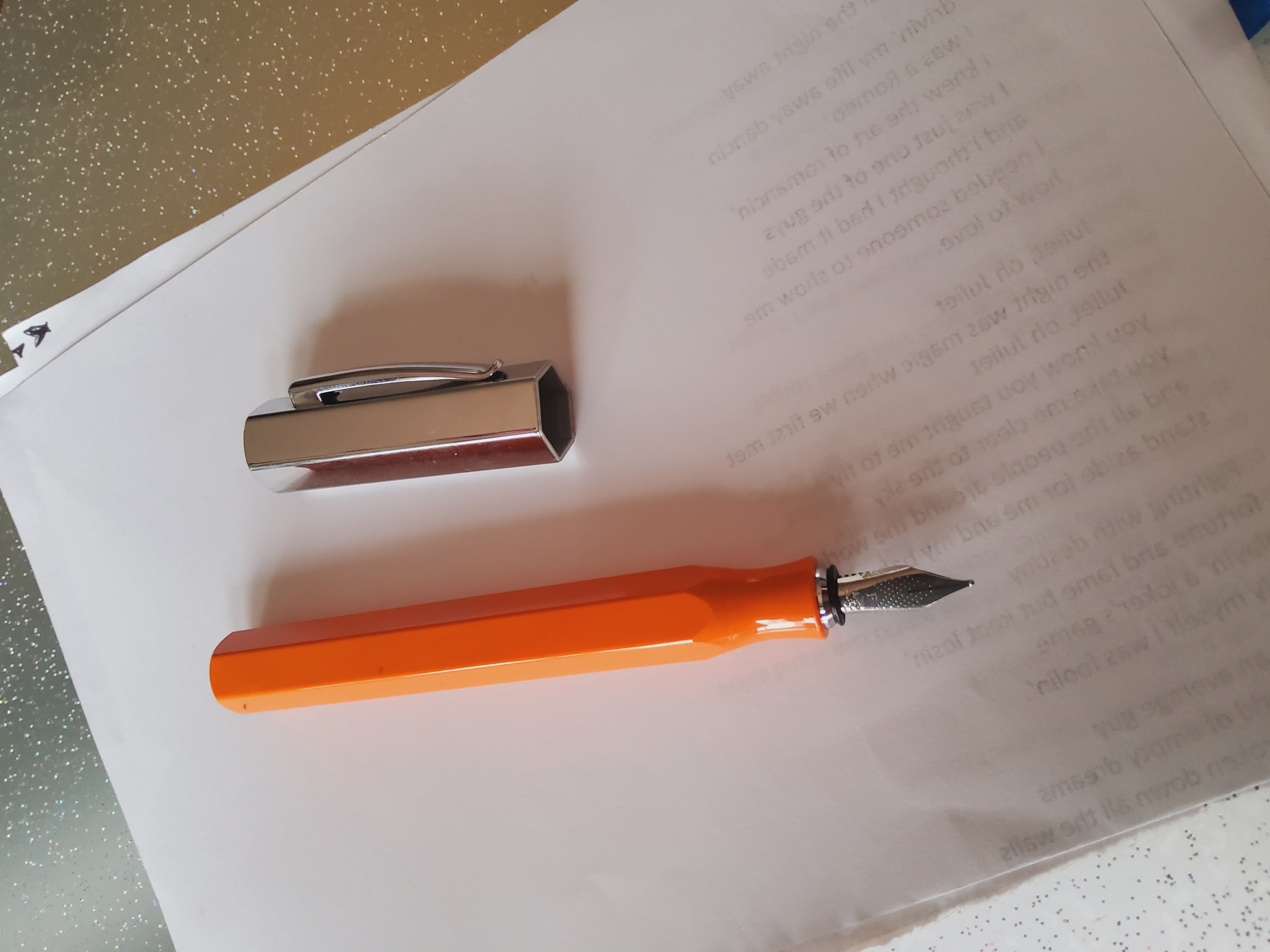 Il pennino è molto buono, rigido ma molto scorrevole. Anch'io sono rimasto attratto dalla arancione (ce n'è una di quelle in legno che è altrettanto bella).