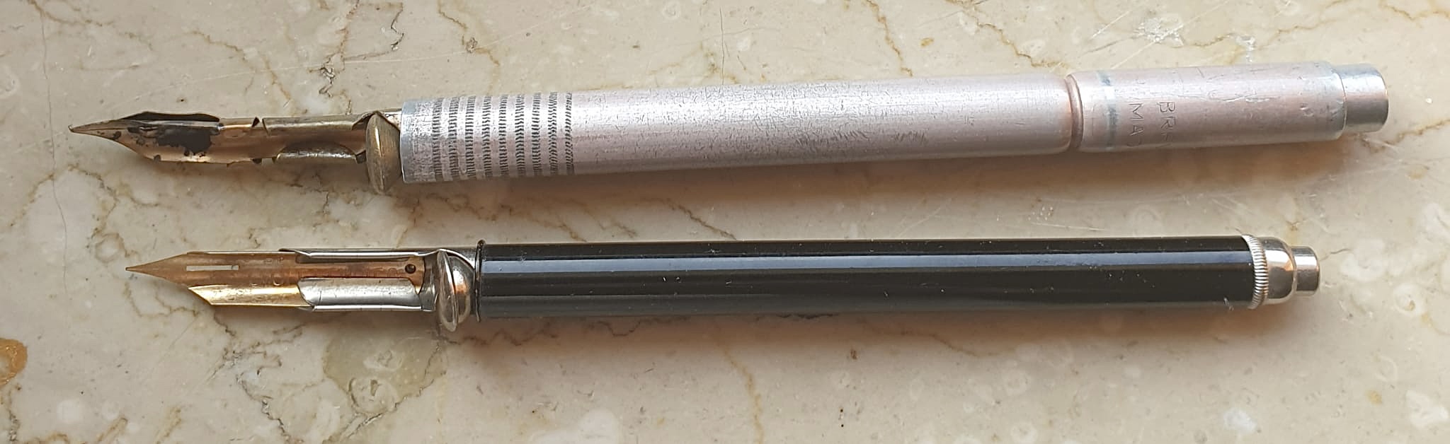 Ecco una Eagle Arrow New York brev.1887 con pennino a gravità e blocco a catenella accanto alla italiana Zambo. Chissà chi dei due ha copiato...