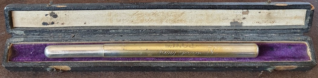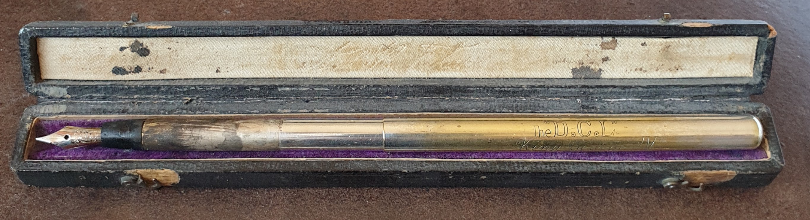 Penna fine ‘800 (probabilmente De La Rue pre-Onoto ma con blocco pennino non originale perché l’alimentatore non è ‘overfeed’) recante la seguente incisione: - Whisky The “D.C.L.” “ King George IV” -. Quando è in uso e con il lungo tubo-cappuccio inserito sul fondo, la penna permette un tipo di impugnatura più simile a quella che si otterrebbe con una lunga penna d’oca che con una stilografica dell’epoca.