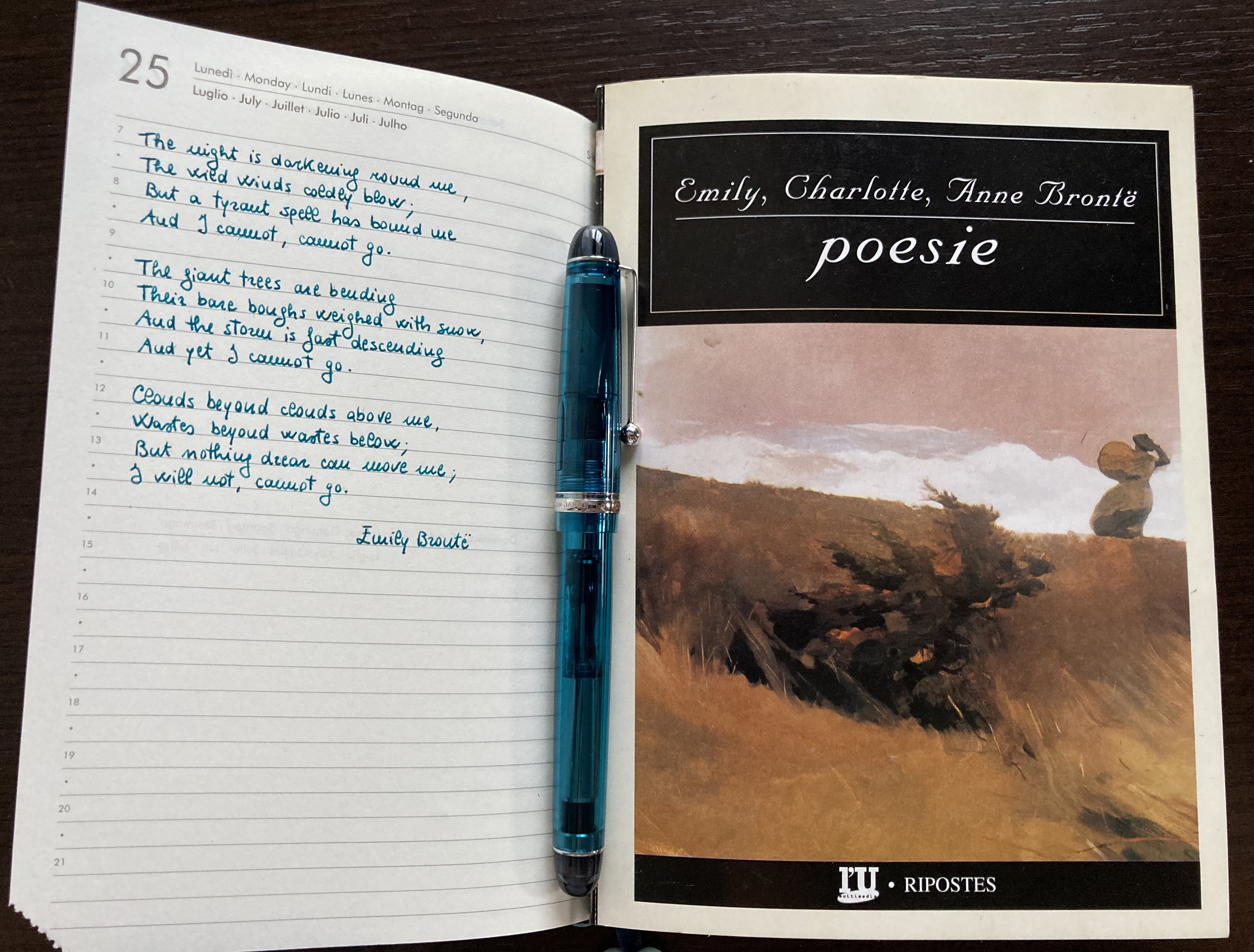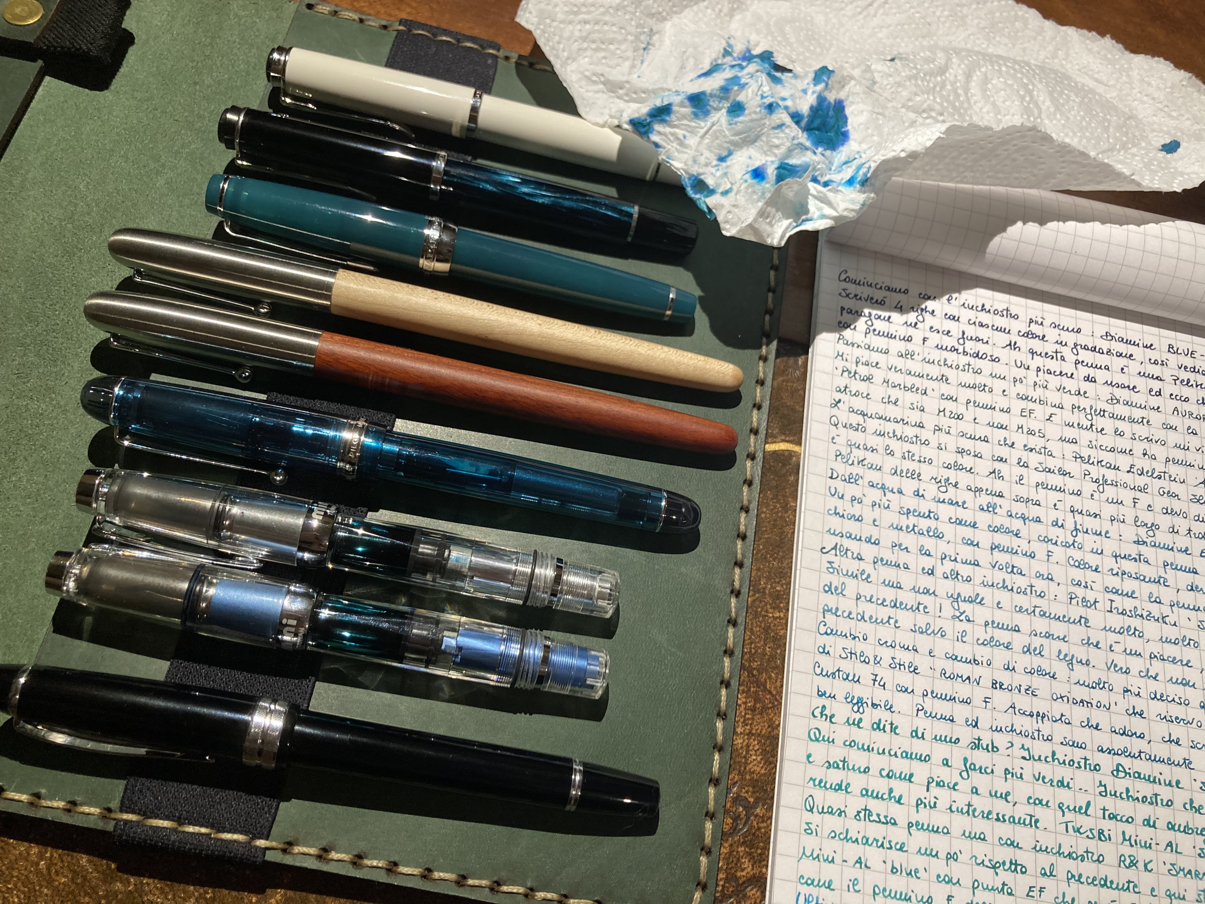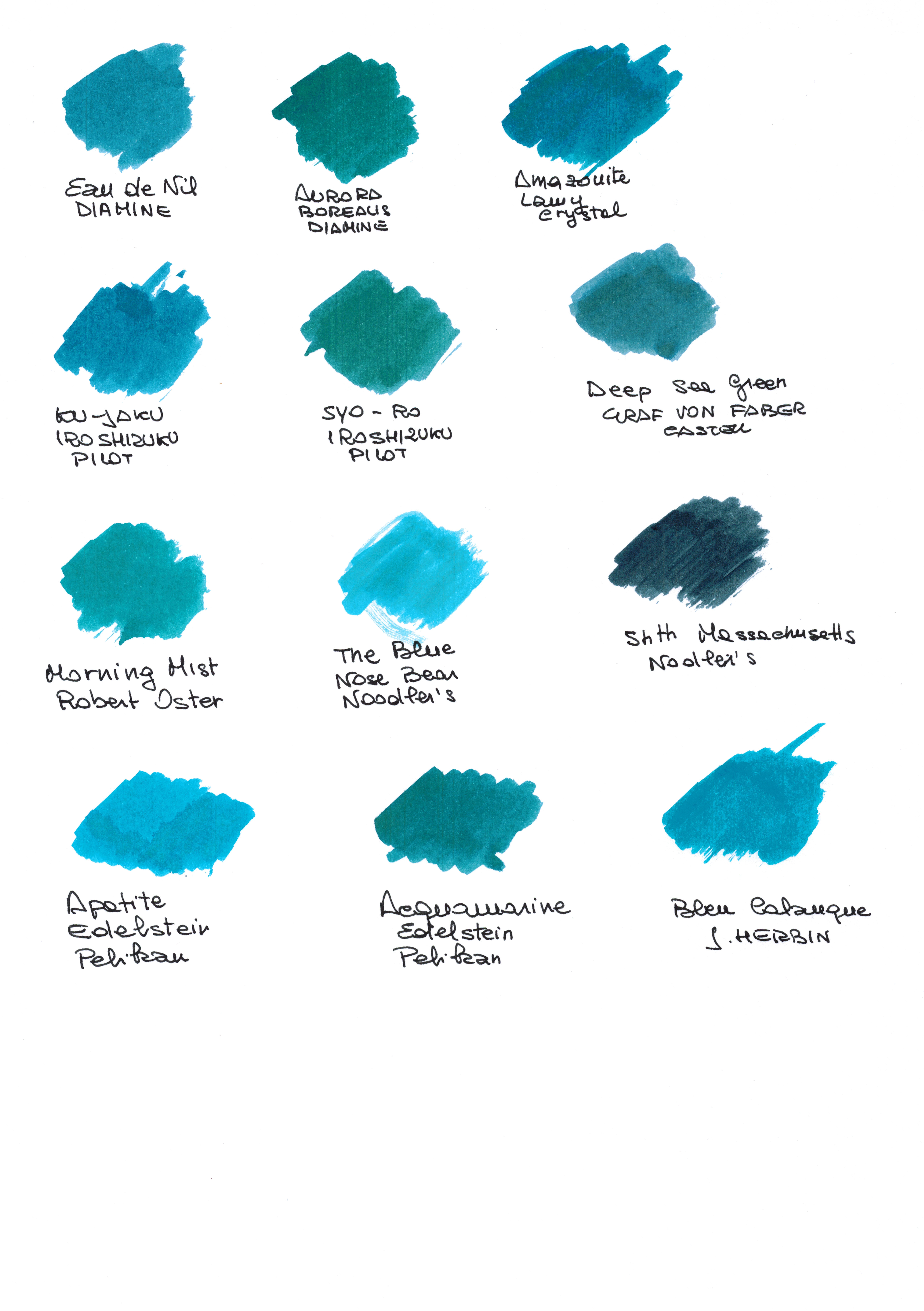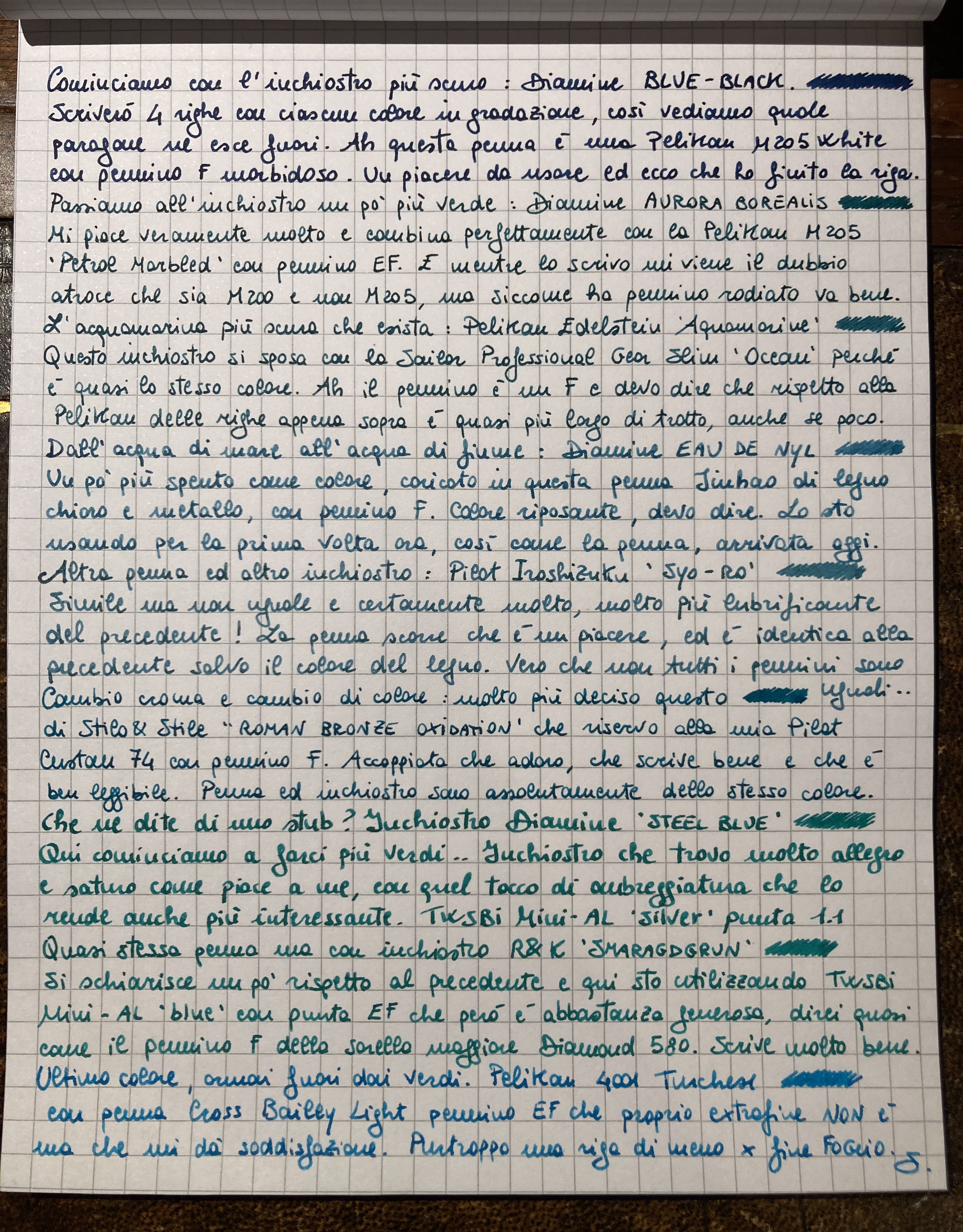 Posso aggiungere che ho notato un po’ di “secchezza” solo in due inchiostri: 4001 Pelikan (risaputo) color turchese e Diamine ‘Eau de Nyl’. Tutti gli altri a pari merito per scorrevolezza, con menzione d’onore per il Pilot Iroshizuku (risaputo bis). Ovvio anche le differenze di pennino incidono, ma prendete questa prova solo come indicazione un po’ per le differenze di colore, giusto per sapere dove collocare qualche nome, se più tra i verdi o più tra gli azzurroverdescuro :D