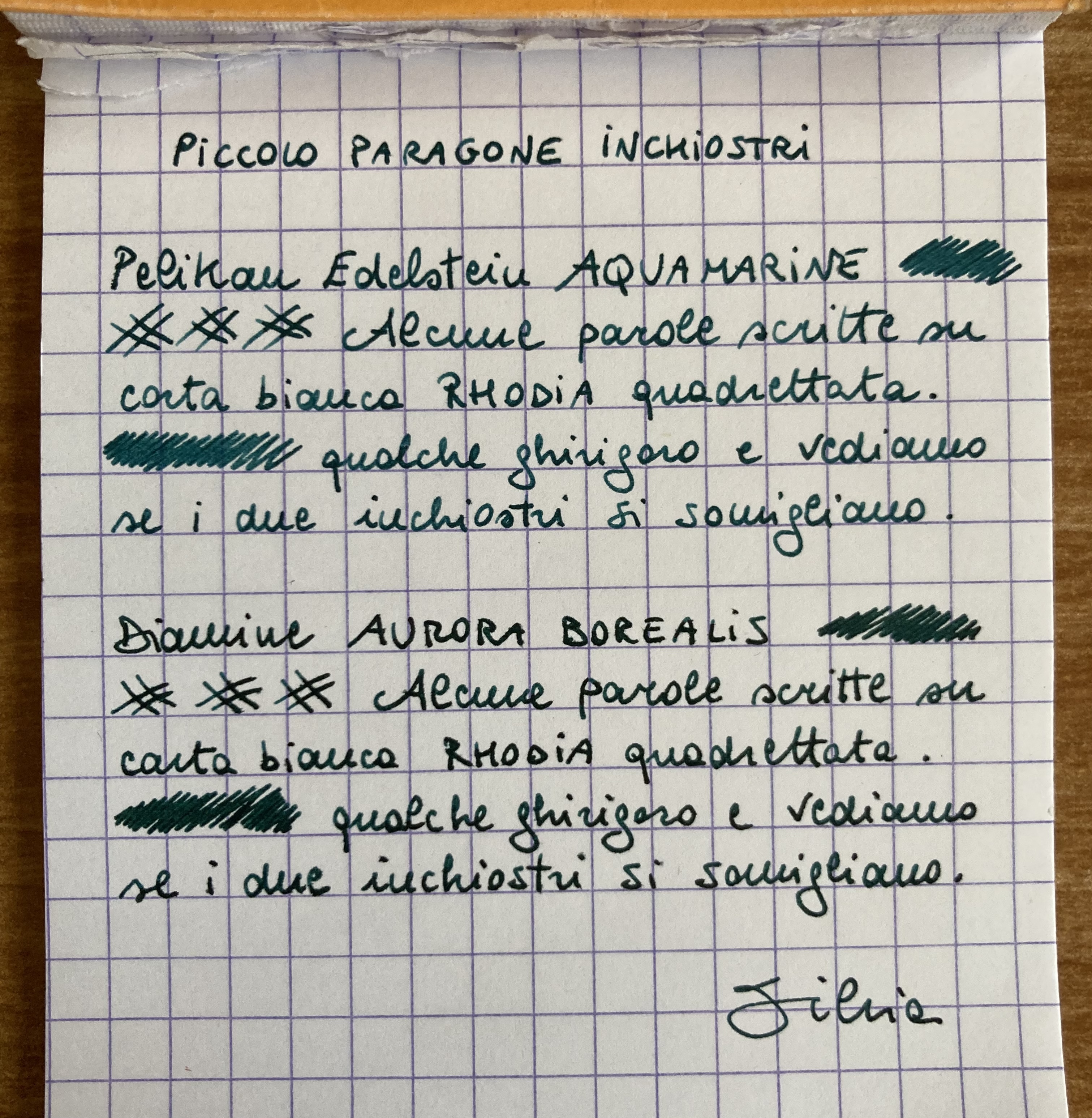da questa foto non sono uguali, e comunque trovo che Aurora Borealis sia un po' più fluido di Aquamarine quindi rilasciando più inchiostro, il colore risulta più intenso. Dalla prova che avevo fatto per me e per rispondere ad Angelo ieri sera, a me sembravano molto più simili tra loro, rispetto alla tua foto. Strano... Va be' una foto in più da tenere in considerazione per i futuri acquirenti :thumbup:
