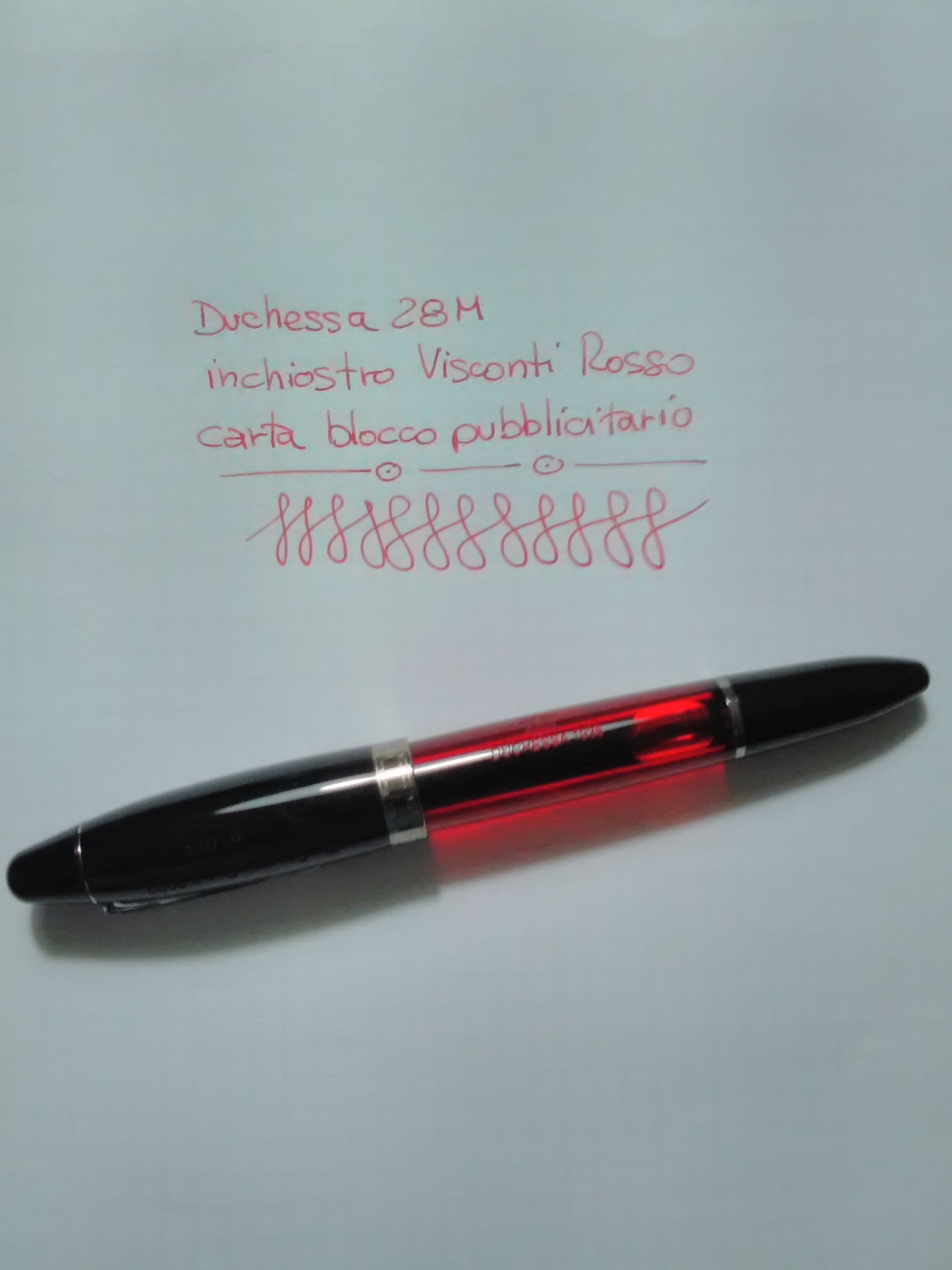 Caricato la Duchessa 28M con l'inchiostro Visconti Rosso (che poi rosso rosso non è), non noto differenze significative rispetto agli altri provati fino ad ora.Penna rossa con inchiostro rosso, come vuolsi!