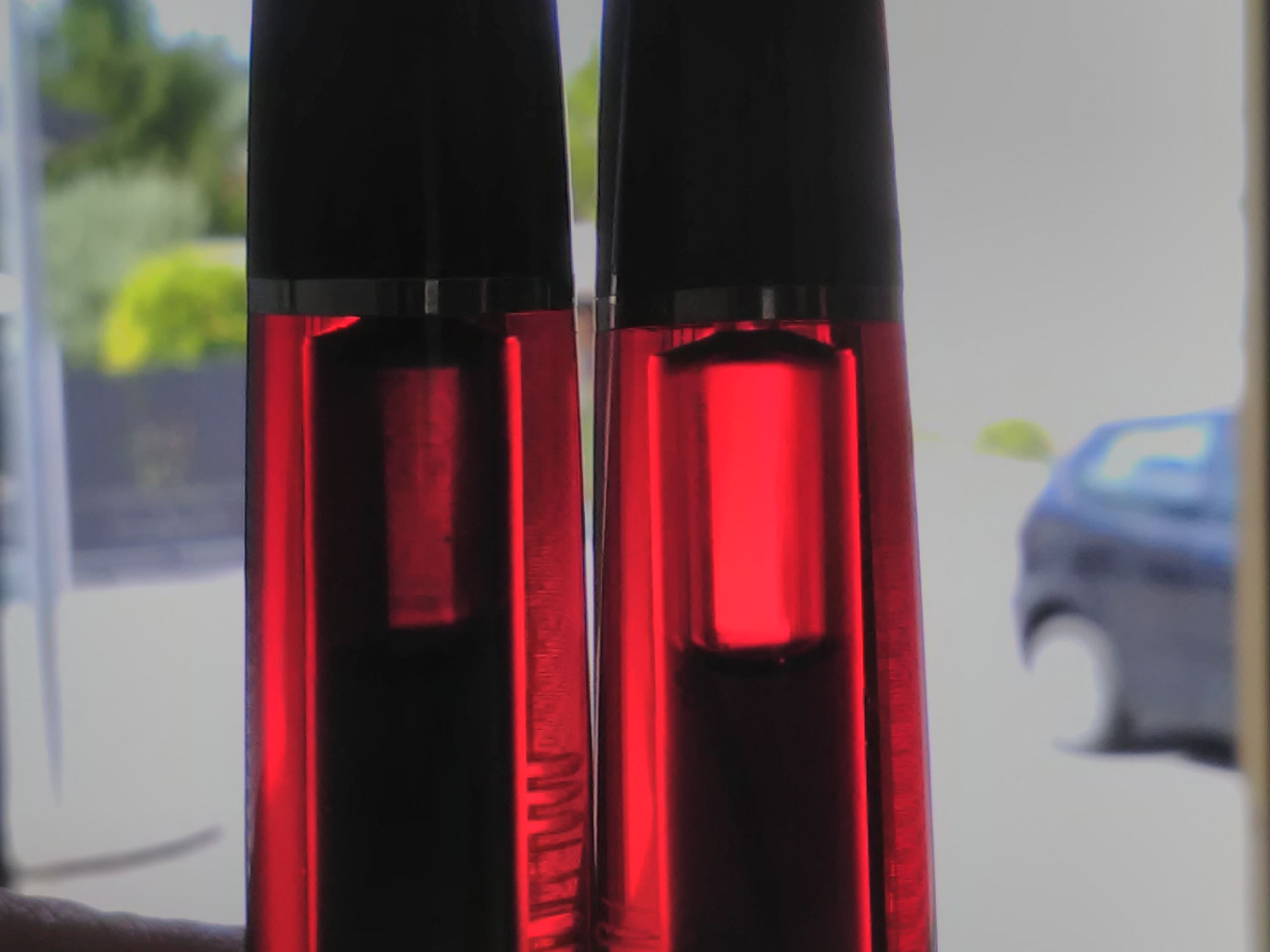 a sinistra con inchiostro Pelikan Edelstein, a destra con Visconti, con il primo devi aspettare molto senza raggiungere comunque la trasparenza della seconda che è immediata