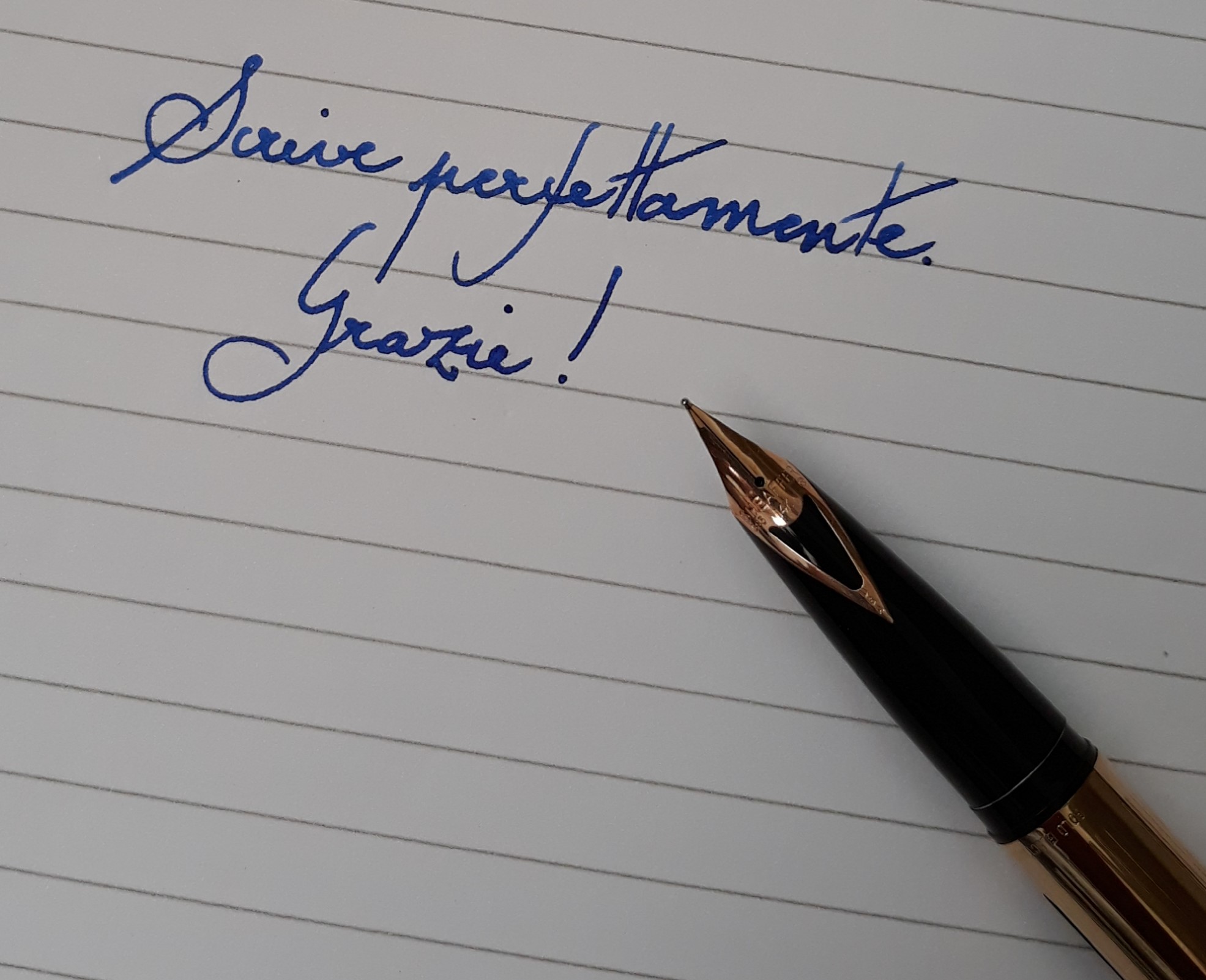 La stilografica è un perfetto strumento di scrittura: senza essere stata sottoposta ad alcun trattamento preventivo, inserita la cartuccia ha cominciato a scrivere prontamente, senza incertezze o difetti. La scorrevolezza della punta del pennino è piacevolissima ed il bilanciamento ottimo. La bellezza e l’eleganza del famoso pennino intarsiato, che Sheaffer introdusse nel 1959 per il modello Pen for Men e che a mio parere è imbattibile in termini estetici e d’eleganza, rende la scrittura ancora più piacevole.