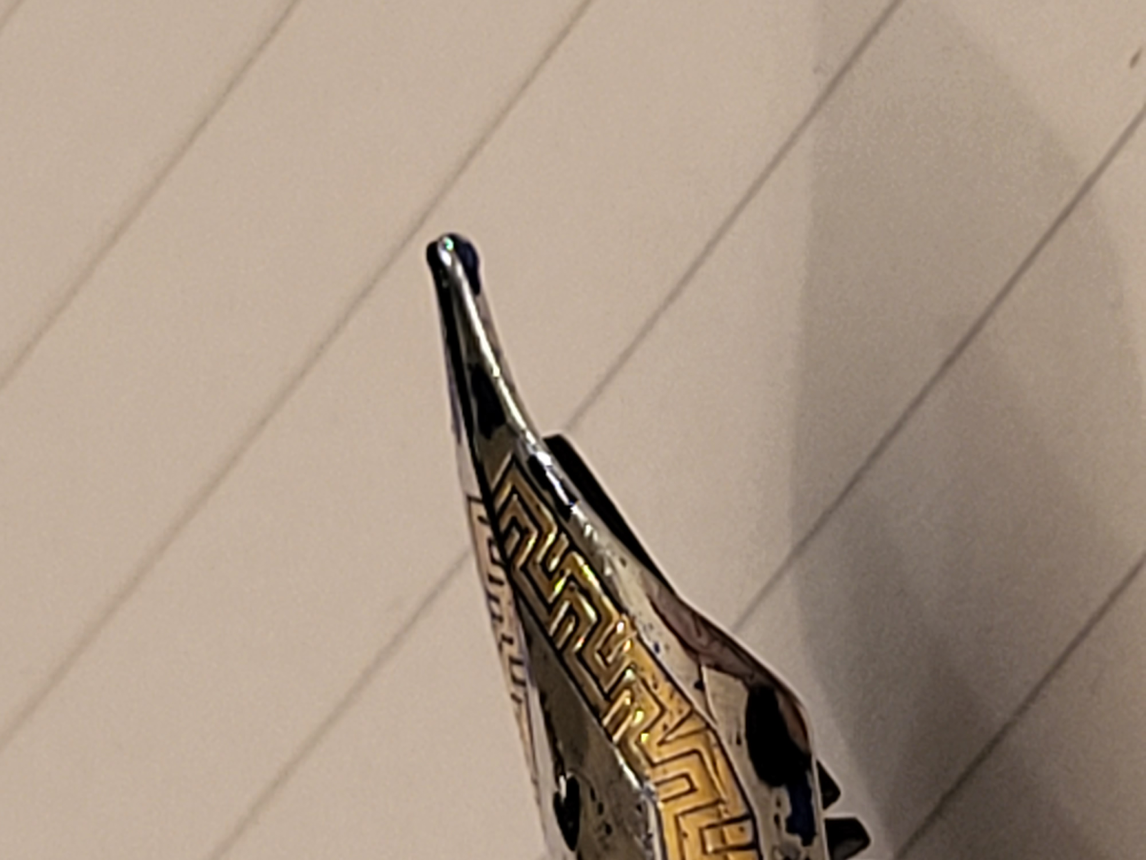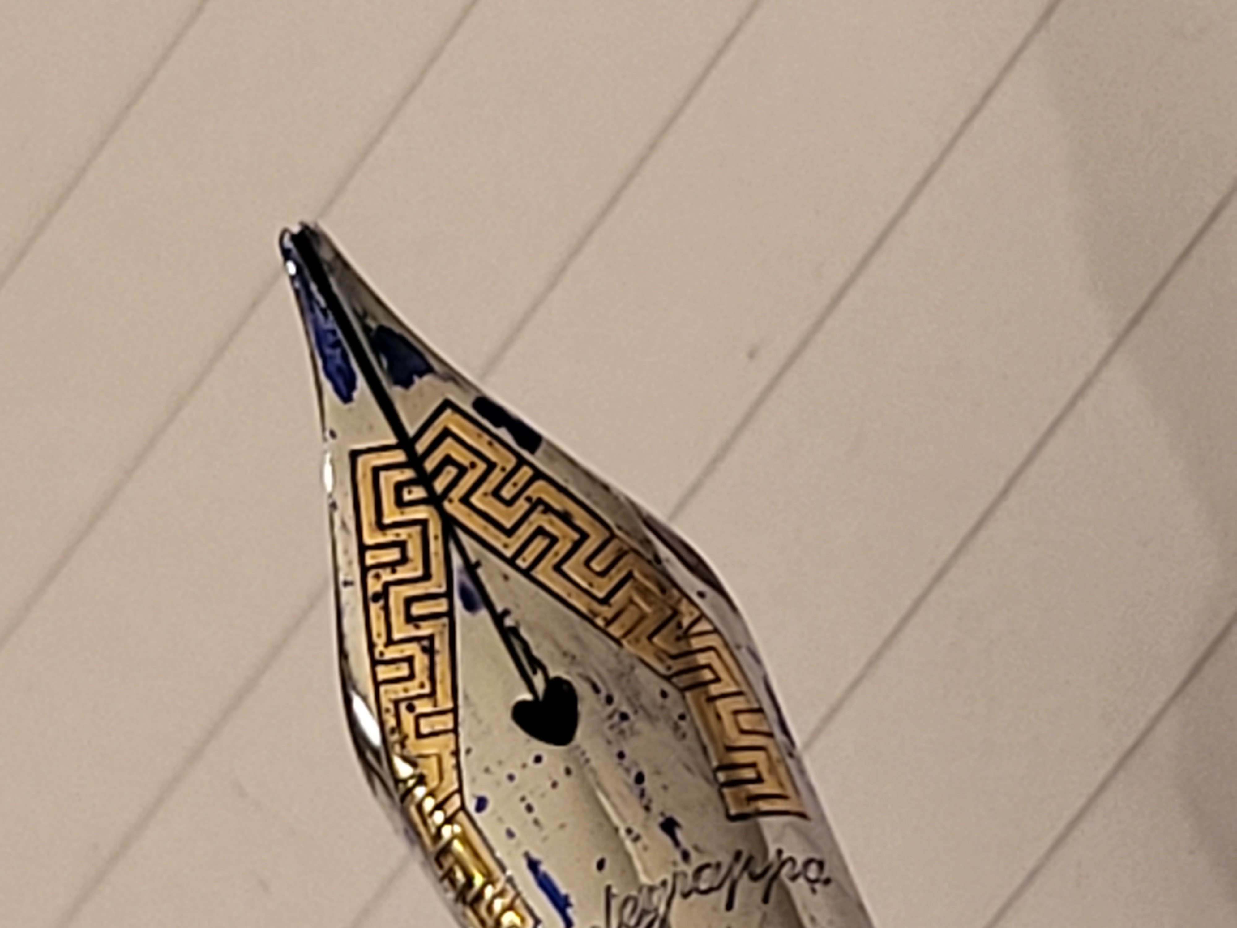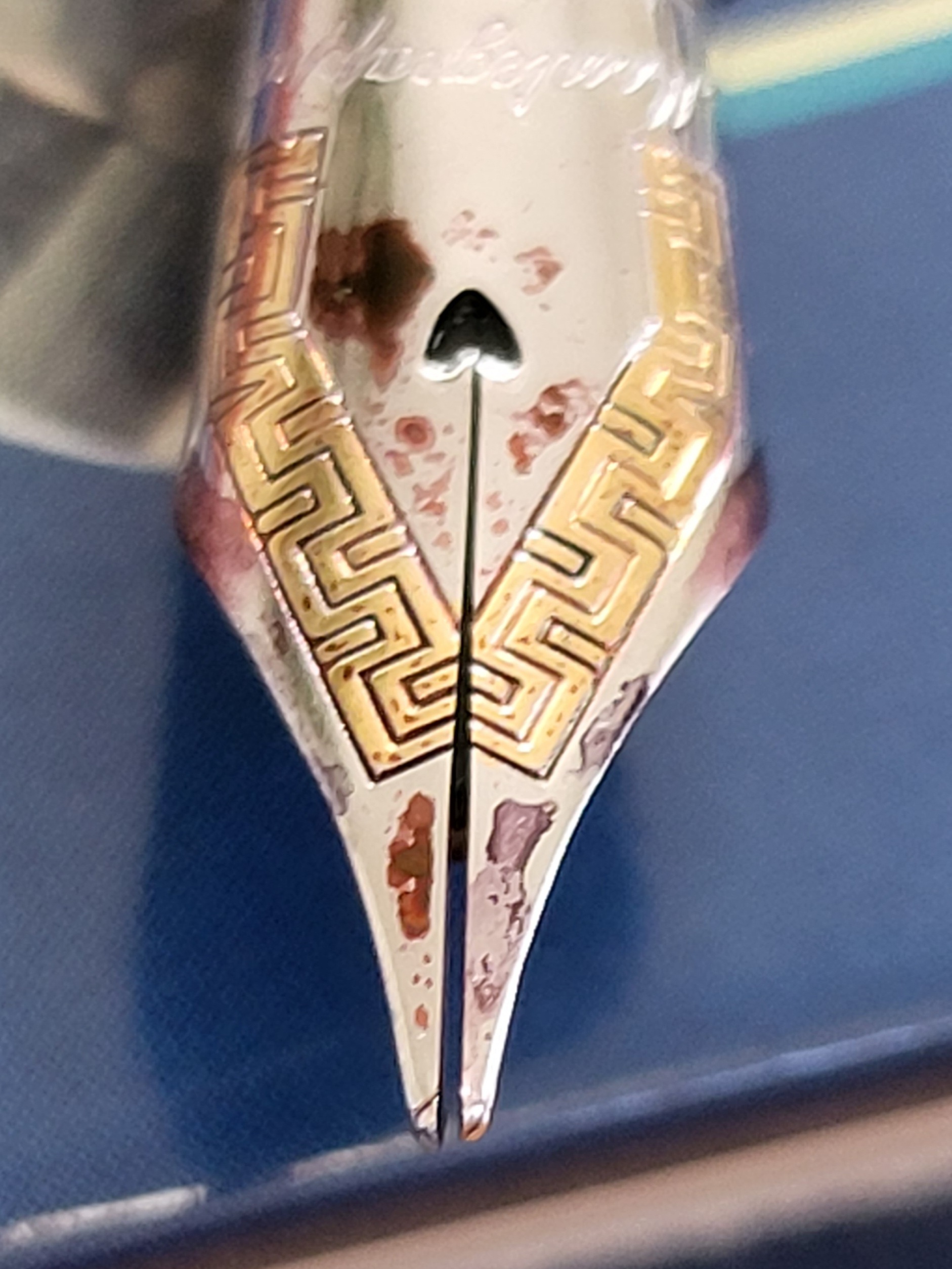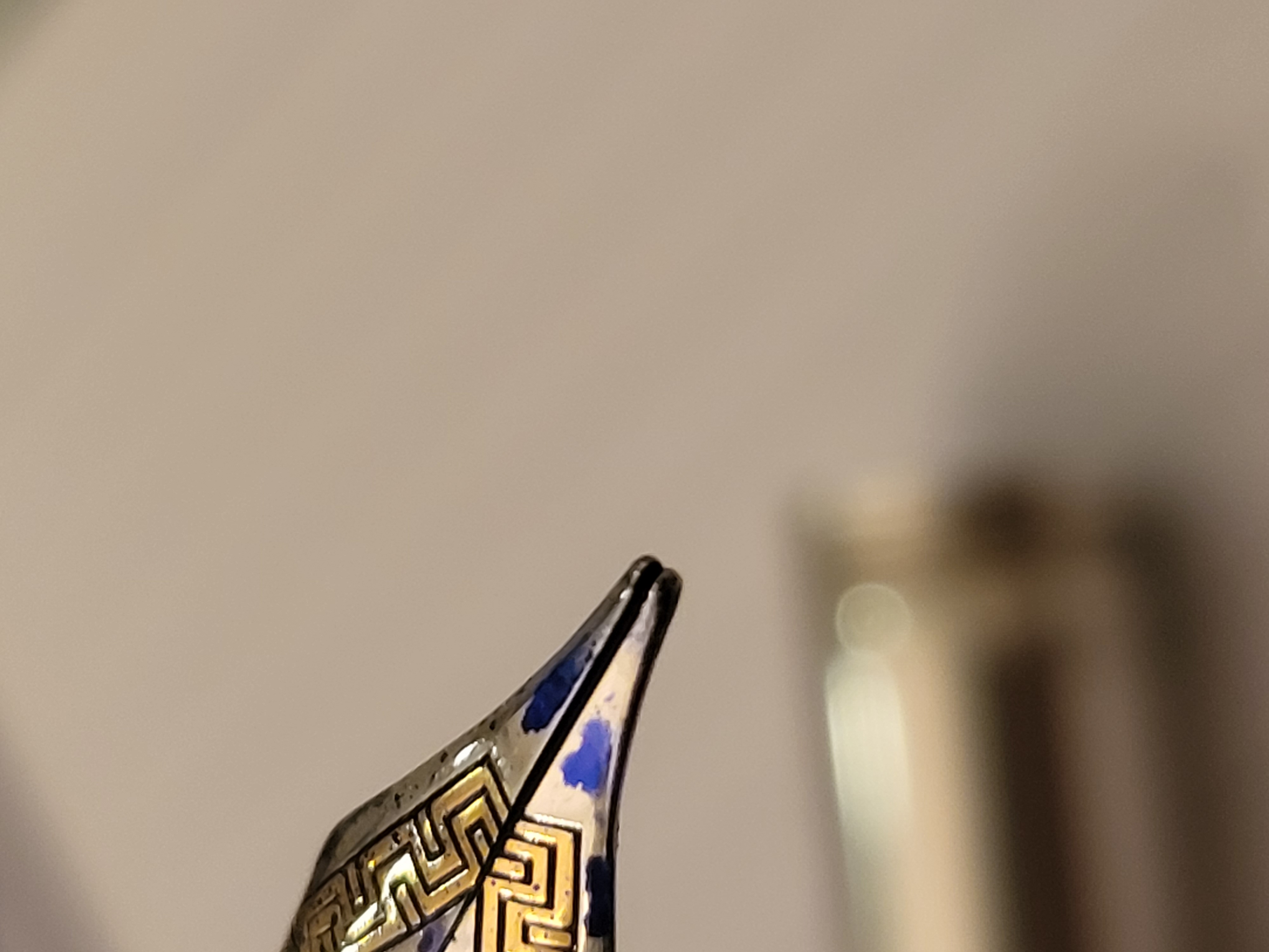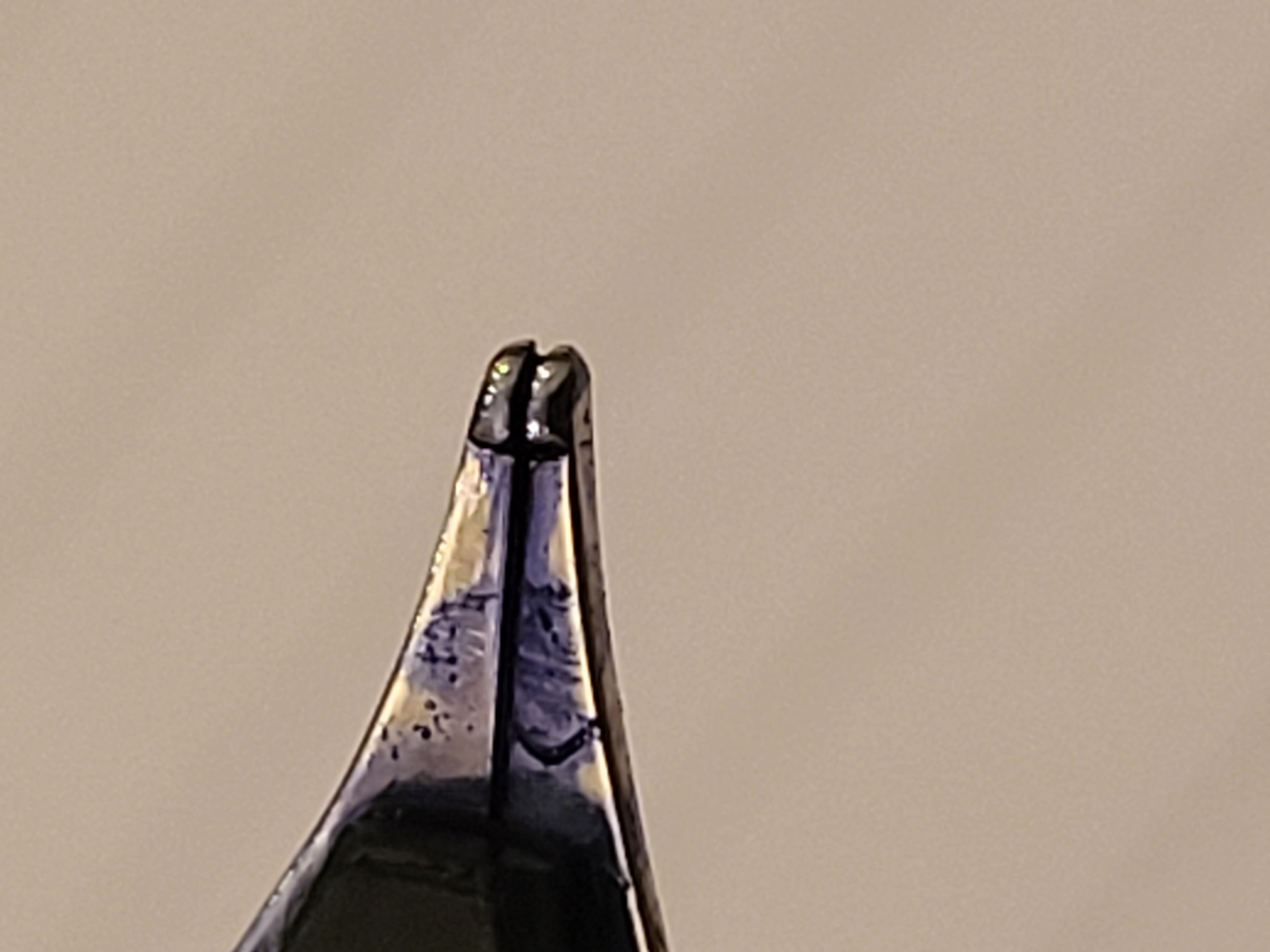 Grazie a tutti per i vostri consigli.Invierò la penna a qualcuno più esperto di me che possa rimuovere il pennino e lavorarci su.Come si dice che un po' di conoscenza è una cosa pericolosa quindi smetterò di cercare di risolvere il problema.Per il vostro interesse ho incluso altre 3 foto con didascalie.