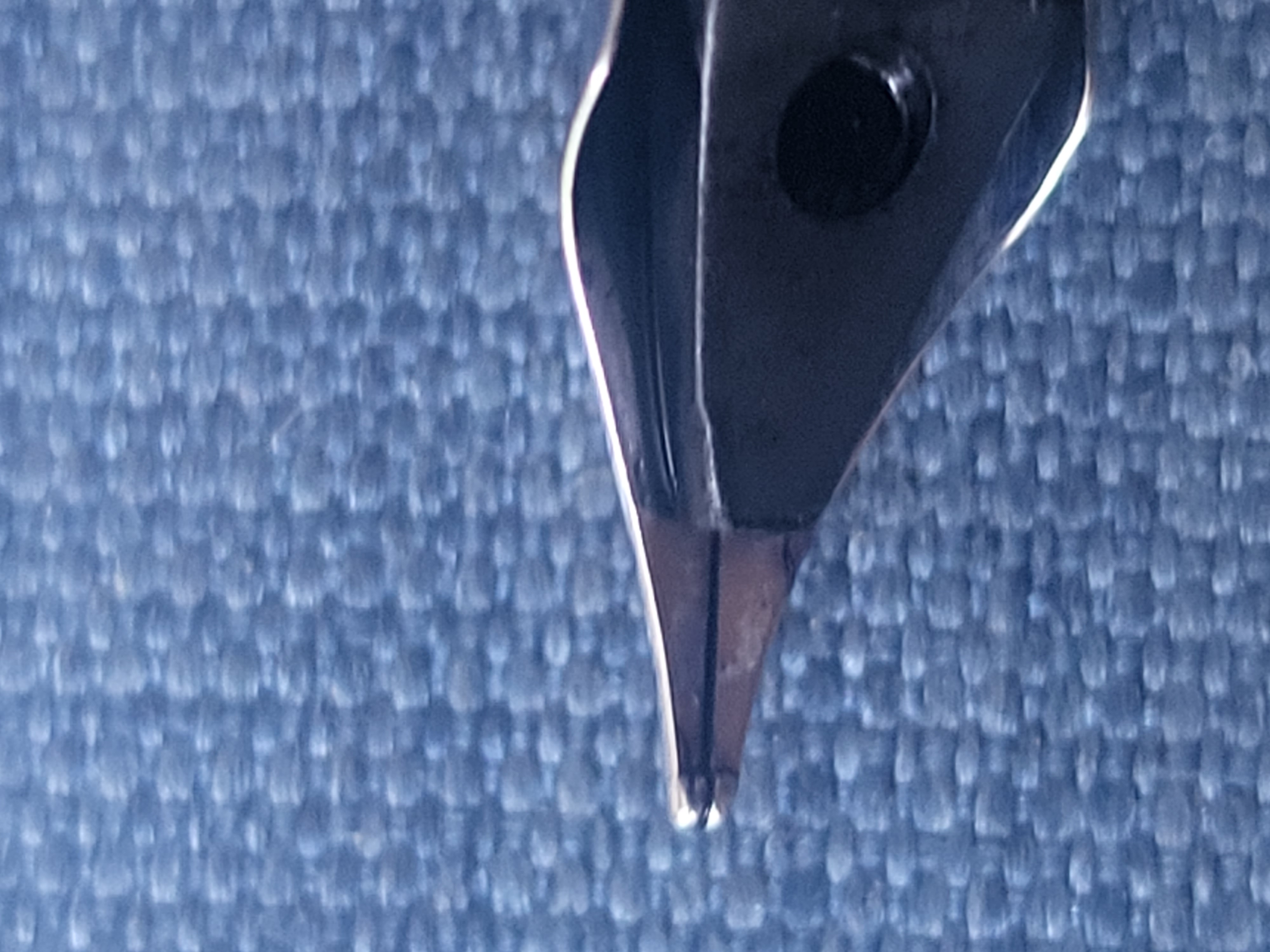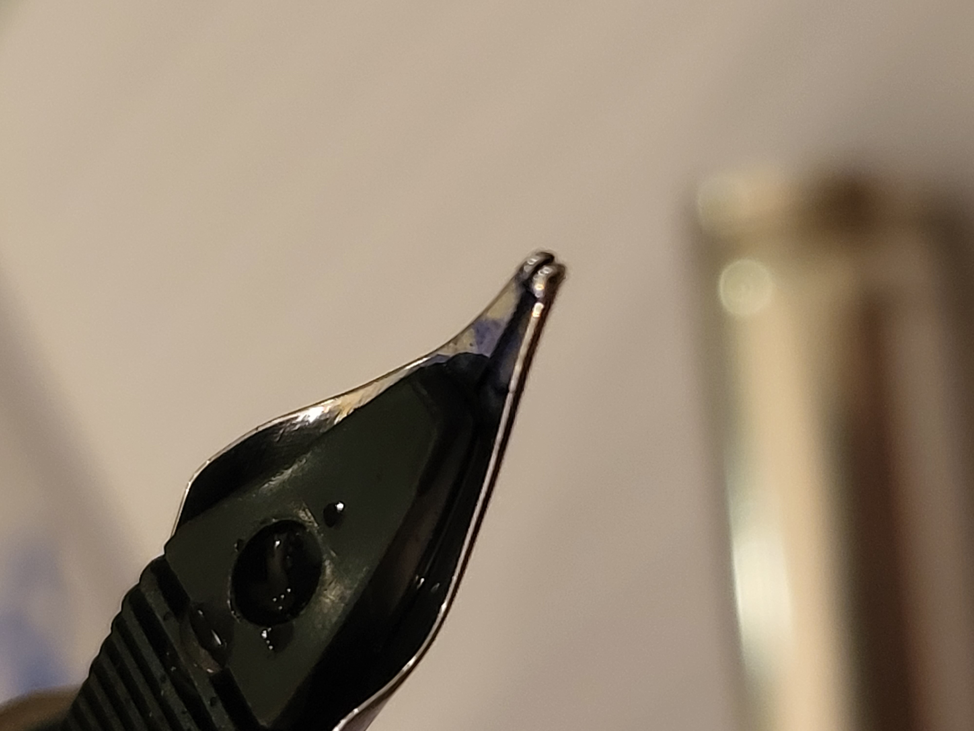 Comunque di solito quando un pennino subisce un tale danno i rebbi oltre ad allargare lo spazio tra di loro si staccano anche dall'alimentatore (cioè si sollevano leggermente verso l'alto) in questo caso l'inchiostro fatica ad arrivare in modo normale al pennino.