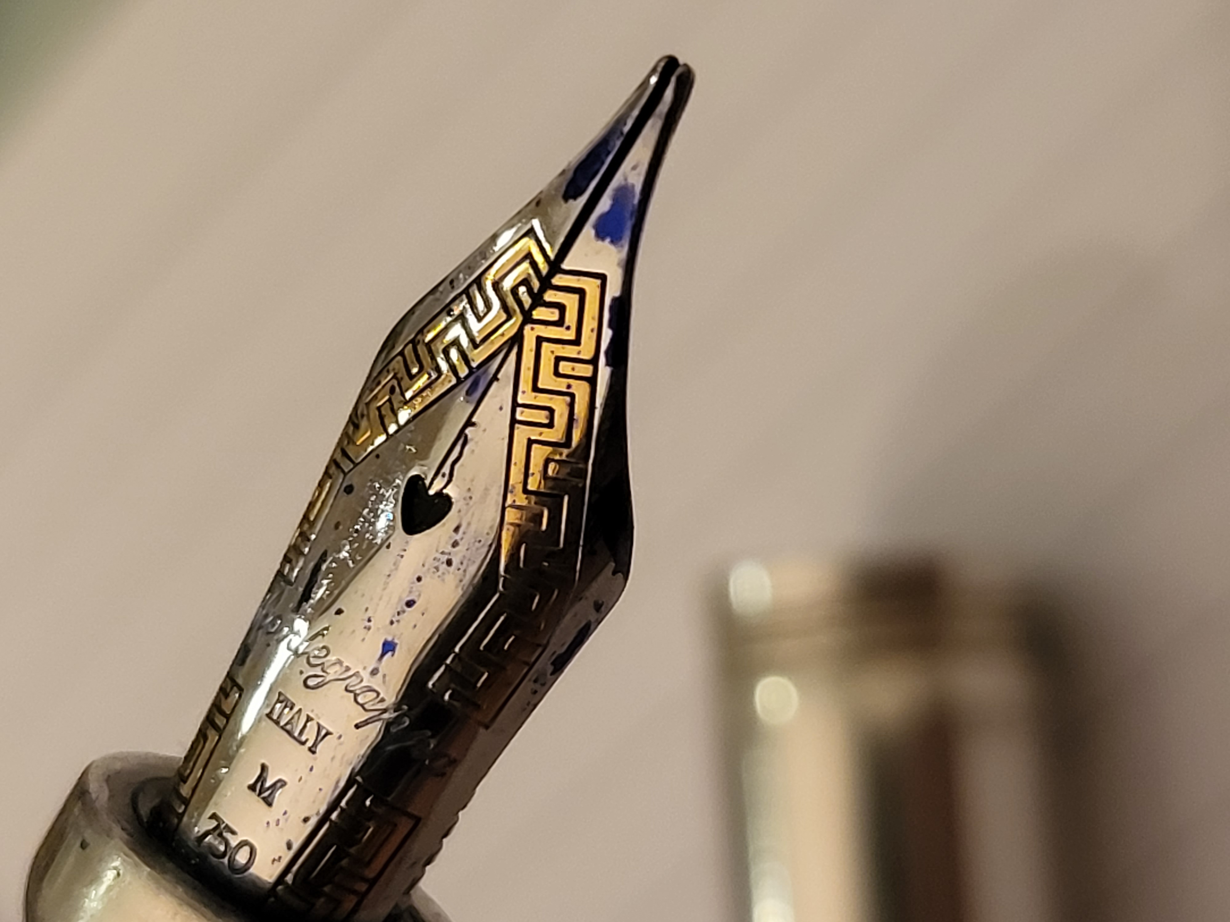 Cari amici del forum,questa settimana ho comprato una Montegrappa Serie 300 Reminiscence (credo).Adoro la penna ma non ho mai avuto così tanti problemi con il pennino.Penso che dovrò trovare un nibmeister,ecco il problema.Se allago l'alimentazione allora scrive bene,ma poi il pennino alla fine si secca.Ho aggiunto delle foto. La prima foto mostra il pennino quando l'ho ricevuto. Dopo aver riallineato i rebbi e averli avvicinati riesco a scrivere 2 o 3 righe ma poi niente! Ho pulito accuratamente la penna quando è arrivata. Se qualcuno ha un suggerimento da darmi ne sarei molto grato.Grazie.