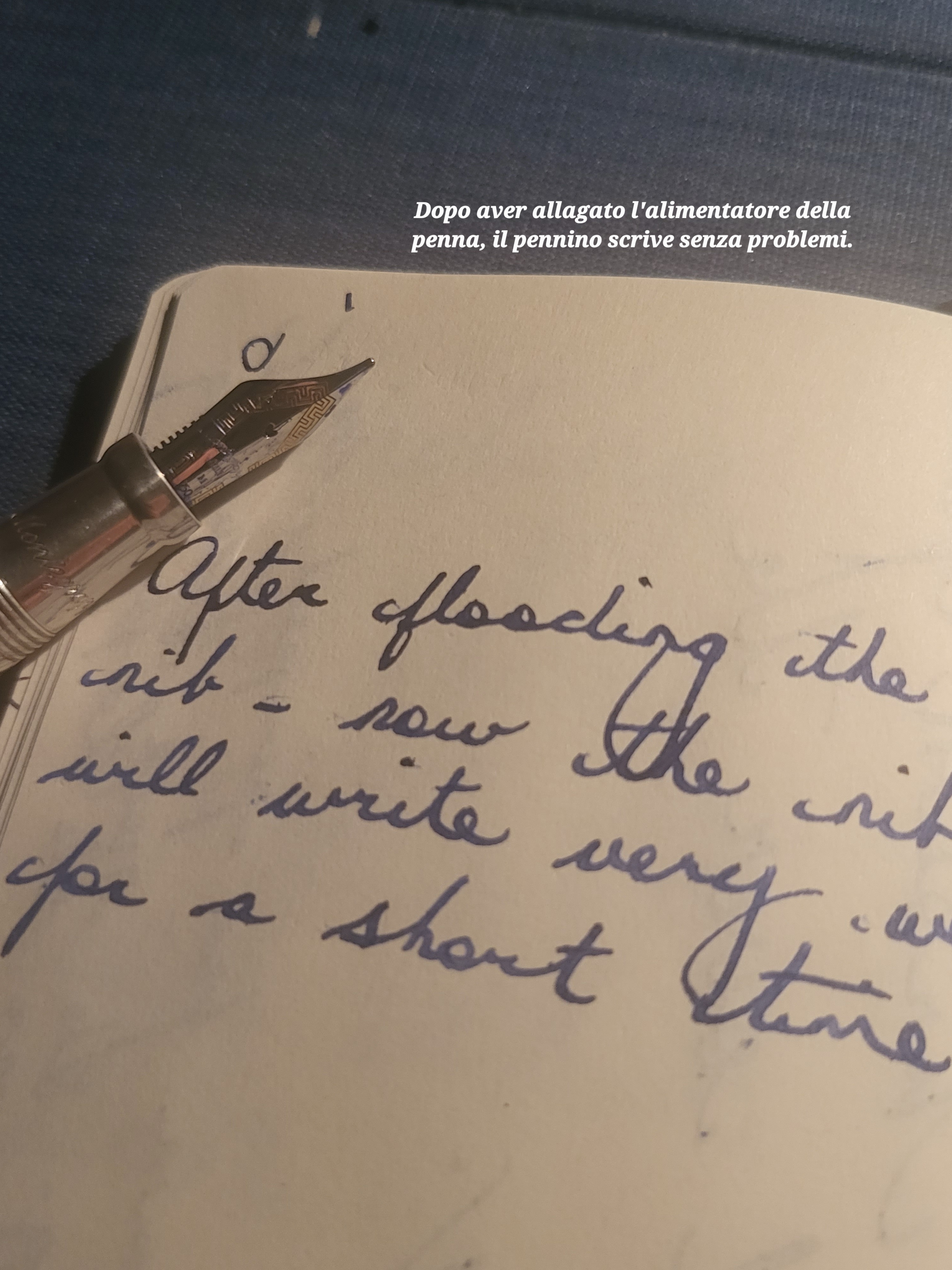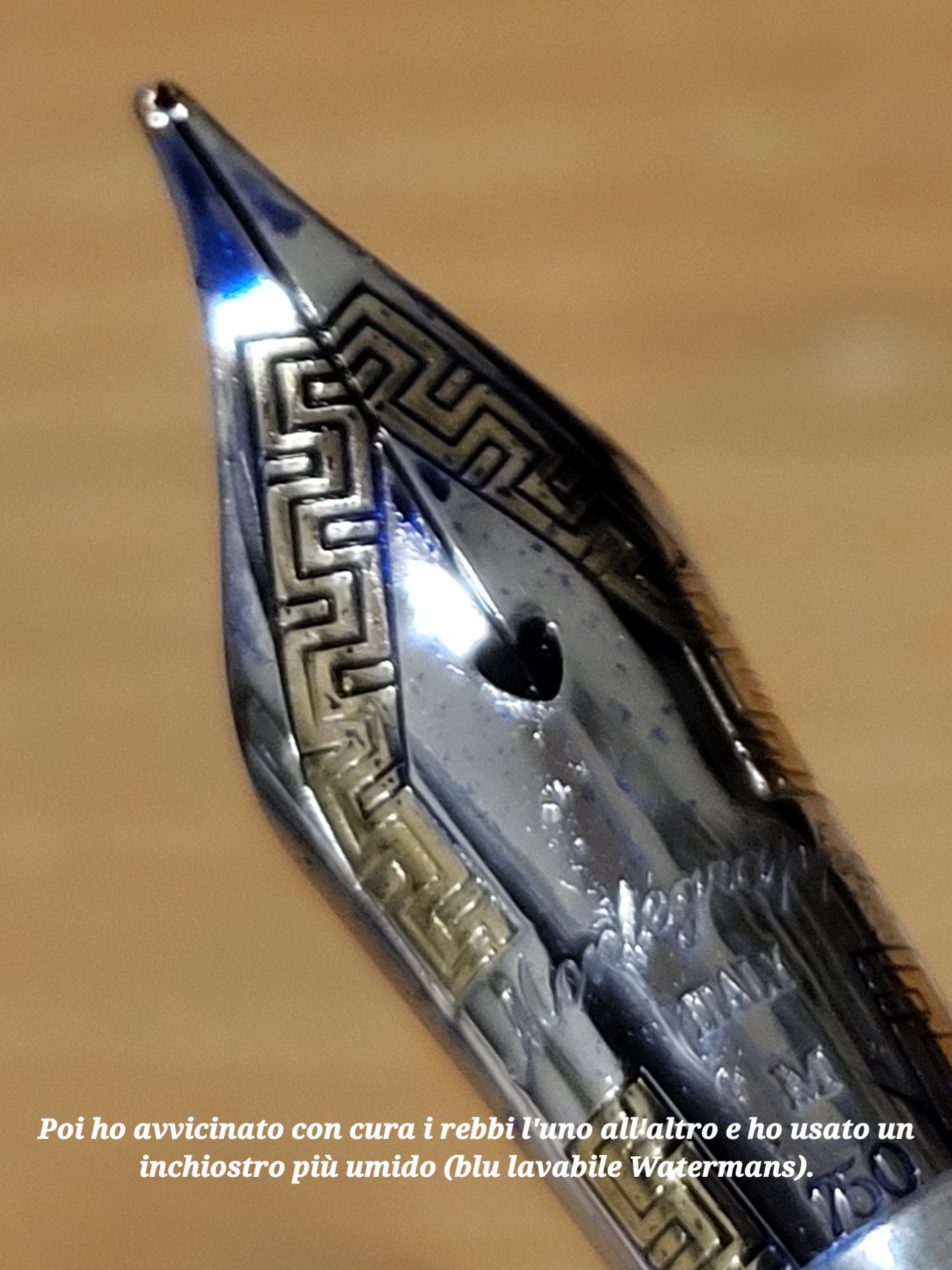 Se il distacco è poco l'inchiostro arriva in punta, ma appena si scrive il peso della mano fa sollevare i rebbi quel tanto vhe basta da staccarli del tutto dal canale di alimentazione e quindi dopo quslche lettera non scrive più, se si scrive in reverse (tenendo il pennino ruotato di 180• invece funziona tutto.