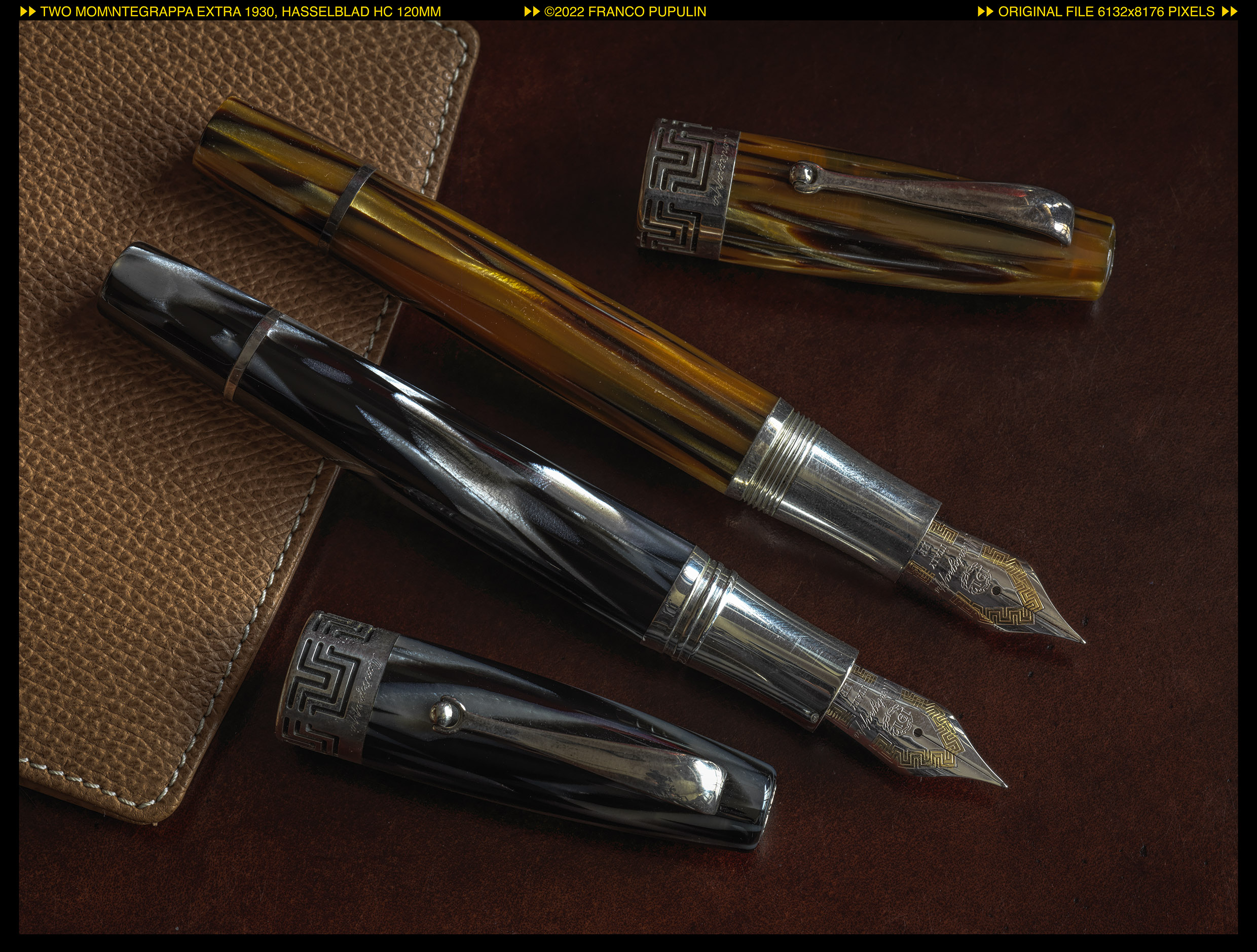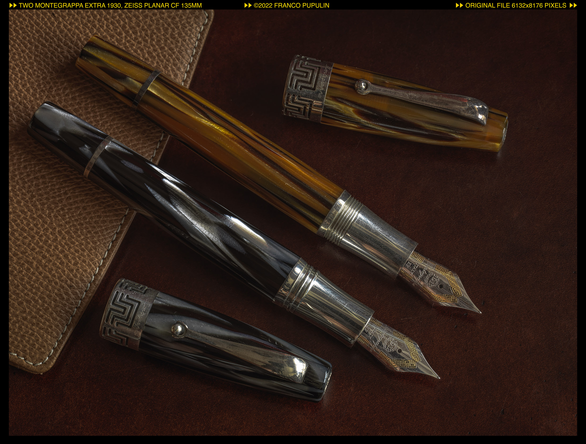 Vi presento i risultati qui sotto, con due riprese quasi identiche (le due lenti hanno lunghezza focale diversa e dunque una prospettiva leggermente differente e ottengono lo stesso ingrandimento sul sensore a una distanza distinta) di due penne Montegrappa Extra 1930, co in loro bei pennini extra-fini finemente cesellati.
