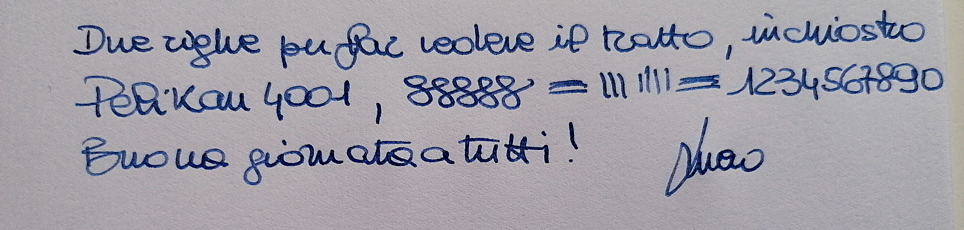 Ora è passata una settimana "dalla cura" e posso confermare che mi è andata bene, la penna lucidata ha conservato livrea e finiture in ottimo stato, scrive sempre e subito, tratto tra F e M che a me piace molto, pennino con piccole ossidazioni sul dorso ma scivola sulla carta che è una meraviglia. :D