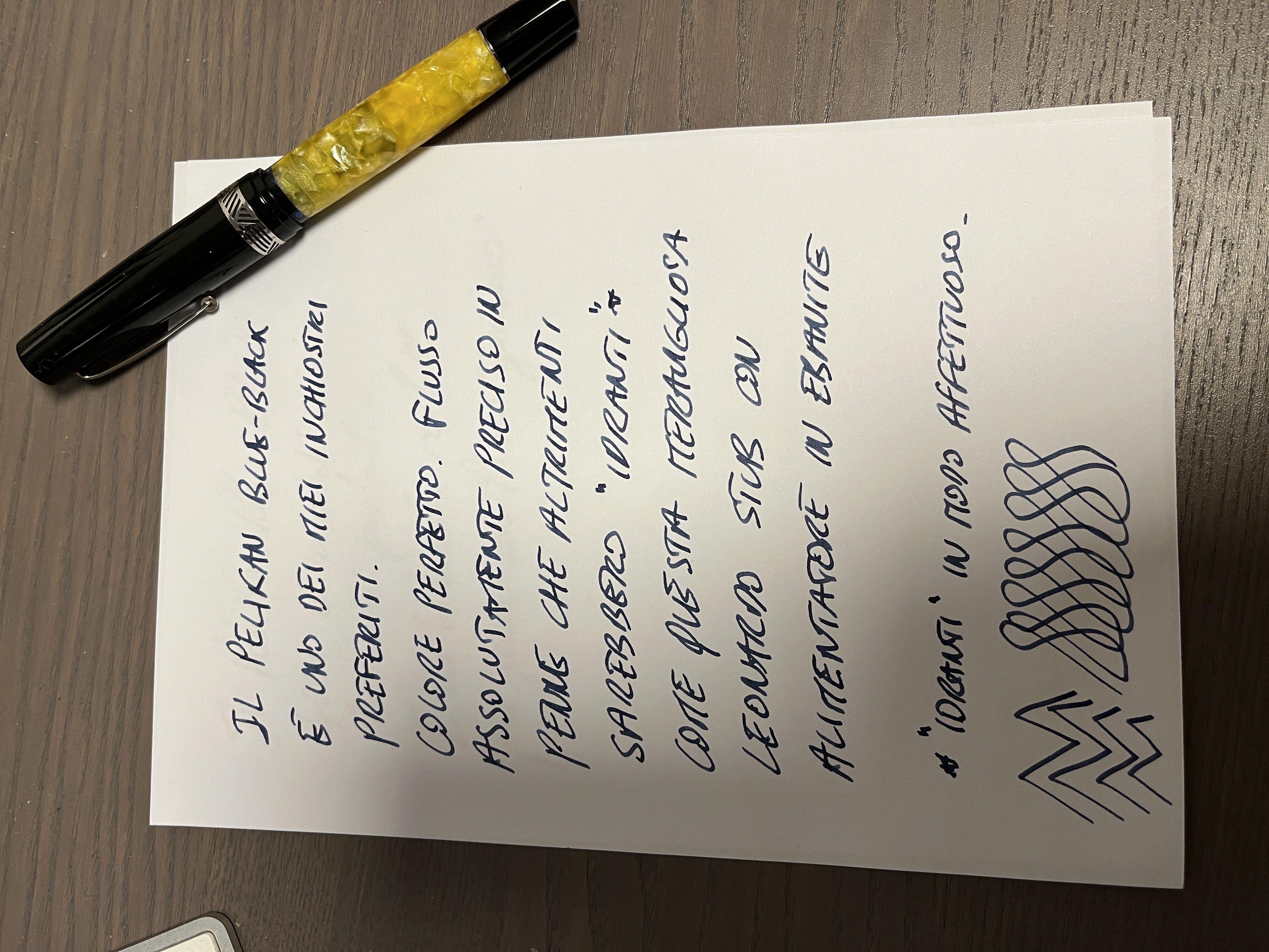 Prima prova del Blue Black in sostituzione del Royal Blue 4001 sempre Pelikan su Aurora 88 Nizzoli e devo dire che la penna, per me che son mancino, non ha un flusso eccessivo e non rischio le sbavature che col Royal erano quotidiane...