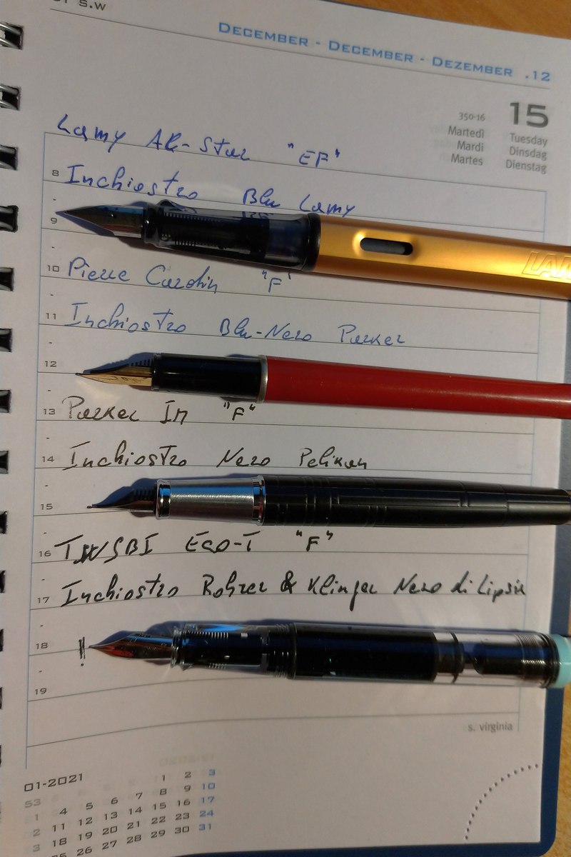 ieri mi è arrivata la ECO-T con pennino F e il Nero di Lipsia, entrambi mai provati prima e mai visti all'opera dal vivo. Ho inchiostrato la penna e provato a scrivere ma con disappunto ho notato che mi lascia un segno tutto tranne che Fine, sembra più un M , forse una misura più grande ancora. La carta, ammetto, non è un granché , faccio esercizi di calligrafia su un'agenda che non le altre penne non è poi così male ma stavolta proprio non ci siamo.