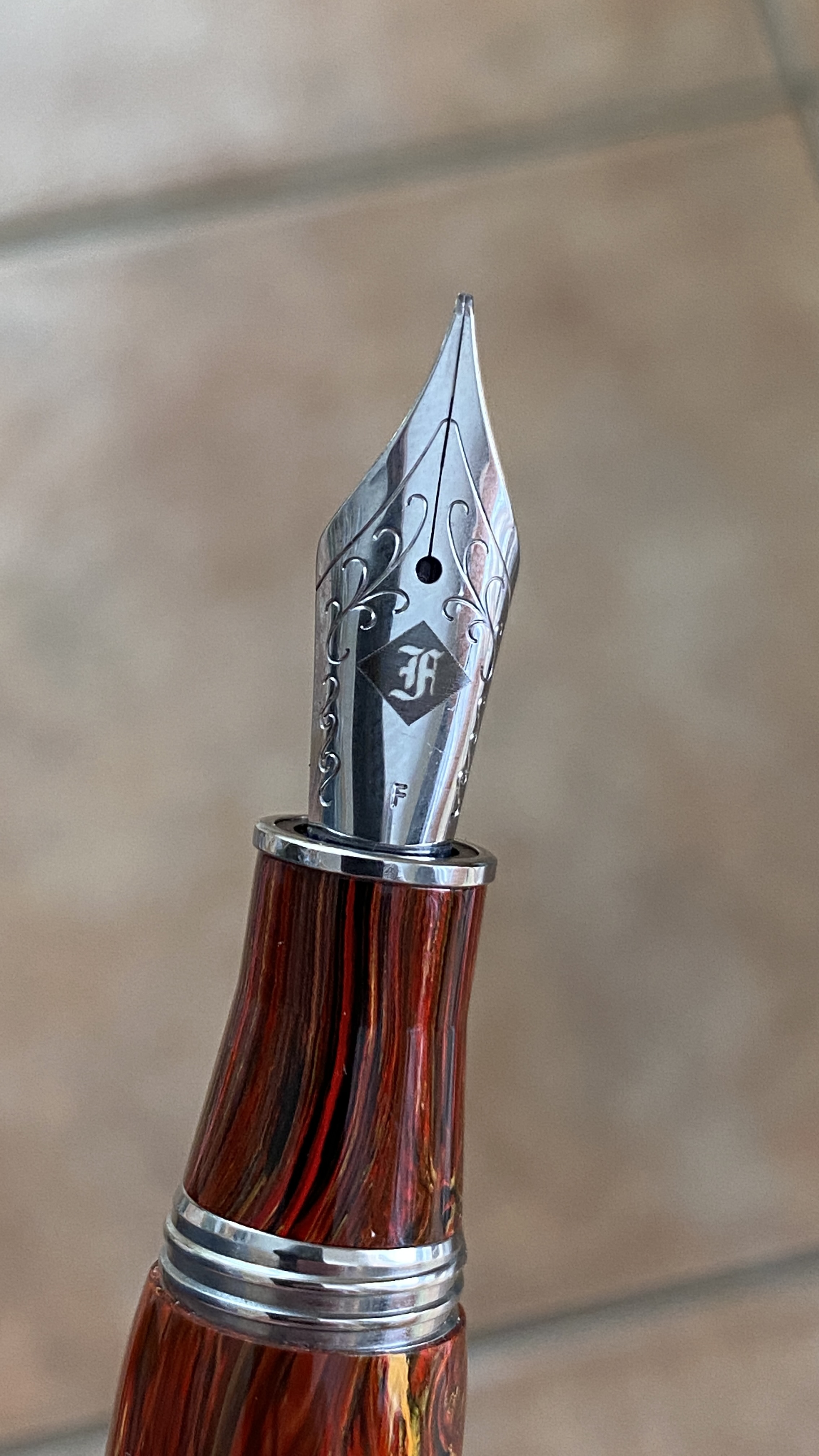 Ho da poco acquistato una Montegrappa Mia Flaming Heart, bellissima, le foto non rendono giustizia a questa resina, con pennino M, io di solito preferisco il fine ma questa l’ho presa in offerta e c’era solo M. Il fatto è che si tratta di un M abbondante con alcuni inchiostri e mooolto abbondante con altri. Fin ora la Starwalker è stata la penna con tratto M più abbondante che abbia mai provato, ma questa la batte di gran lunga. Da quello che ho capito, monta un gruppo scrittura Jowo personalizzato. Confrontandolo con quello della Franklin Christoph sembrano uguali nelle dimensioni eccezion fatta per l’anellino di metallo a ridosso del pennino. Un gentile utente mi ha informato in un altra discussione che in un noto negozio fiorentino vendono il gruppo pennino per la penna in questione ma è senza anellino che dovrei riciclare dalla mia . Sapete dirmi come posso rimuovere tale anellino? Grazie :wave: