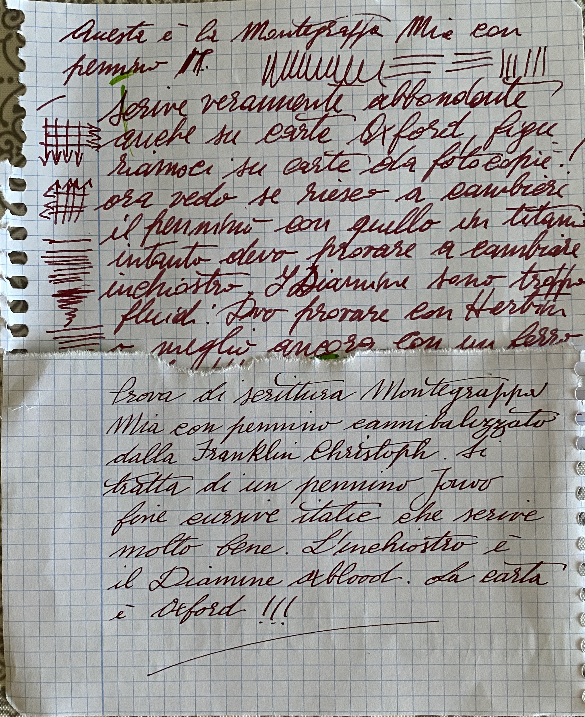 Operazione riuscita grazie, in attesa di comprare un pennino Montegrappa, ho trapiantato quello della FC che tra l’altro è un signor pennino fine cursive italic realizzato da un nib master che lavora per la ditta americana e che scrive molto bene anche se ha un feedback non per tutti :wave: