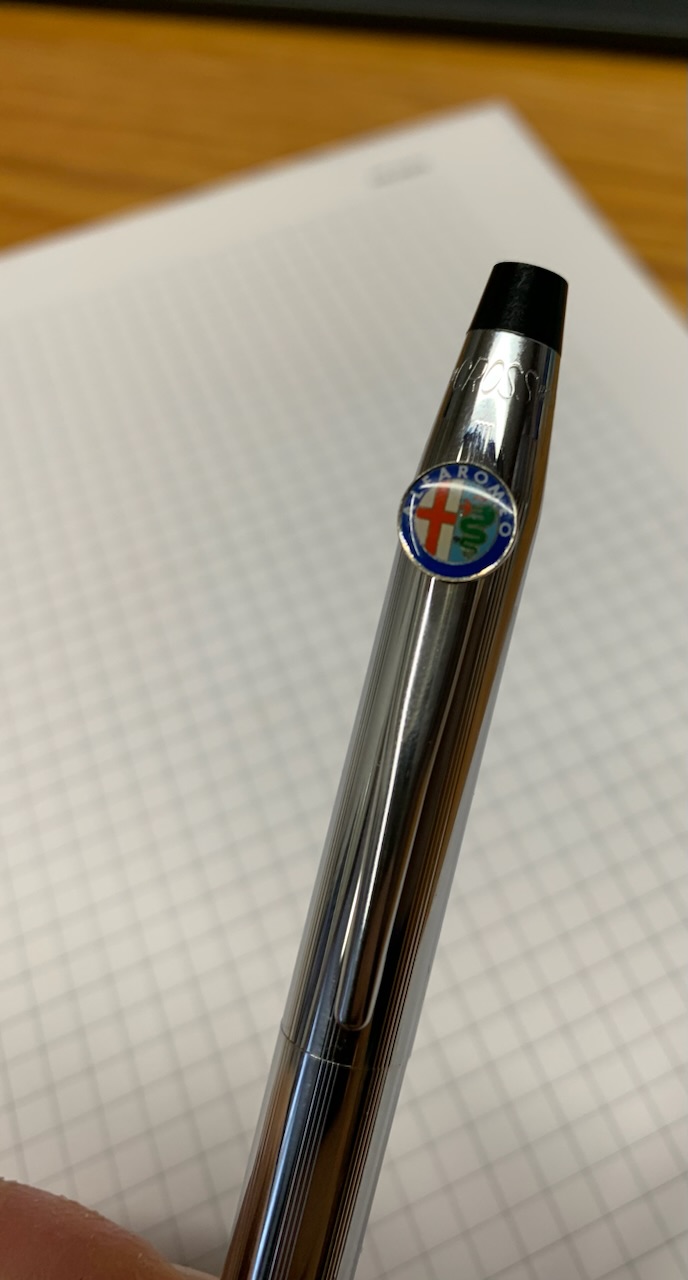 Svuotando una soffitta ho ritrovato un cassetto pieno di "gadget" promozionali AlfaRomeo degli anni 70-80 (i genitori dei proprietari lavoravano in AlfaRomeo), tra quadretti, gagliardetti, portachiavi etc. Ho trovato anche un paio di penne.