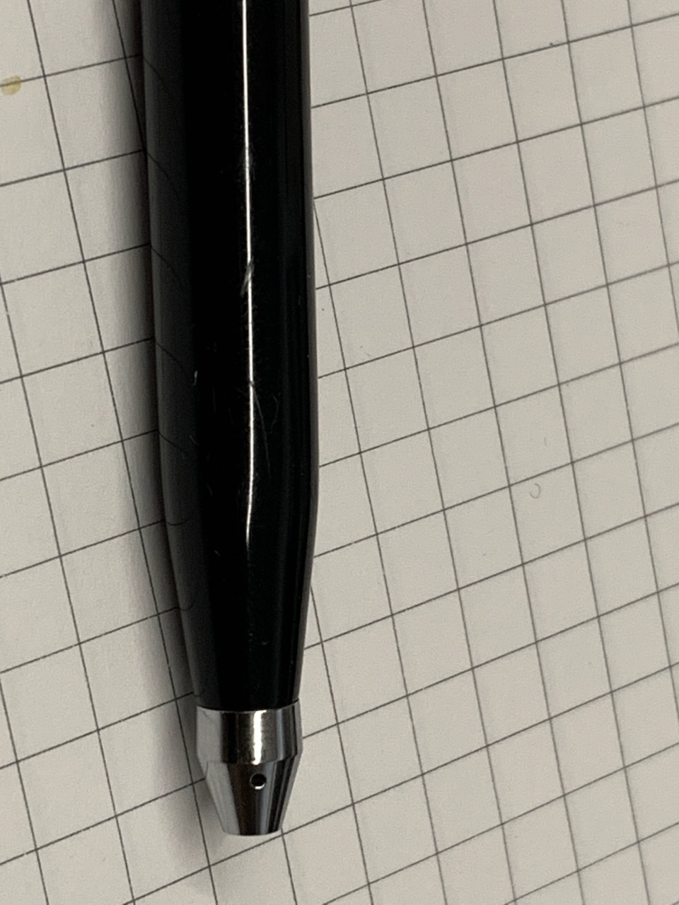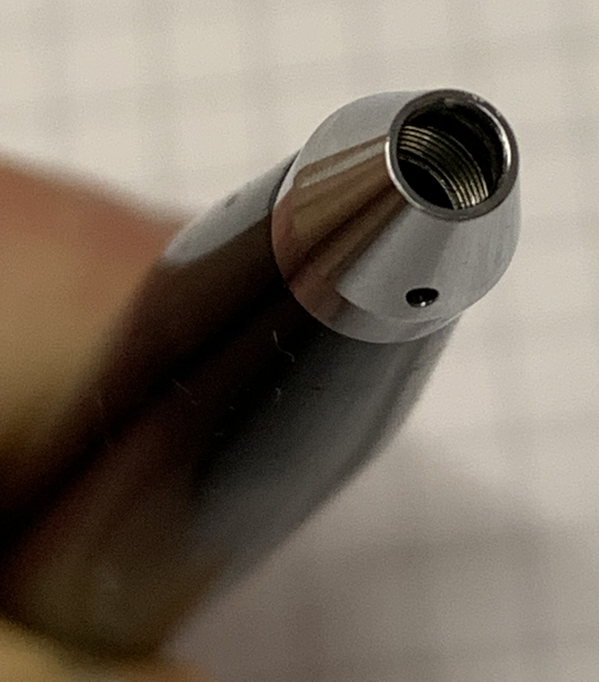 In questo invece il puntale è un pezzo unico di metallo e non si muove, il fusto non presenta meccanismi esterni (ma c'è una molla all'interno in coda, si sente il rumore) e il puntale ha una filettatura al suo interno, oltre a quel misterioso buchino.