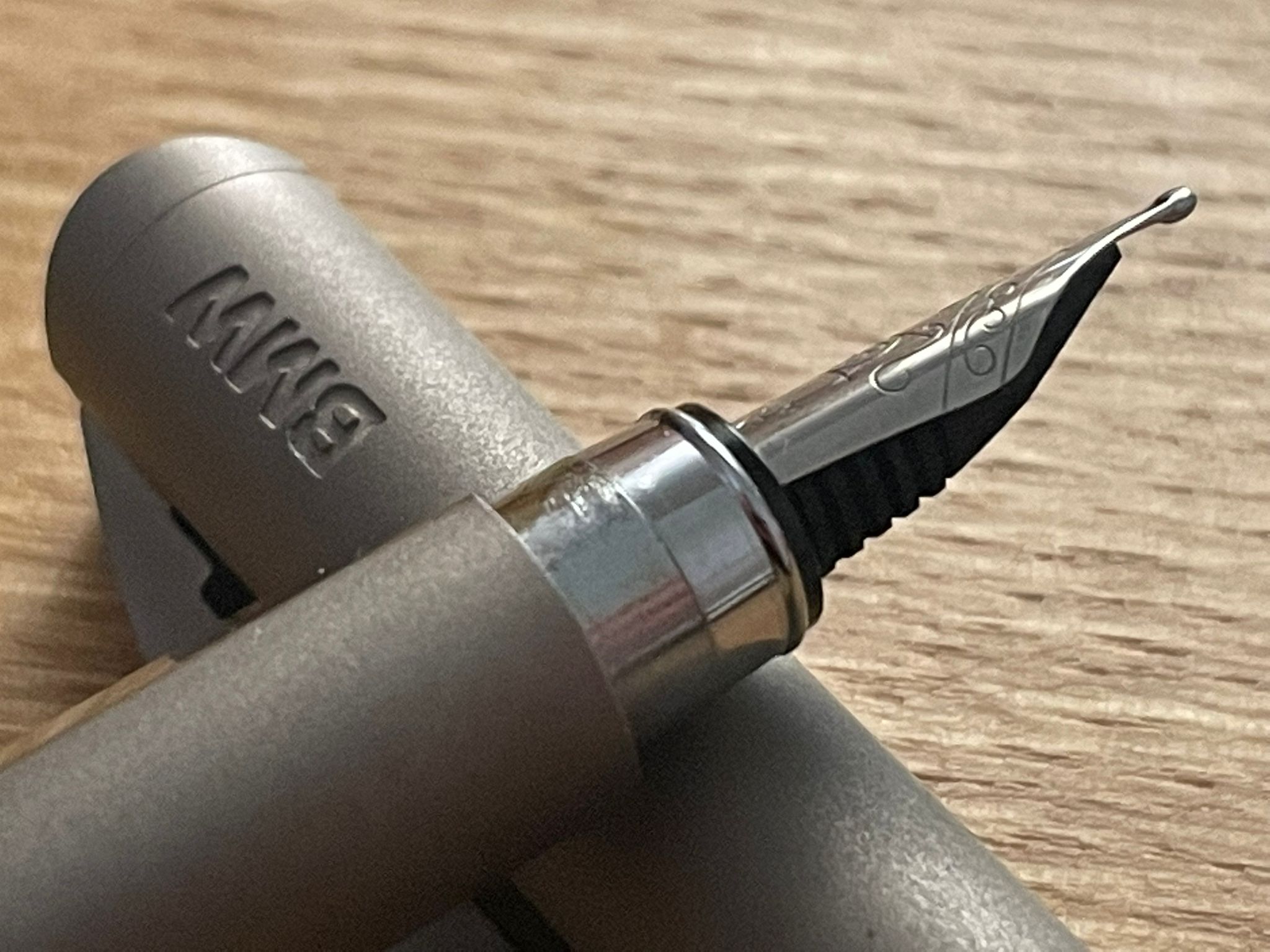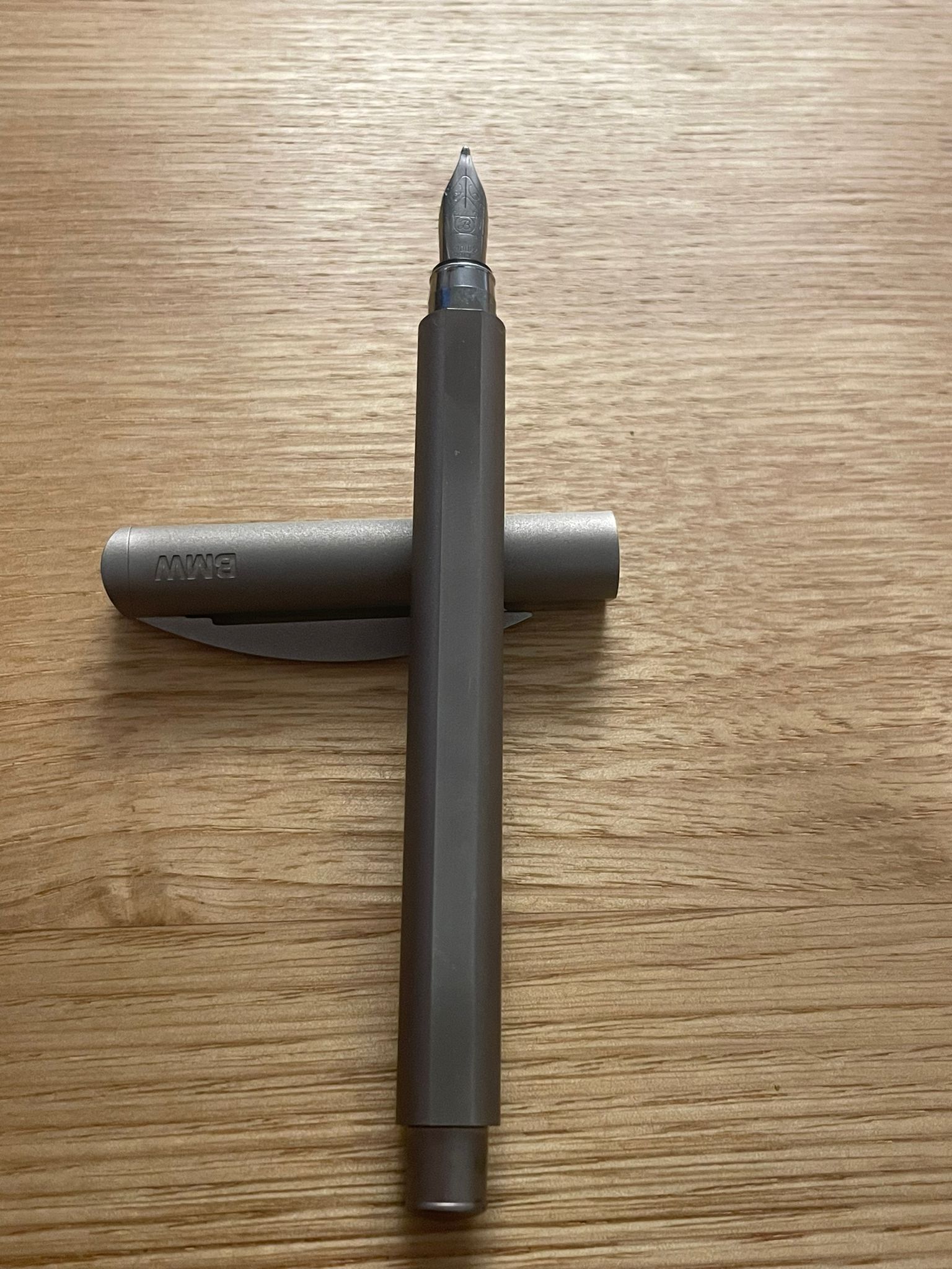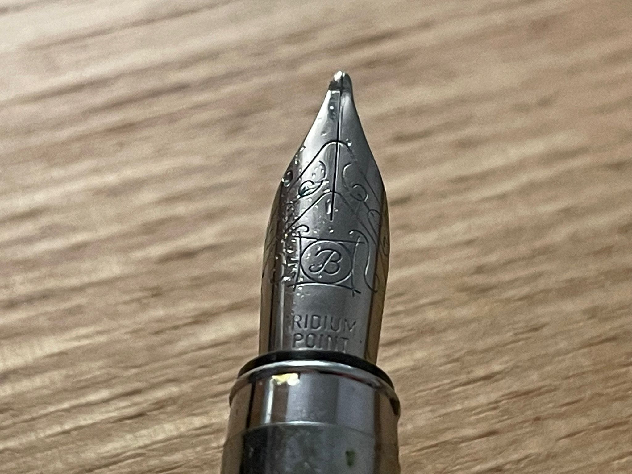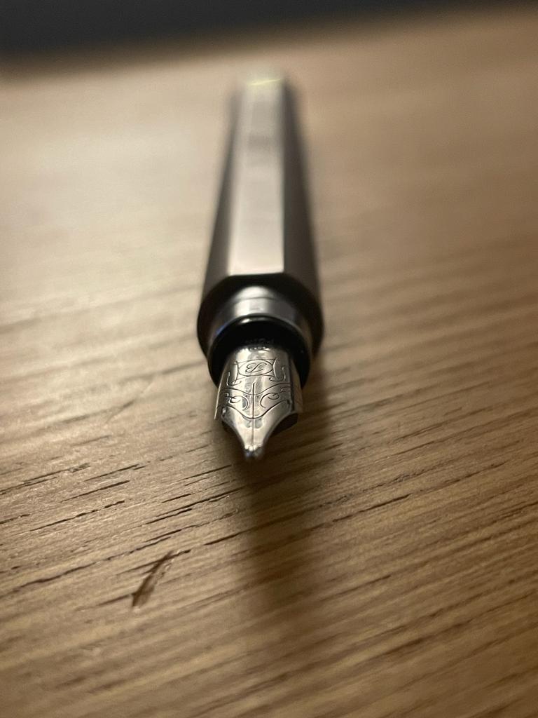 Si tratta di un tratto B. Il pennino mi ha ricordato quelli Faber Castell, sia alla vista che come esperienza di scrittura. Sembrerebbe essere acciaio, non particolarmente flessibile ma molto liscio e anche decentemente elastico