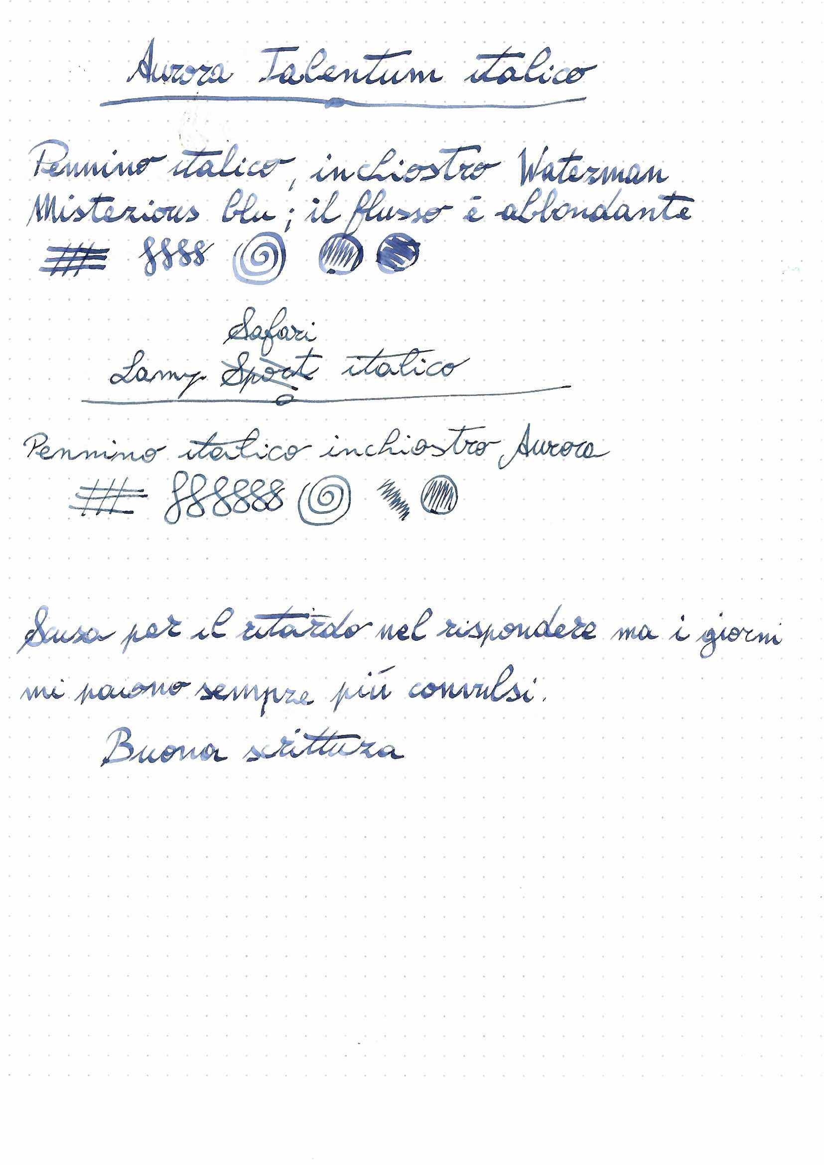 Ecco lo scarabocchio con Aurora Talentum pennino italicoArchipat ha scritto: ↑domenica 13 novembre 2022, 12:37 [*]Certo, grazie!Pippo ha scritto: ↑domenica 13 novembre 2022, 12:20 Sono tutt'altro che esperto ma condivido le mie esperienze: ho una Lamy con pennino italico che mi sembra molto indulgente con spigoli piuttosto arrotondati più da stub ed un'Aurora Talentum il cui pennino è, osservato con lente, decisamente tagliato come dovrebbe essere. Se può esserti utile domani potrei postare una prova con il secondo, visto che il pennino Lamy lo conosci.![]()
