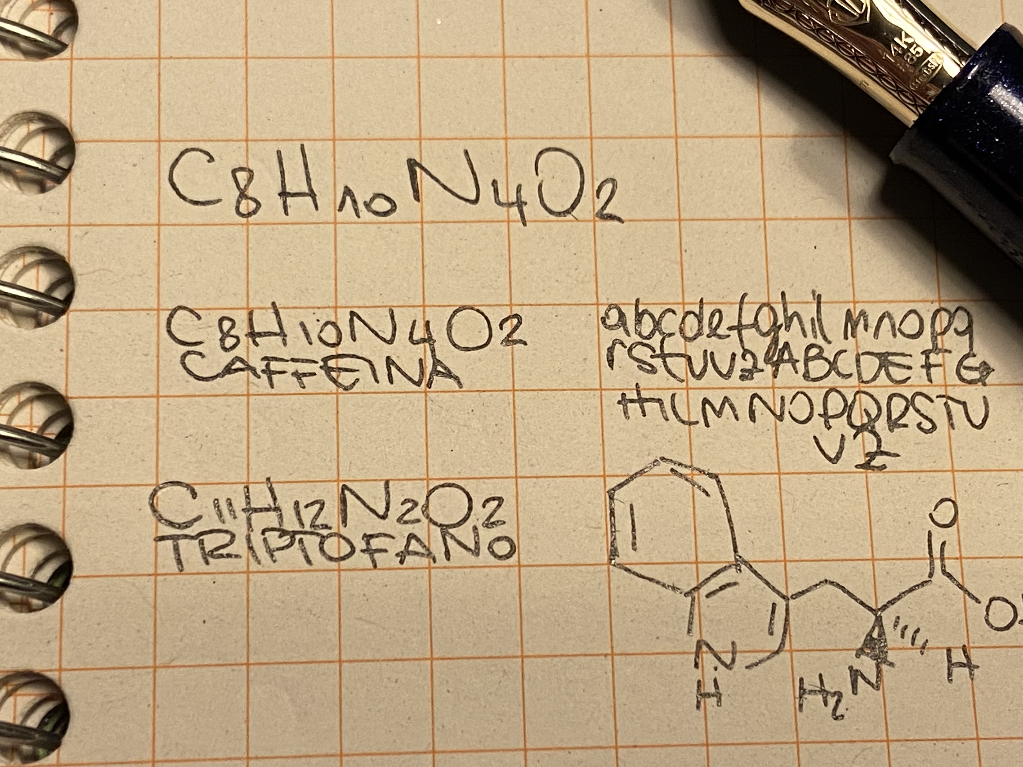 Qui con taccuino in carta riciclata, 5 mm, l’incipit in stampatello e corsivo è come scrivo in modo veloce per prendere appunti, su questo tipo di carta c’è ovviamente più feedback ma non è certo la classica carta da quaderno (che, strano ma vero, non ho in casa)