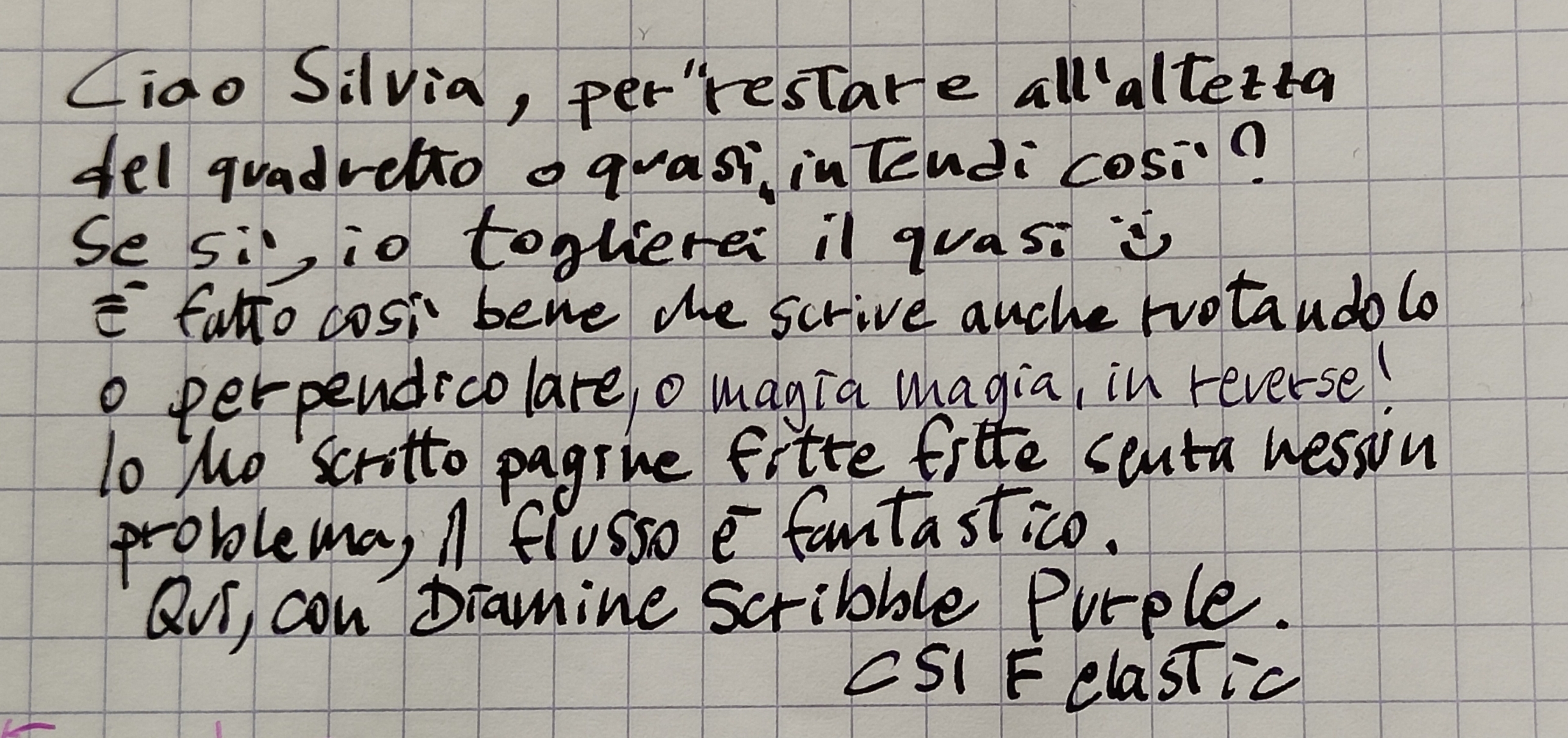 Il CSI su misure così sottili non ha lo scopo di offrire chissà quale variazione di tratto, ma di "squadrare" il tratto. I vecchi pennini Montblanc avevano un taglio Architect, anche su EF e F, il e risultato era un segno molto diverso - e secondo me più bello - di quello ottenuto con l'attuale geometria kugel del pennino. Io preferisco molto di più il tratto squadrato, tanto è vero che con il CSI F elastic sto usando anche misure F che solitamente non sono mie.