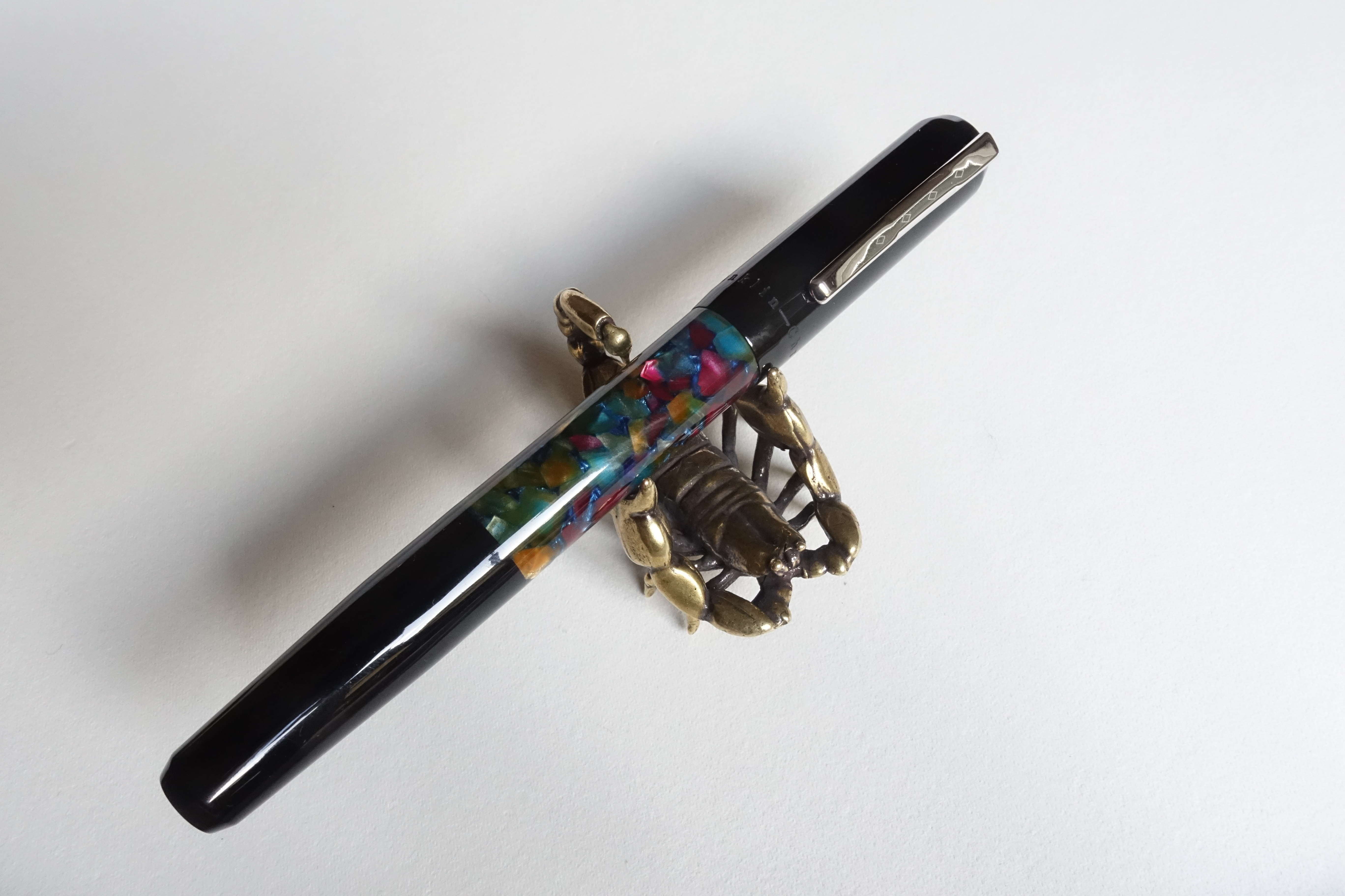 Il corpo-penna è cilindrico con una lievissima convessità (percepibile al solo tatto) nella sua parte iniziale (cioè quella in resina policroma) per poi terminare con forma leggermente tronco conica. Il fondello è piatto con perimetro smussato. Tutto il corpo penna sembra un pezzo unico ed al tatto non si avverte alcuna discontinuità.
