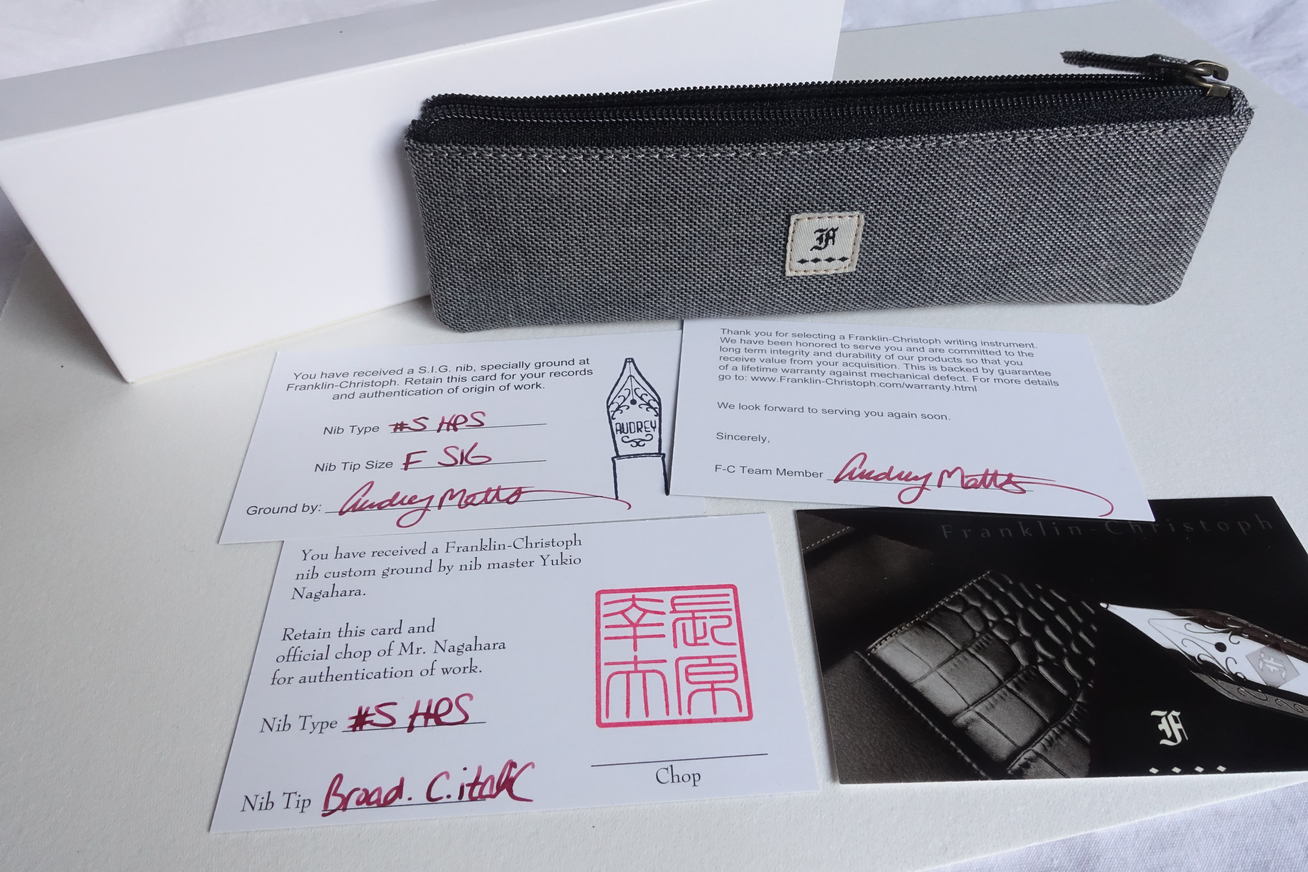 La penna, che ho provato per una ventina di giorni prima di scrivere queste mie impressioni, arriva all’interno di una comoda custodia in tessuto grigio con interno in finta pelle; ci sono due cartucce d’inchiostro e un converter brandizzato (attacco standard) e tre bigliettini firmati (uno di ringraziamento e garanzia per l’acquisto, uno per certificazione del pennino BCI (Broad Cursive Italic) con il logo del nib master Yukio Nagahara e l’altro a firma di Audrey Matteson colei che ha creato l’elaborazione dell’altro pennino da me acquistato, un S.I.G. (Stub Italic Gradient) su base “F”. Il tutto contenuto, insieme a un foglietto con la prova dei pennini, all’interno di una scatoletta di cartone bianco. Molto razionale.