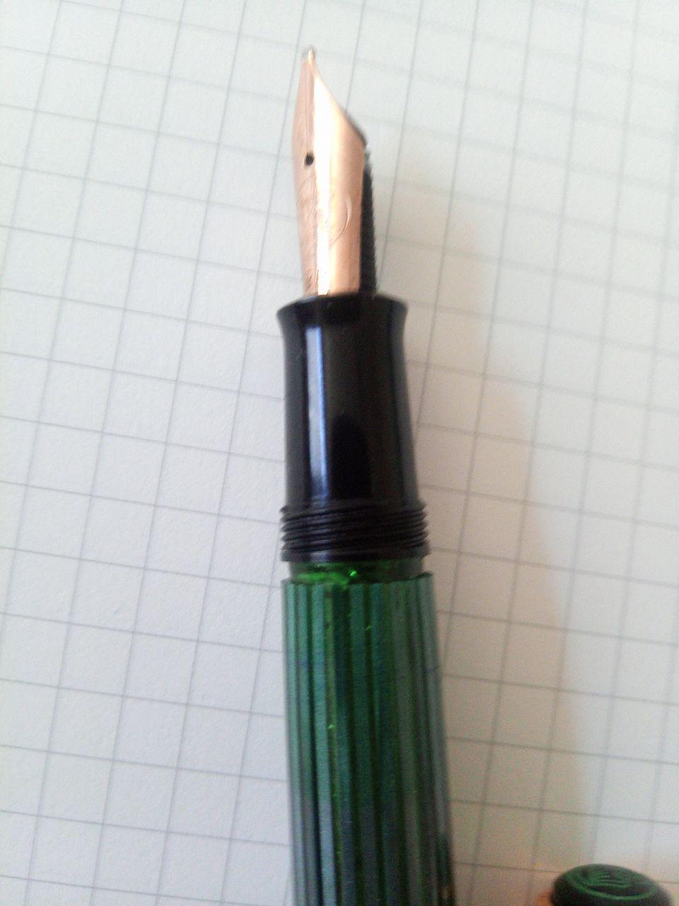 Quello rigato è un tubetto (binde) incollato sul fusto, a volte si spostano, di solito non è una bella cosa, puoi provare a scaldare lievemente e vedere se spingendo torna a posto, ma sovente, x esperienza personale, si fa peggio, io se la penna funziona lo lascerei così