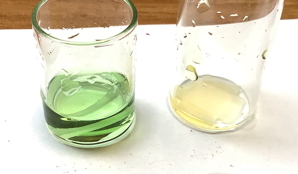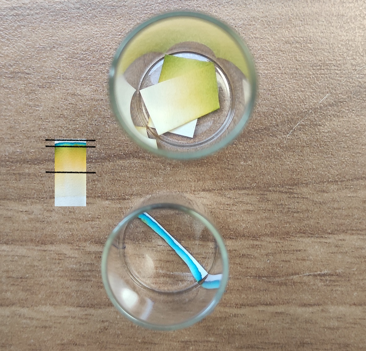 La componente blu/turchese e quella gialla erano posizionati nella zona alta del cromatogramma , è logico pensare che i due composti abbiano una più che buon affinità con l’acqua e che quindi siano facilmente diluitili nell’acqua stessa. Ed in effetti si ottengono due liquidi, uno di colore azzurrino e l’altro di colore giallo.