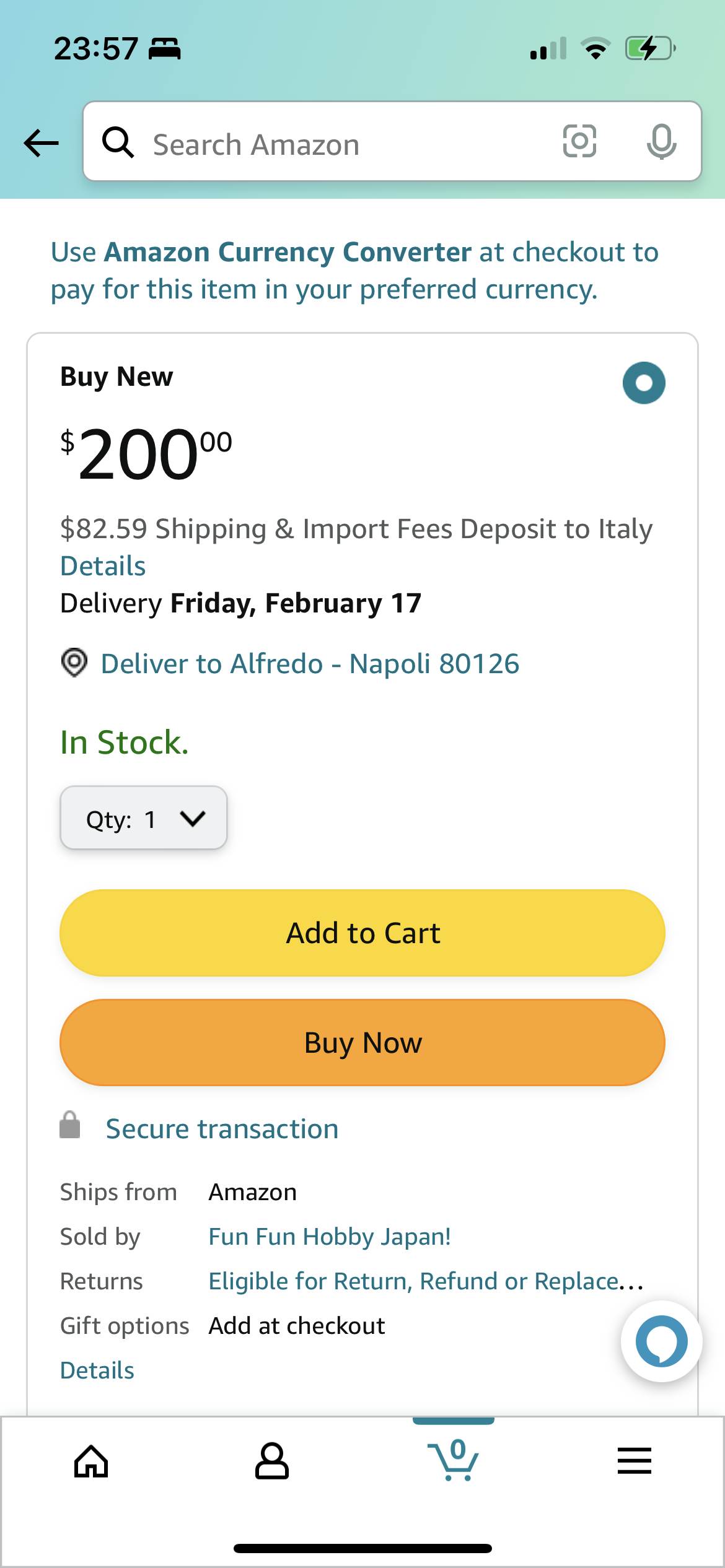 P.S. di solito conviene usare il pagamento in dollari affidandosi al cambio della tua carta di credito, e non far fare la conversione ad Amazon
