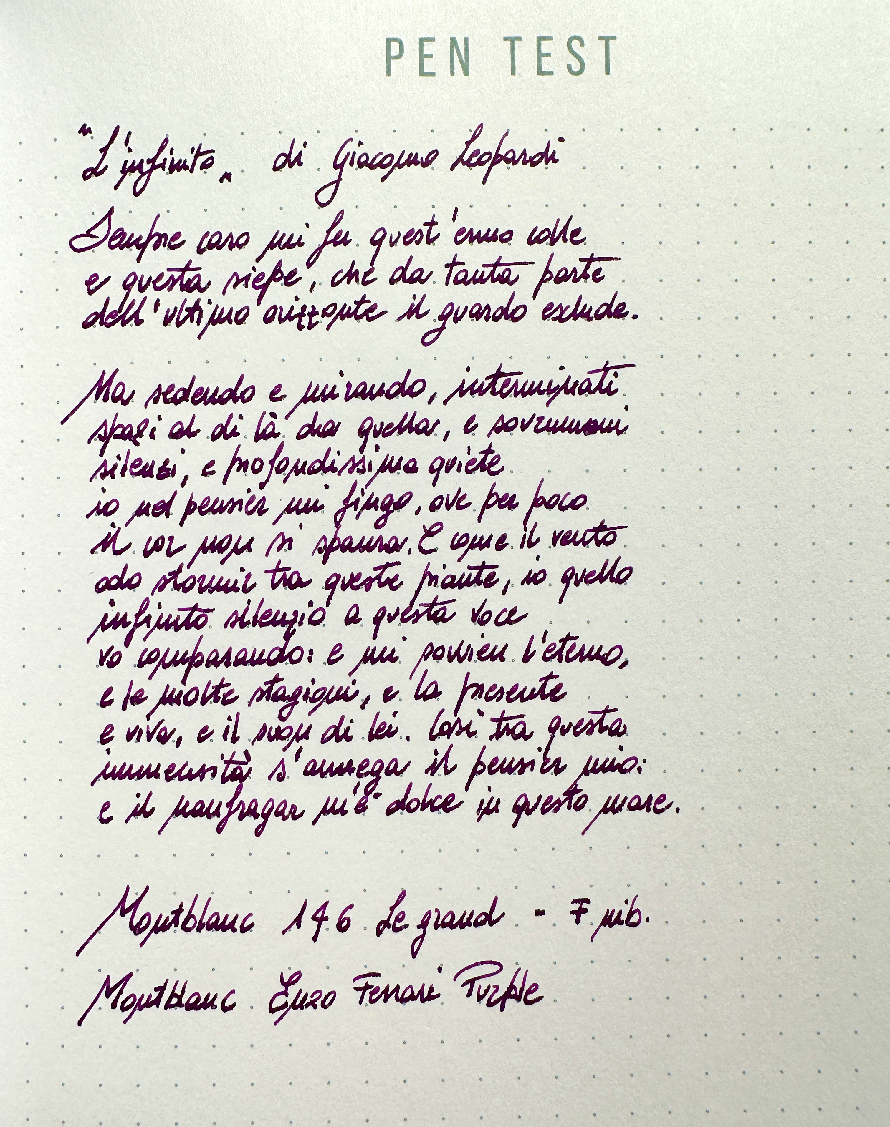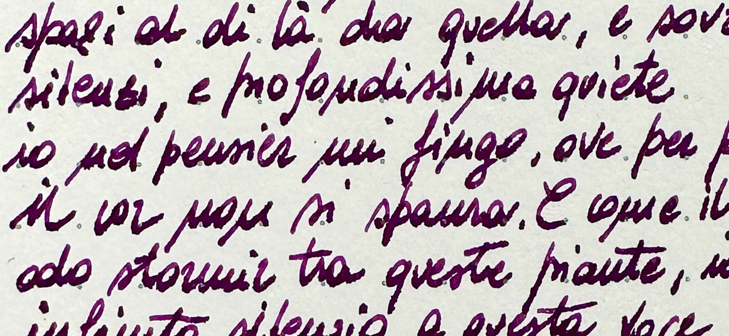 Molto saturo, bello. Visto che hai usato da diverso tempo inchiostri di colore viola mi chiedevo se hai mai provato il Noodler's Purple Wampum , forse assai simile come tonalità e flusso a questo MB ma a 1/3 del costo .
