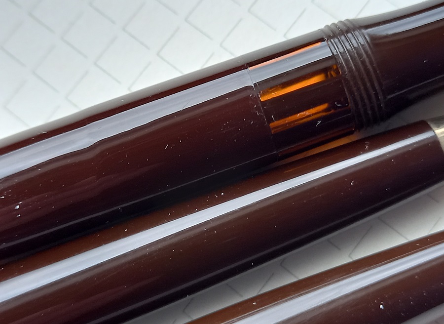Purtroppo il bel colore marrone degli strumenti di scrittura, così come quello del cappuccio dorato della stilografica e della parte superiore della matita meccanica, non viene fuori come dovrebbe nelle mie foto.