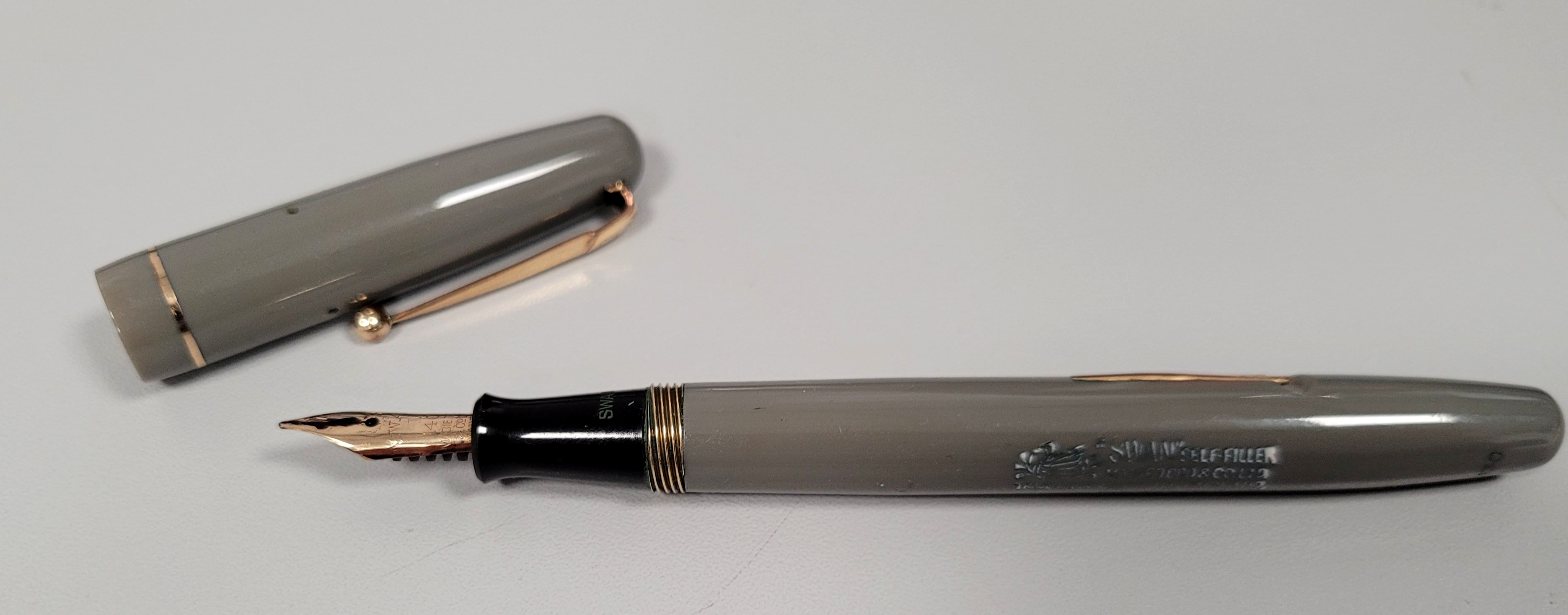 ecco un'elegante Signora inglese in abito grigio: Mabie&Todd Swan self filler 3130 gray Interessante particolare, l'inserzione della filettatura in ottone tra sezione e corpo in plastica. Purtroppo l'interno del cappuccio la filettatura è solo plastica. Trovo molto carina anche la scritta swan sulla sezione. Pennino obliquo, flessibile e scorrevole in perfetto stile swan. Clip meravigliosa!