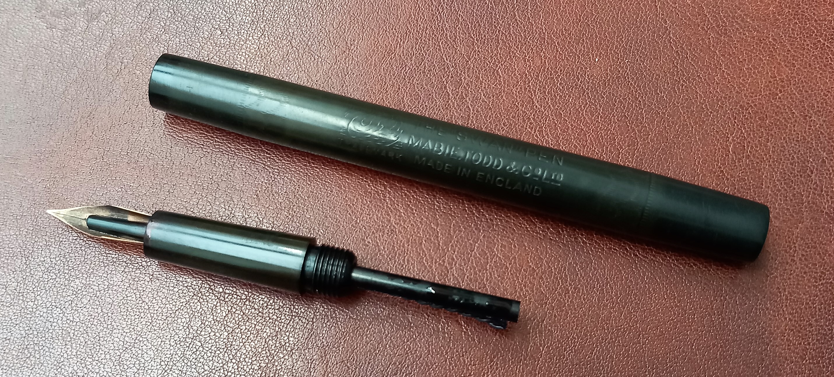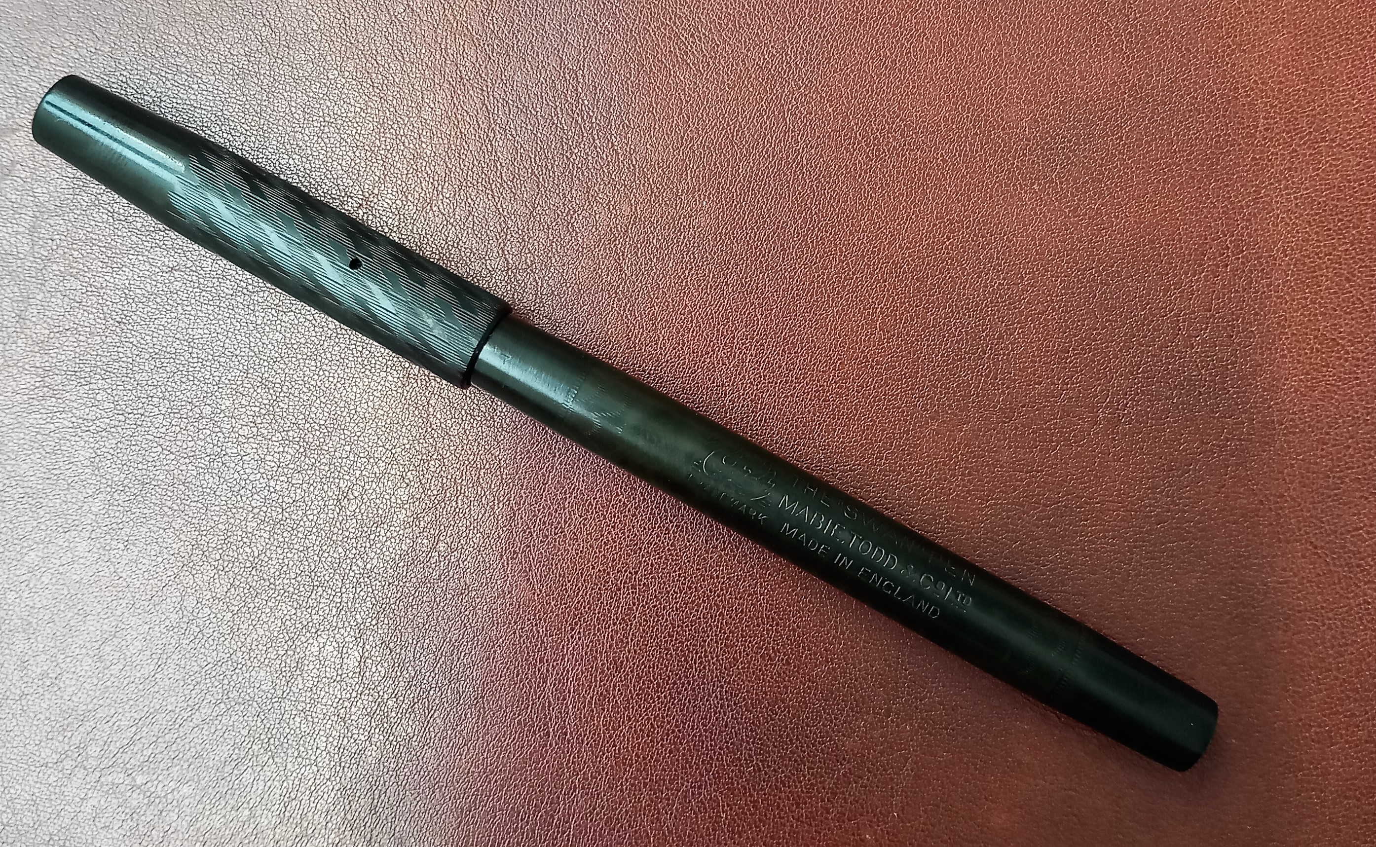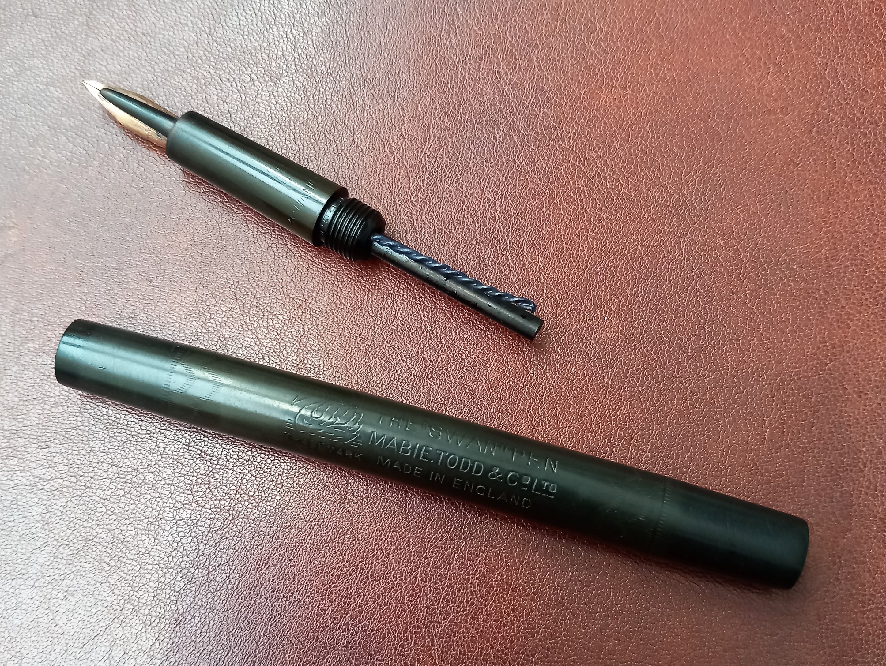 Non ho ancora avuto modo d'approfondire (la penna mi ha raggiunto dal Regno Unito solo ieri sera), ma per ora mi sono fatto l'idea che potrebbe trattarsi di una Swan n. 2, prodotta fra il 1907 ed il 1910. Le forme ricordano quelle della 1500 prodotta negli USA da Mabie Todd & Bard intorno al 1902, ma a differenza di questa sulla sezione alla scritta "Swan" non segue alcun numero.