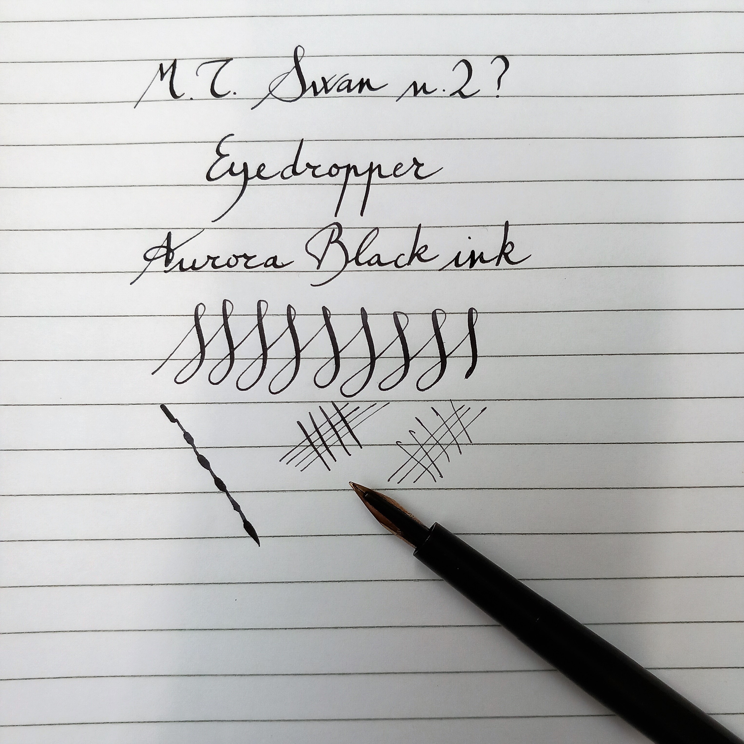 Non ho ancora avuto modo d'approfondire (la penna mi ha raggiunto dal Regno Unito solo ieri sera), ma per ora mi sono fatto l'idea che potrebbe trattarsi di una Swan n. 2, prodotta fra il 1907 ed il 1910. Le forme ricordano quelle della 1500 prodotta negli USA da Mabie Todd & Bard intorno al 1902, ma a differenza di questa sulla sezione alla scritta "Swan" non segue alcun numero. Scusate la mia poca perizia nell'uso del pennino, che conto di affinare, naturalmente.