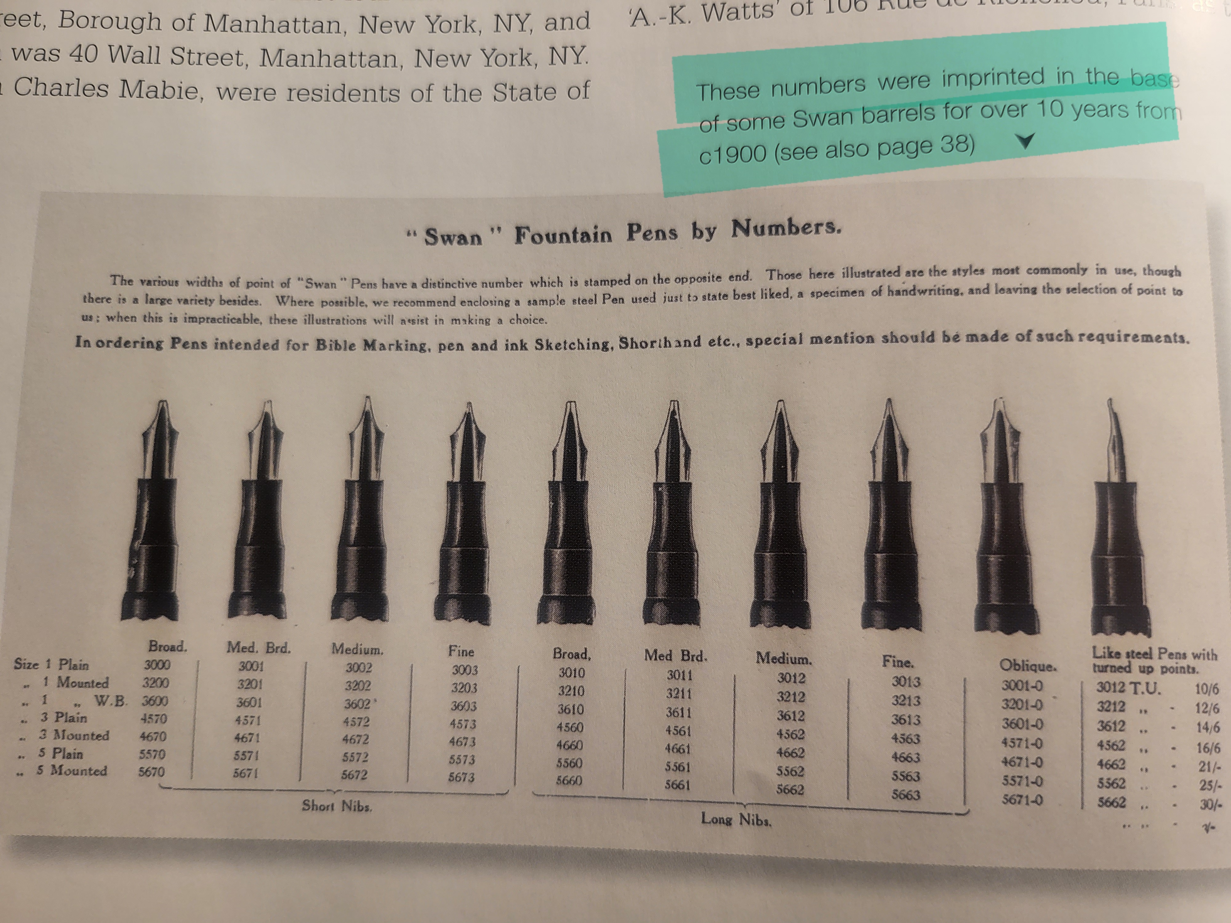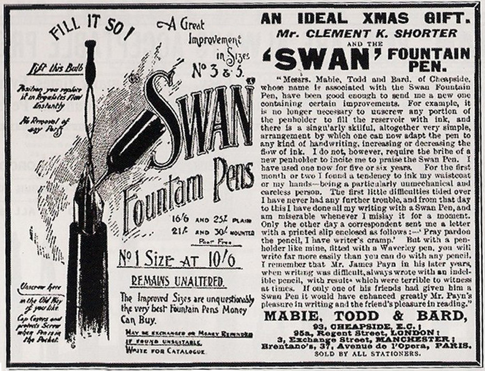Particolarmente interessante la prima penna in alto, descritta come “Standard Swan – Extra large nib and holder” (“Swan standard, pennino e sezione extra grandi”), che lascia supporre che il modello standard fosse proposto in diverse misure.