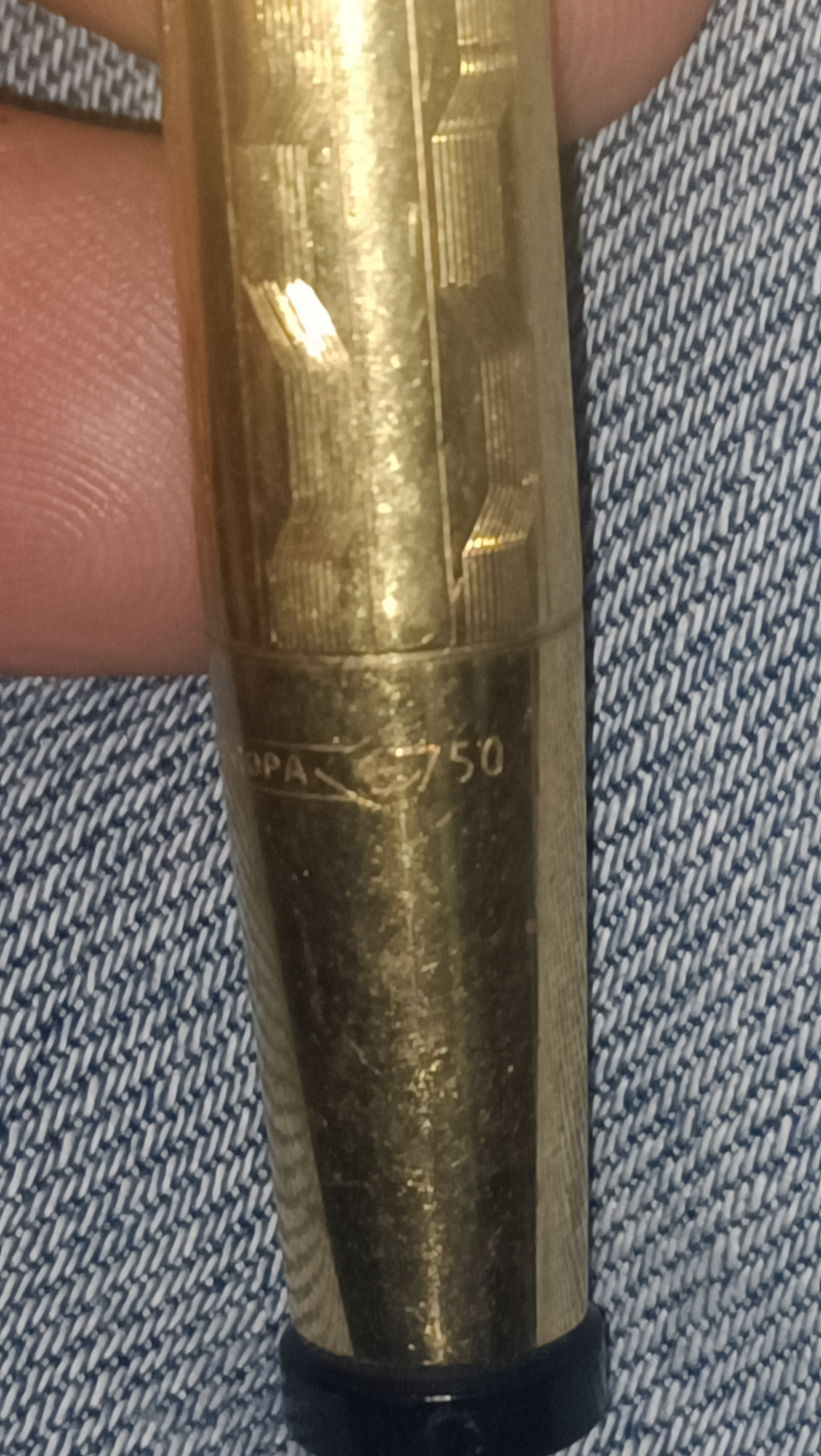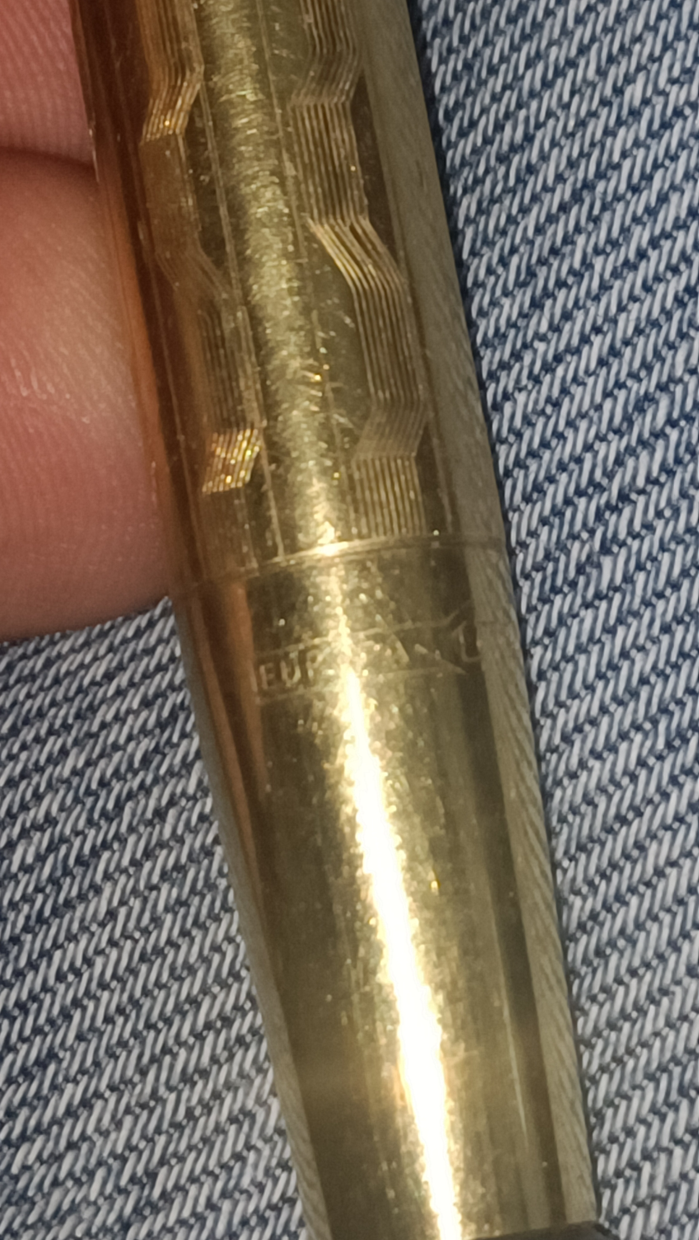 La penna fu rivestita da una delle migliori artigiane del laboratorio, Linda Darnes, moglie di Giuseppe Cavaliere, fondatore della ditta, la quale vi ha apposto il suo marchio personale, evidenziato nell'ultima foto...