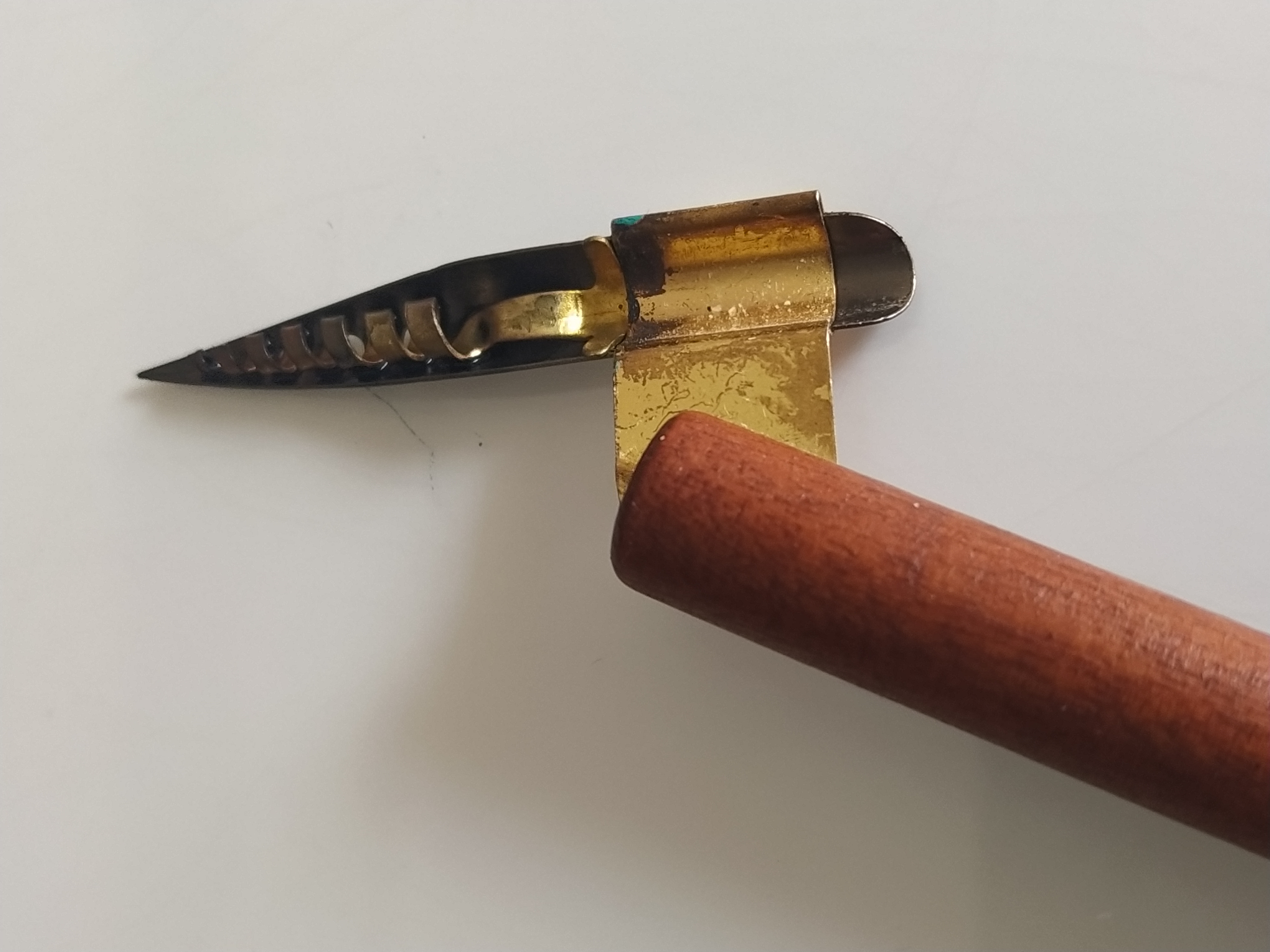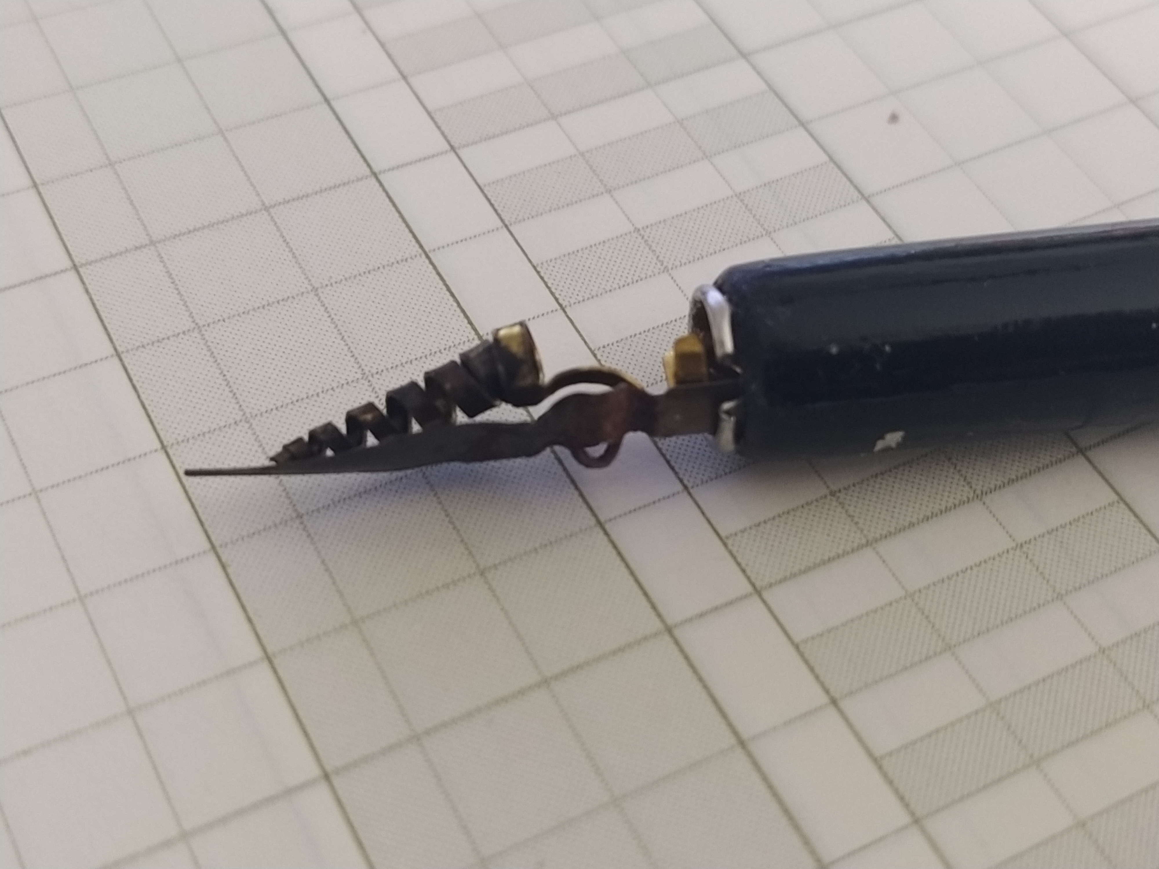 Il "serbatoio a spirale" è effettivamente efficace nel trattenere una notevole quantità di inchiostro e utilizzabile anche per i pennini a punta fine perché non altera minimamente la meccanica del pennino; dopo averlo velocemente e grossolanamente sagomato in modo che che il finale del "truciolo" tocchi il pennino a qualche mm. dalla punta è pronto all'uso. Piuttosto, può essere il caso di doverlo accorciare per pennini corti in luogo di incurvarlo, perché la "pancia" potrebbe toccare la carta se si tiene la cannuccia abbastanza inclinata. Non ho ancora fatto questa prova (a dir la verità, sulla prova di montaggio sulla cannuccia obliqua ho usato un pennino particolarmente lungo proprio per evitare di fare operazioni aggiuntive).