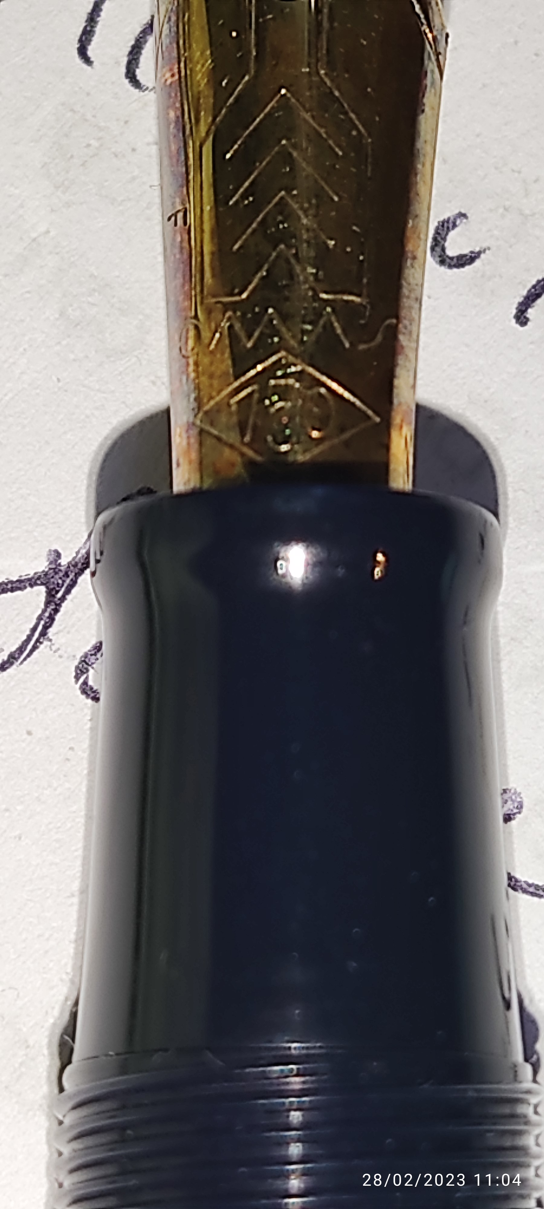 Buoingiorno a Tutti. Come da titolo, ho ritrovato questa stilo Omas in un cassetto pieno di cianfrusaglie. Ho letto parecchio su questo forum , ma non ho trovato una penna simile a questa per poterla individuare come modello. Ha il fusto ed il cappuccio dodecagonale, anello dorato con greche sul cappuccio e sul fusto, carica a stantuffo. Sul pennino dentro la losanga è riportato il num. 150. Il pennino potrebbe essere d'oro??.