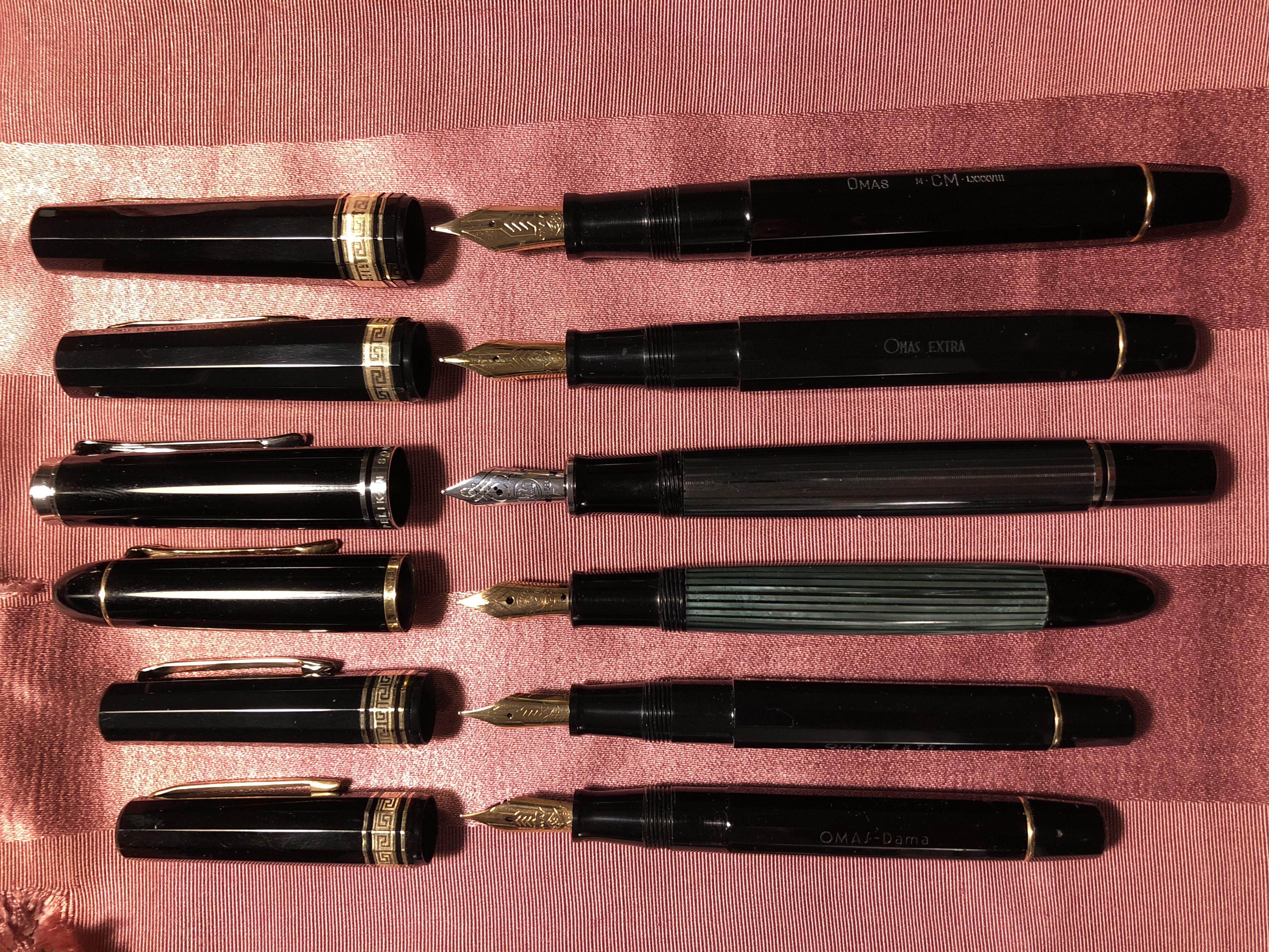 Inizialmente tutte avevano pennini in oro giallo 14k (585) solitamente più flessibili, poi si è passati al 18k (750) solitamente più rigido, e in alcuni casi i pennini 18k sono diventati two-tone. Queli prodotti da Omas (o chi per Omas, in Italia) hanno la o di Omas minuscola, quando Omas è passata a farseli fare da Bock la O di Omas sul pennino è diventata maiuscola.