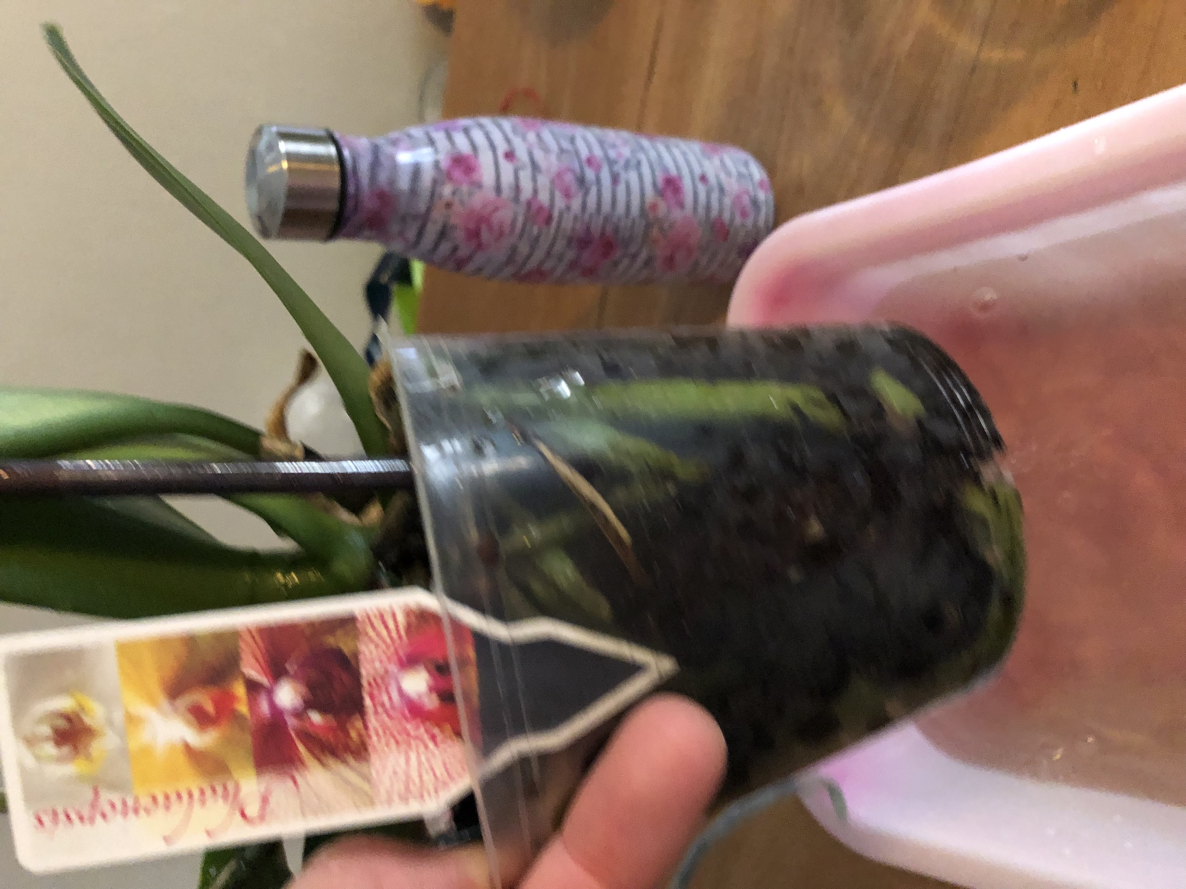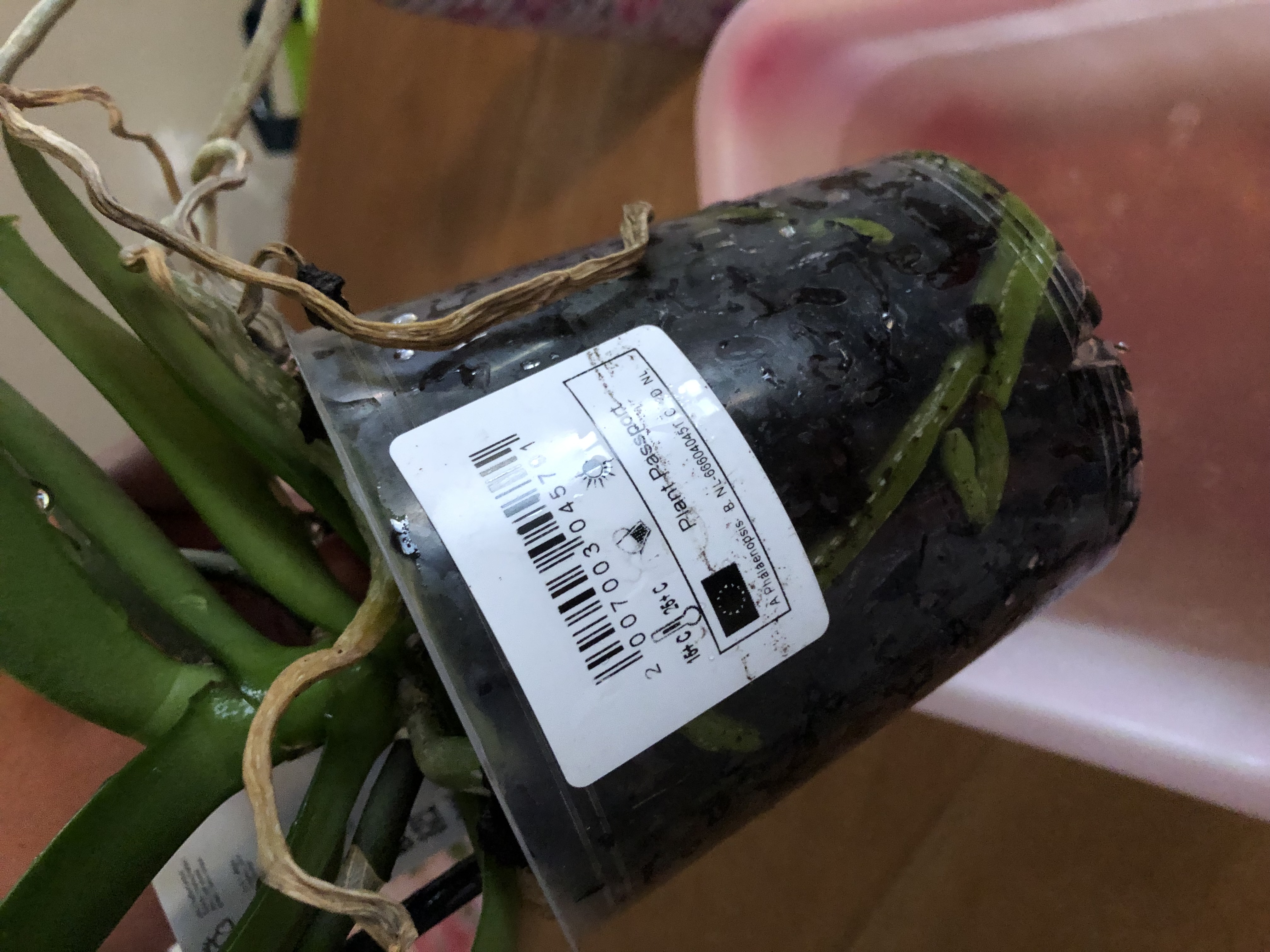Il vaso che le hanno dato insieme alla pianta é ottimo per capire quando irrigarla. Le orchidee Phalaenopsis, come le dicevo, vivono abbarbicate sugli alberi, per cui le loro radici non sono disegnate per restare perennemente bagnate. Sono ricoperte da alcuni strati di cellule che hanno perduto il loro contenuto vitale (il velamen radicum) e funzionano come una spugna per catturare l'acqua e cederla lentamente ai vasi conduttori. Questa spugna deve poter asciugare tra un'annaffiatura e l'altra. La maggior parte delle orchidee coltivate in casa muoiono annegate per eccesso di innaffiature. Osservando attraverso le pareti trasparenti del vaso, noterà che a un certo punto le radici (che nella sua fotografia sono verdi) denteranno verde chiaro e poi biancastre: quello é il momento di innaffiare nuovamente. Quando é il momento, innaffi abbondantemente, magari lasciando scorrere l'acqua nel lavandino o sotto la doccia per un paio di minuti. D'inverno, non usi l'acqua gelata cosí come sale dal rubinetto. Puó innaffiare e spruzzare la sua pianta qando vuole, ma avendo cura che, per la sera, le foglie siano asciutte. In natura, le Phalaenopsis crescono pendendo dagli alberi. Siccome in vaso si coltivano erette, accade con frequenza che l'acqua che rimane all'interno delle foglie, all'apice del fusto (i coltivatori chiamano questa parte della pianta il "colletto"), provochi il marciume della gemma apicale, e la morte della pianta. Come dicono i coltivatori esperti, "in caso di dubbio, innaffia domani".