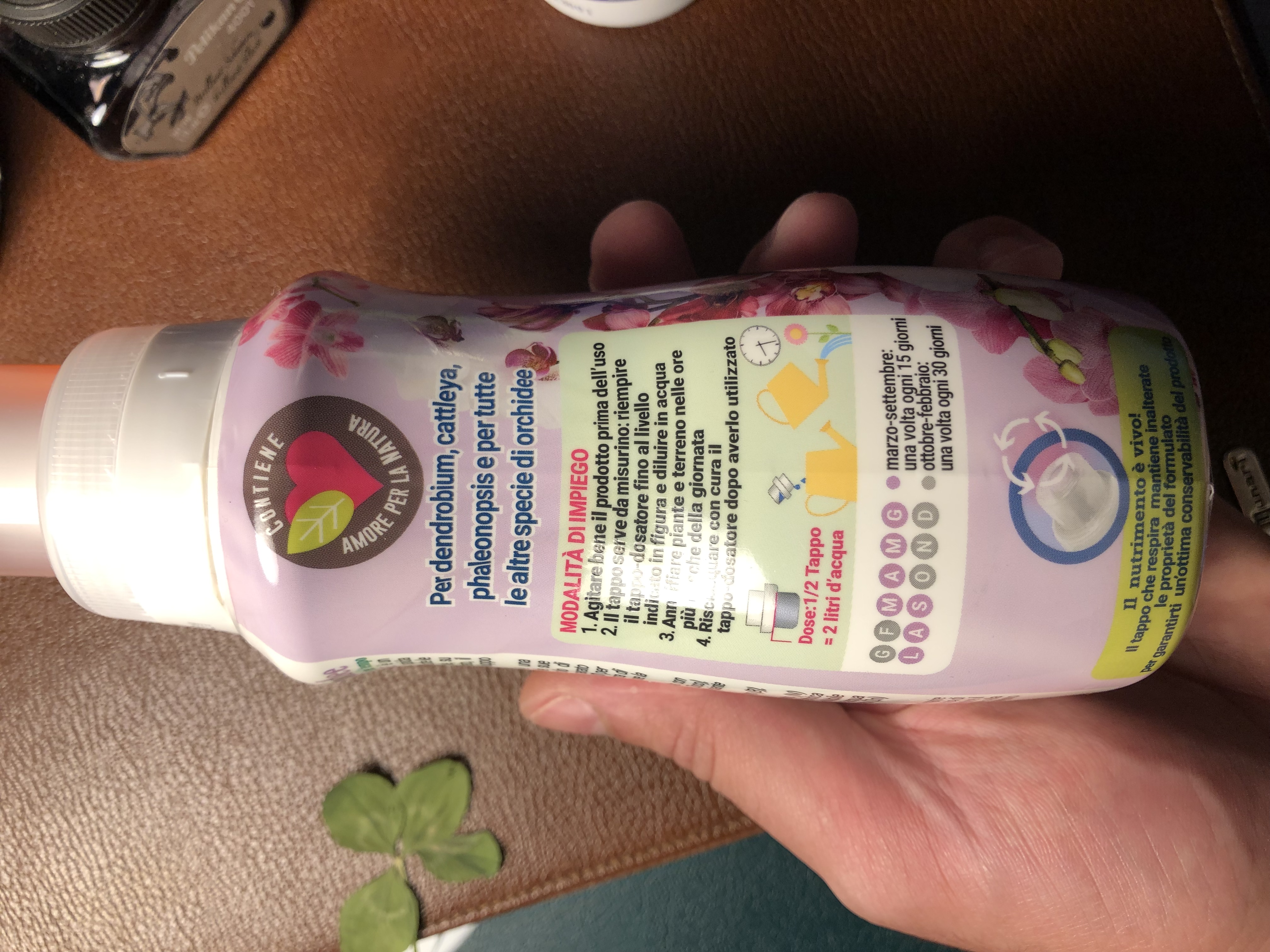 d) il fertilizzante che uso me lo hanno suggerito al negozio vicino casa. È liquido da diluire, io ho proceduto come segue: ho fatto una diluizione in acqua secondo le dosi, ho messo la soluzione in una bacinella e immerso il vaso completamente. Poi io quell’acqua essendo fertilizzata la ho tenuta per fare la stessa cosa le volte successive. Così una settimana immergo in acqua normale e un’altra in acqua fertilizzata.