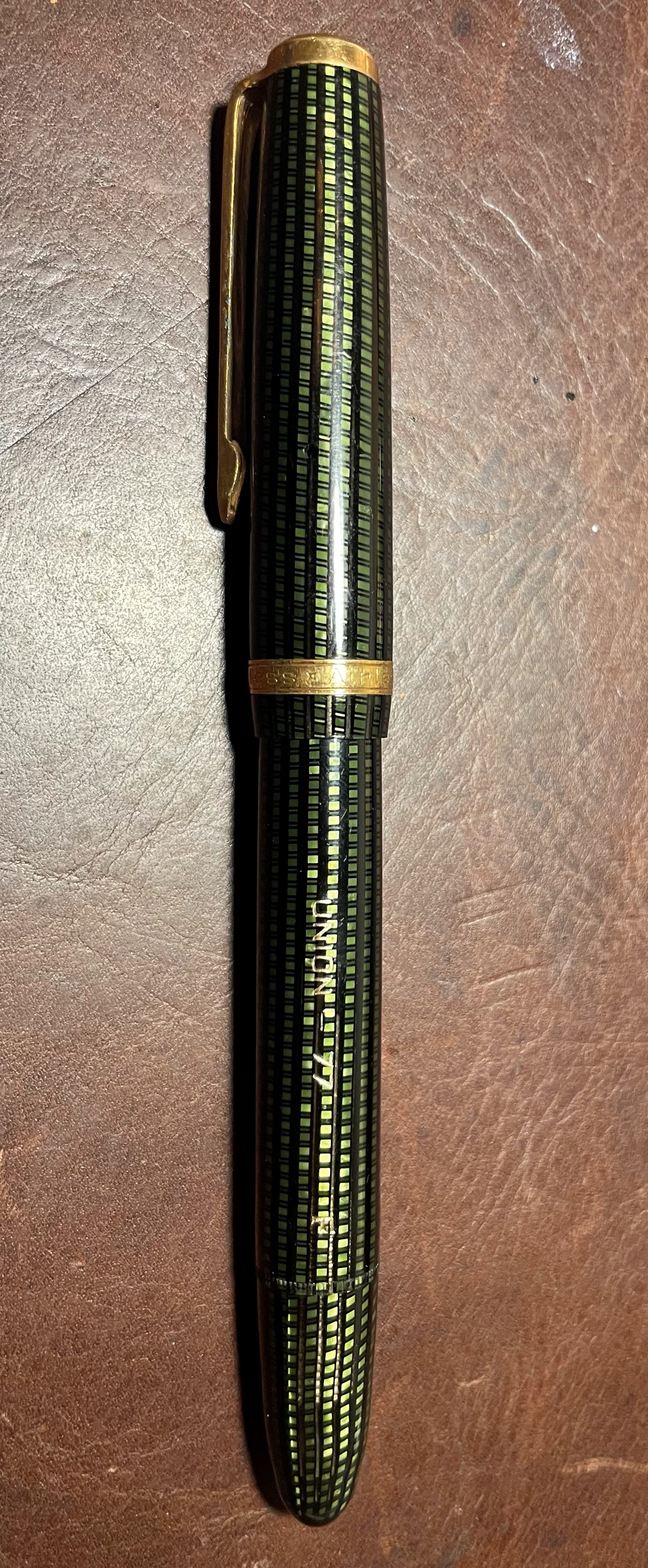 Il modello è 77 (per lo meno credo, in quei periodi storici c'era molta libertà in nomi, modelli, lotti e varianti improvvisate) e il pennino è fine, ma oltre a questo nell'anello intorno al cappuccio nella parte bassa c'è scritto "airless" che ho visto essere un modello (o una peculiarità) della Union in altre stilo di quel periodo.