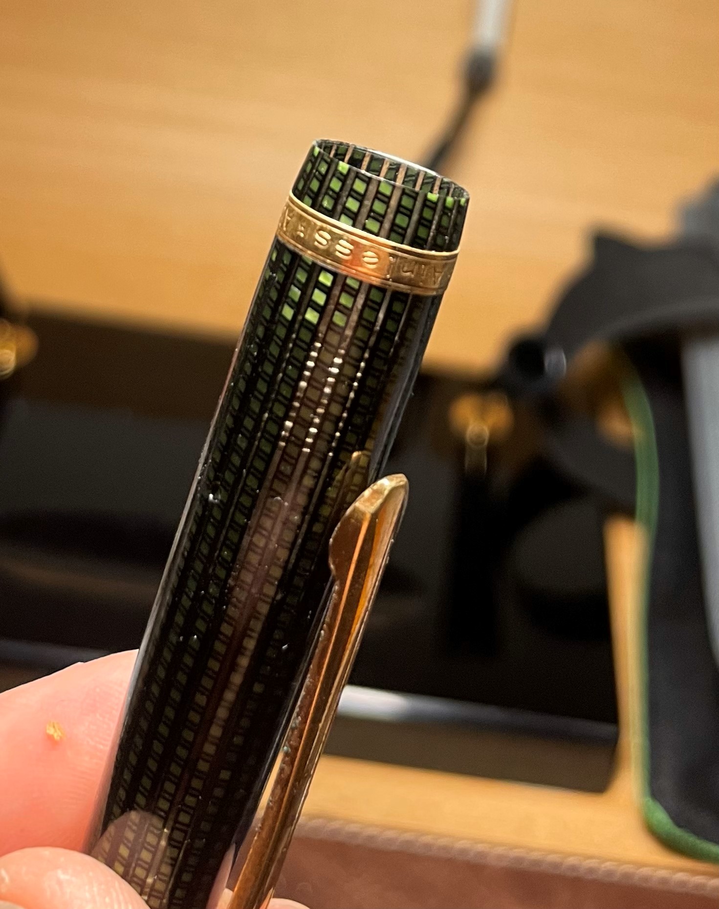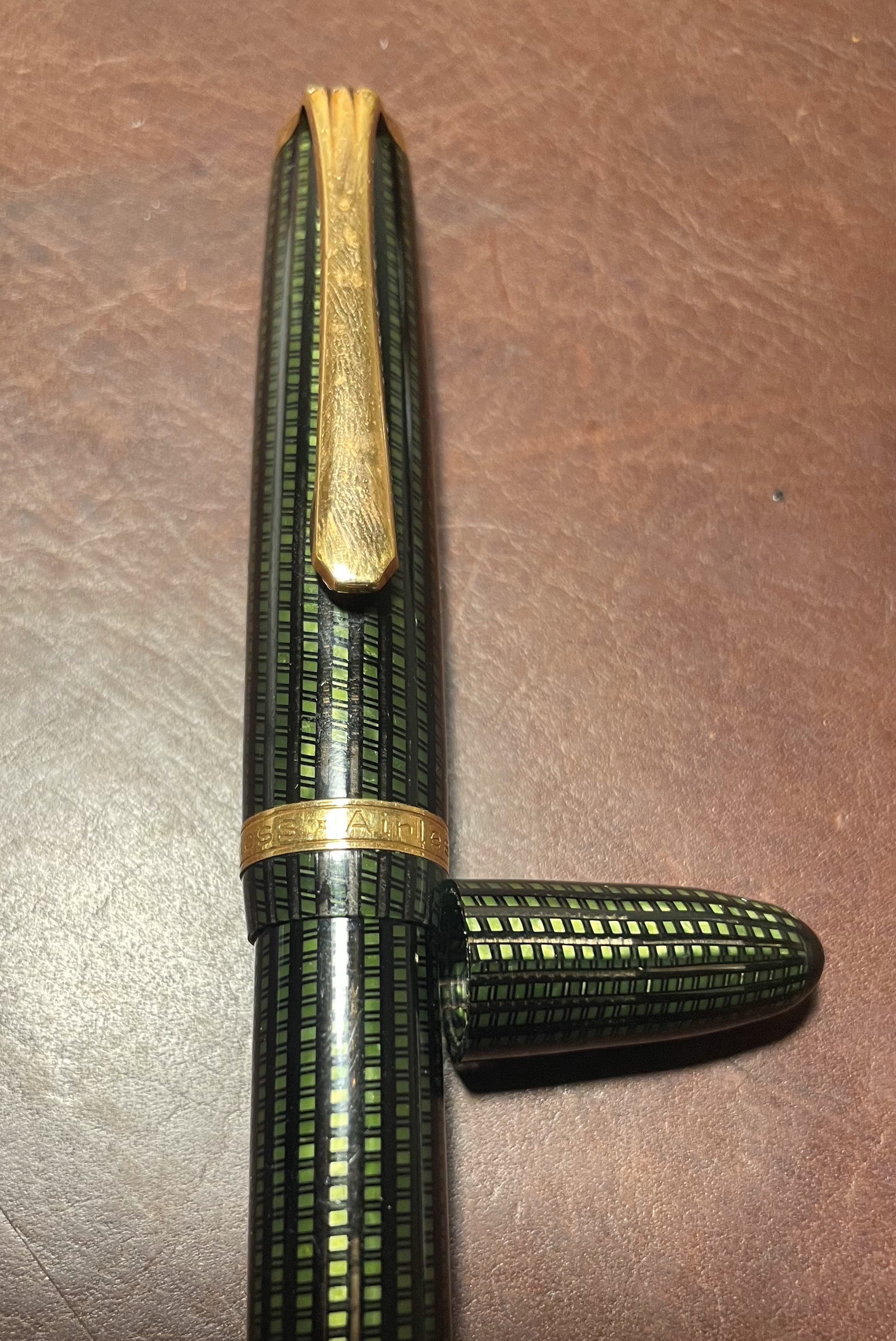 Esme: il pennino si intravede appena quando è chiusa: secondo me per le lavorazioni che intravedo guardandola dal cavo del tappo, che non è solo quella che si avvita al fusto. Magari si chiama airless per questo, perchè avevano trovato un qualcosa di più ermetico per farla asciugare più lentamente, chissà. Io non lo so, queste info si perdono o si recuperano dagli anni '50.