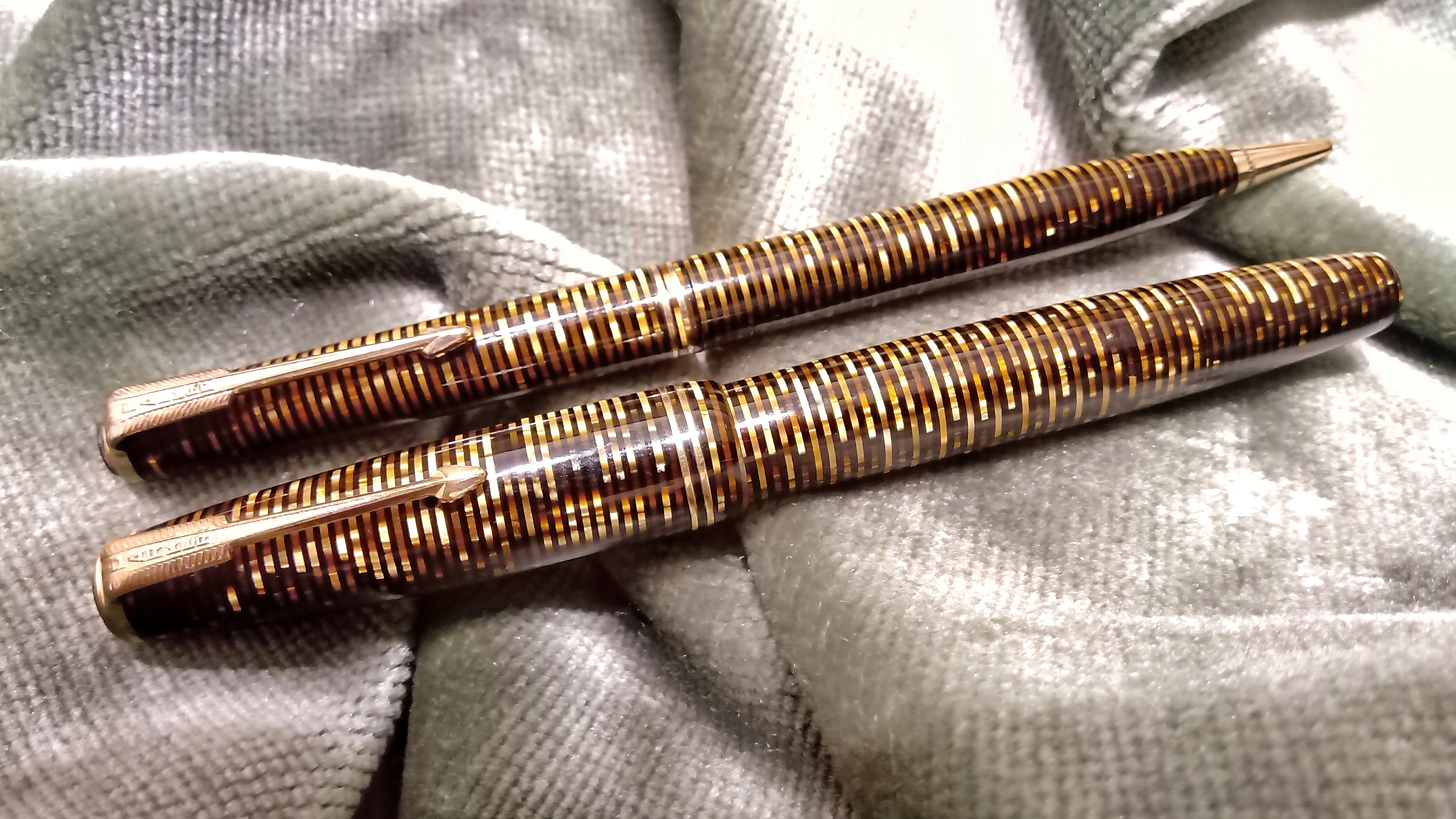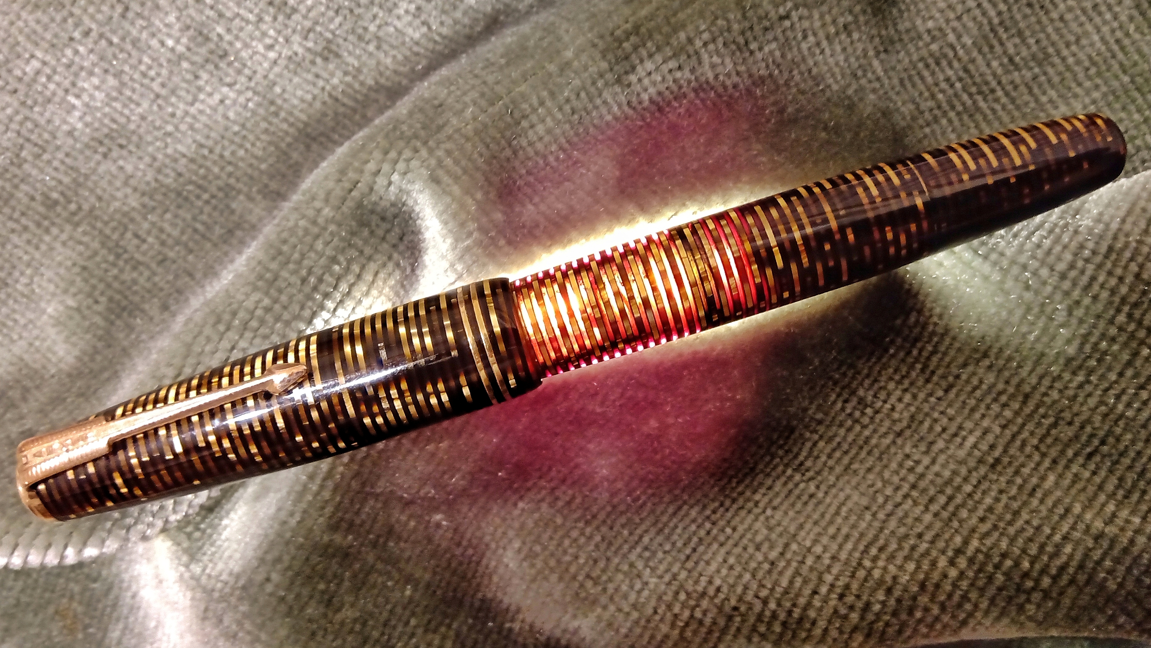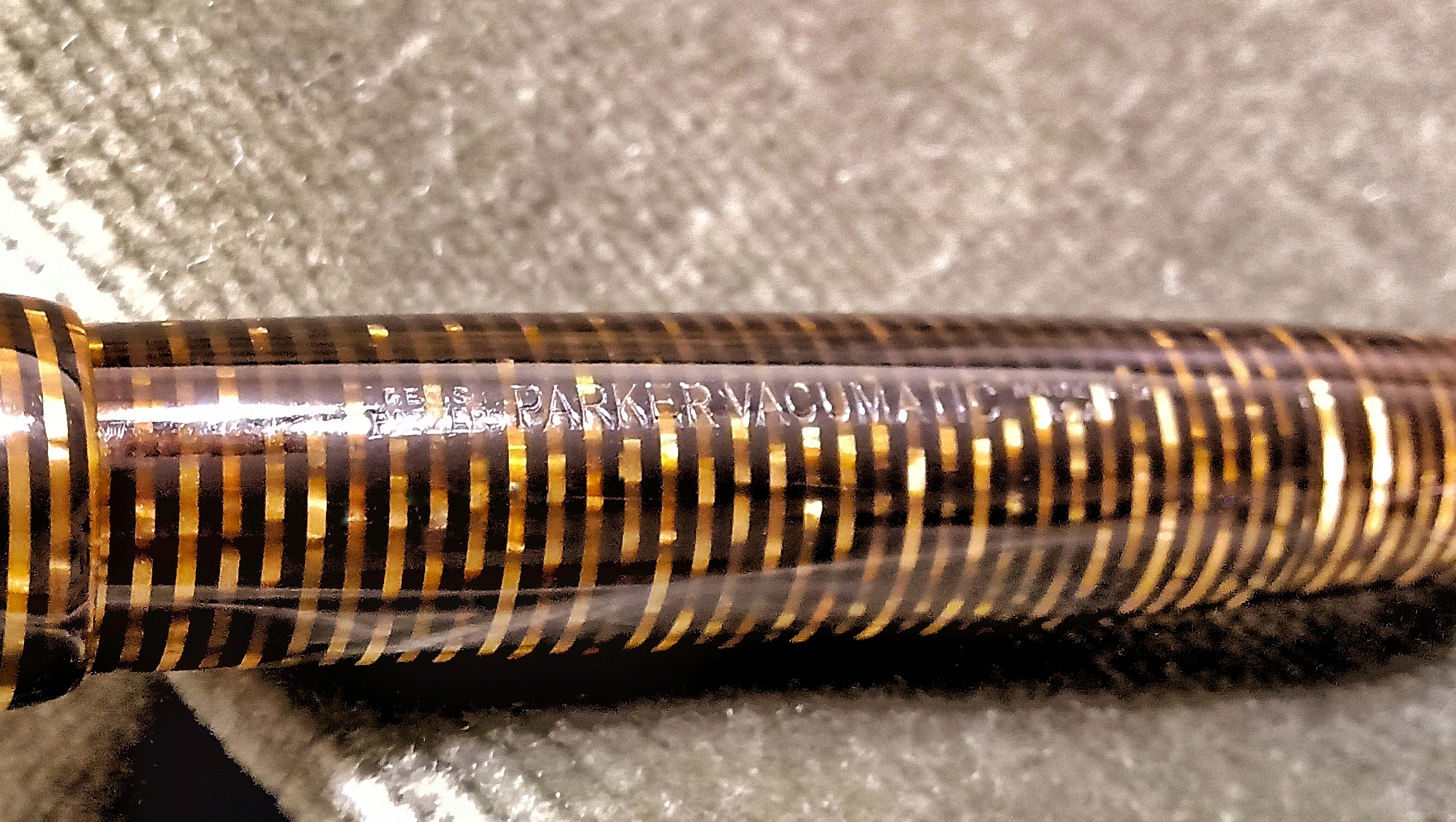 Oggi volevo condividere con voi il una penna stilografica, portamine e cofanetto, di un prodotto Parker che si chiamava Vacumatic Debutante Junior, una bellissima penna realizzata in celluloide laminata con anelli dorati sulla sua struttura, sistema di ricarica vacumatic, a vista pennino semiflessibile in oro, serbatoio dell'inchiostro traslucido, cappuccio con doppi anelli laminati in oro e un semplice gioiello nero a coronamento della sua clip, anch'esso in oro laminato.