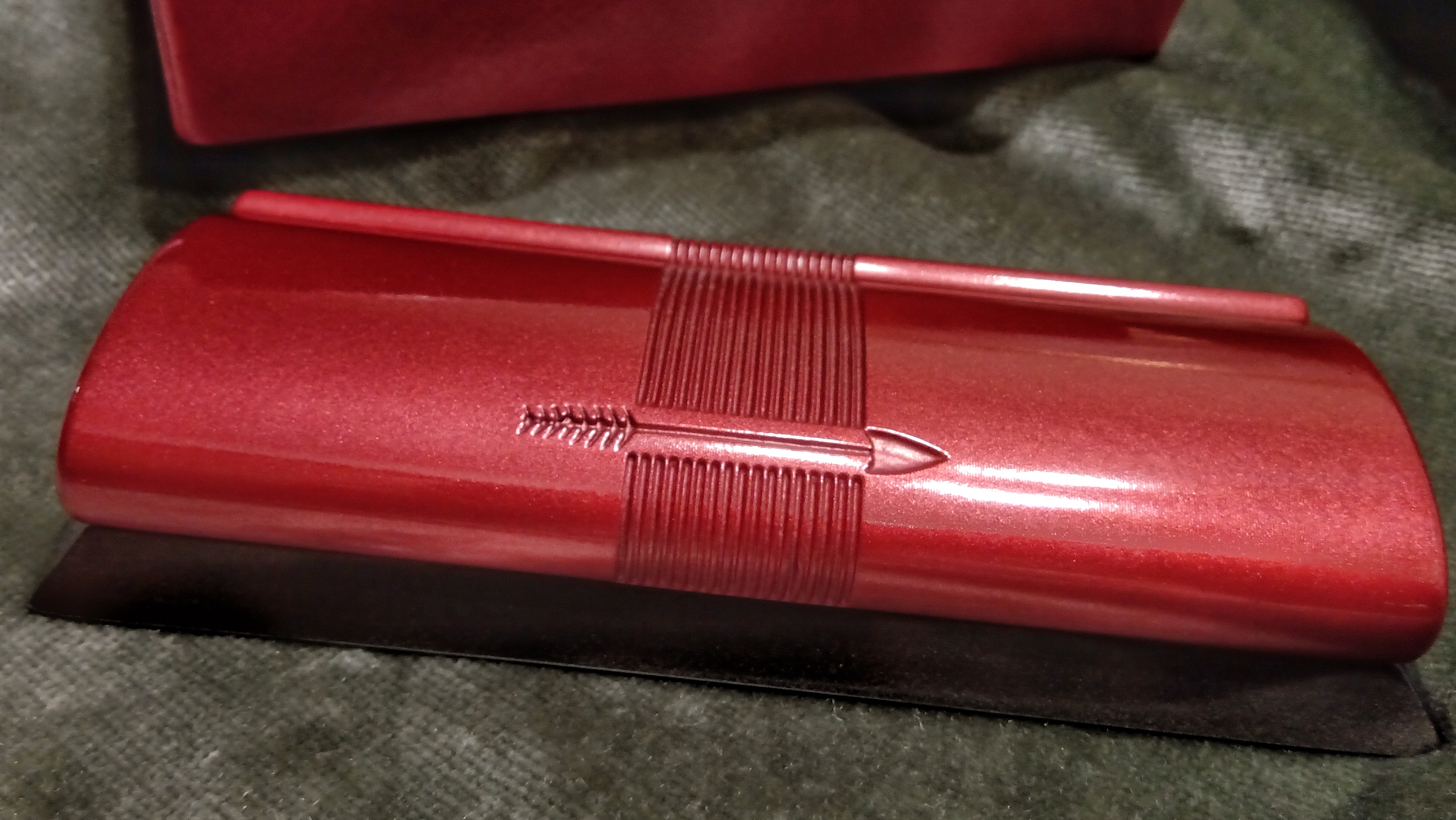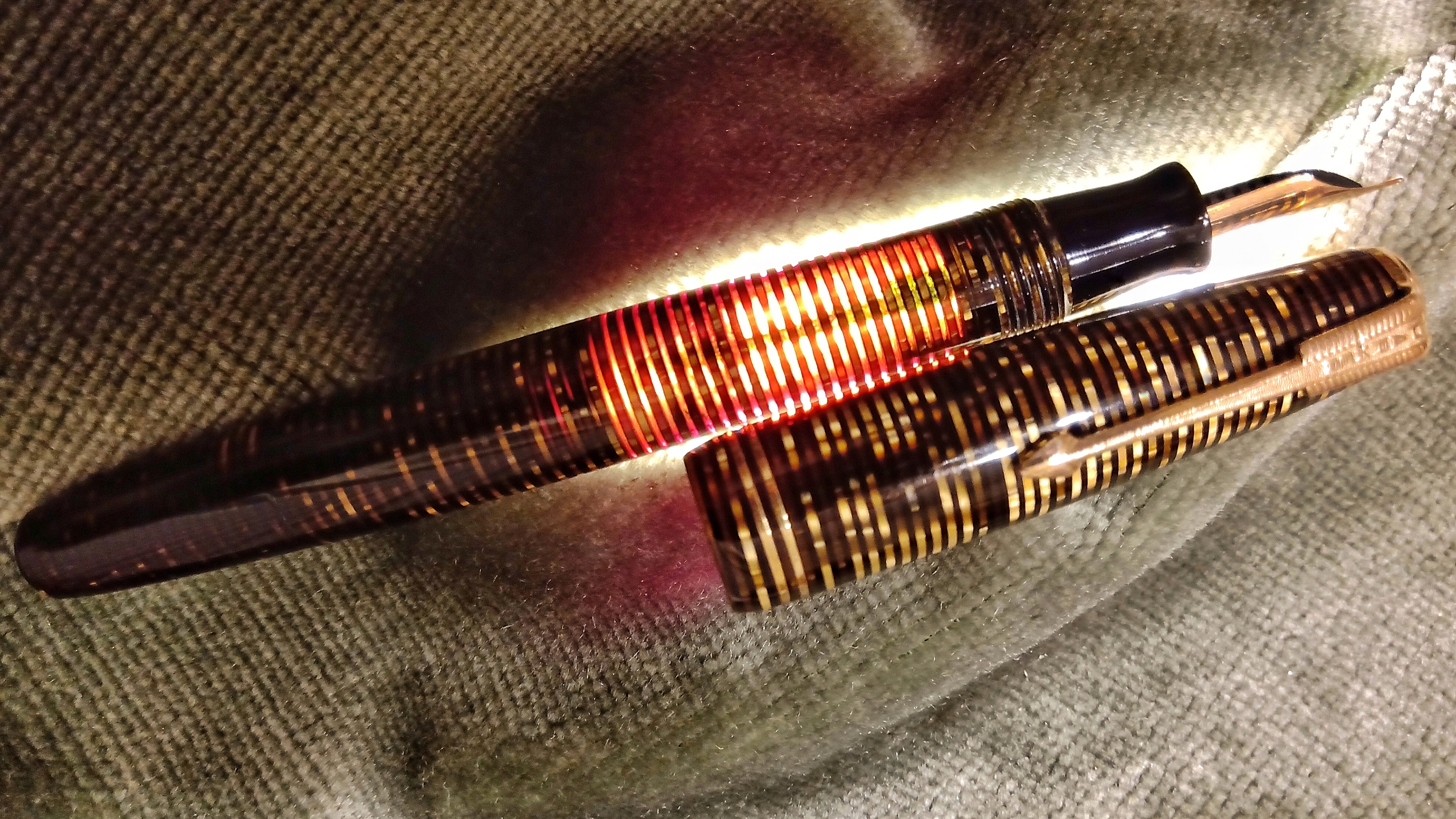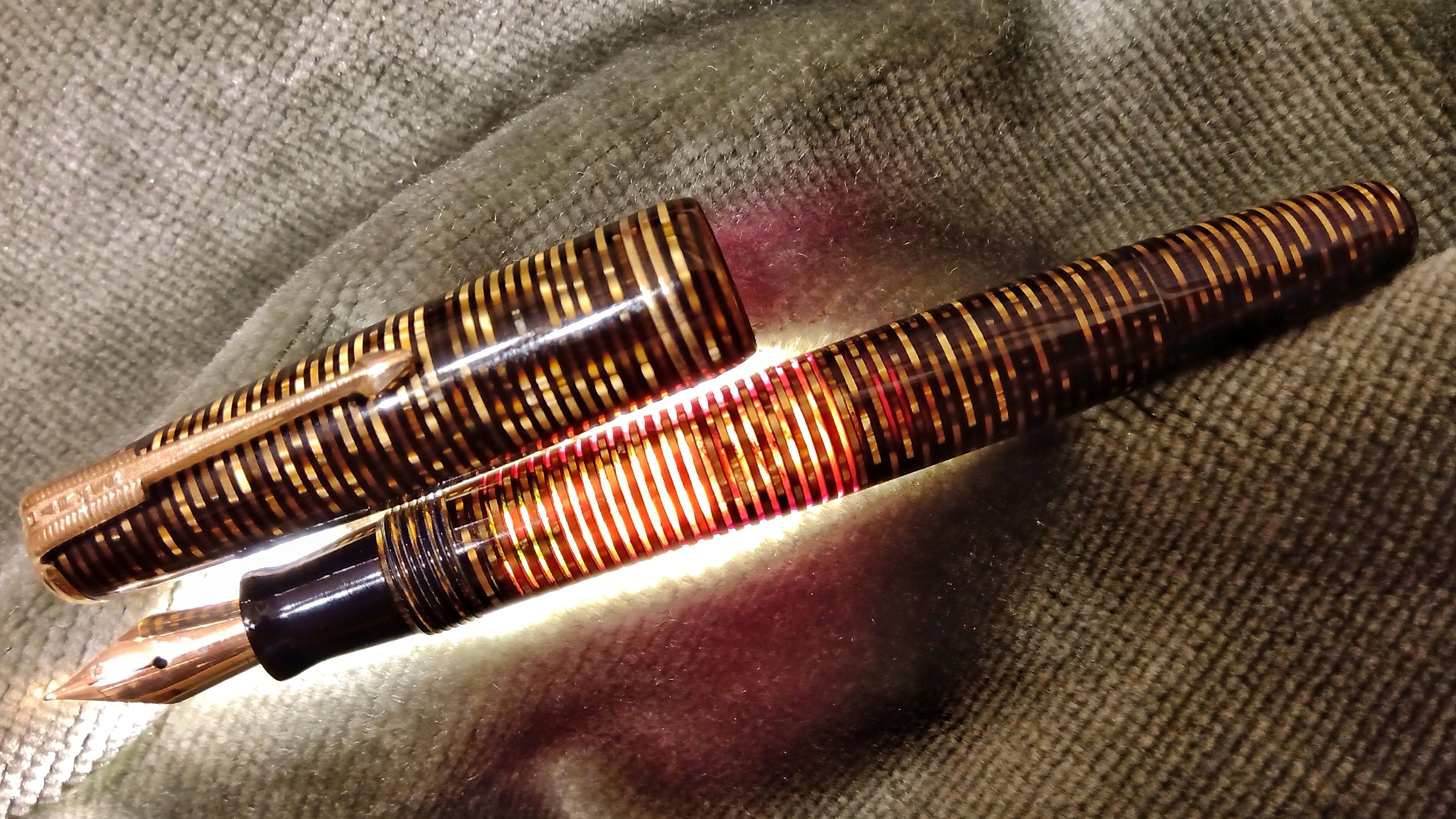 Oggi volevo condividere con voi il una penna stilografica, portamine e cofanetto, di un prodotto Parker che si chiamava Vacumatic Debutante Junior, una bellissima penna realizzata in celluloide laminata con anelli dorati sulla sua struttura, sistema di ricarica vacumatic, a vista pennino semiflessibile in oro, serbatoio dell'inchiostro traslucido, cappuccio con doppi anelli laminati in oro e un semplice gioiello nero a coronamento della sua clip, anch'esso in oro laminato.