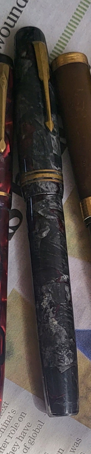 Saluti Mi chiedo se qualcuno può riconoscere questa penna o il materiale utilizzato. L'impronta è molto difficile da leggere. Un amico sta cercando di decifrare la scritta sul fusto che è molto debole. Mi ha appena inviato un'e-mail dicendo