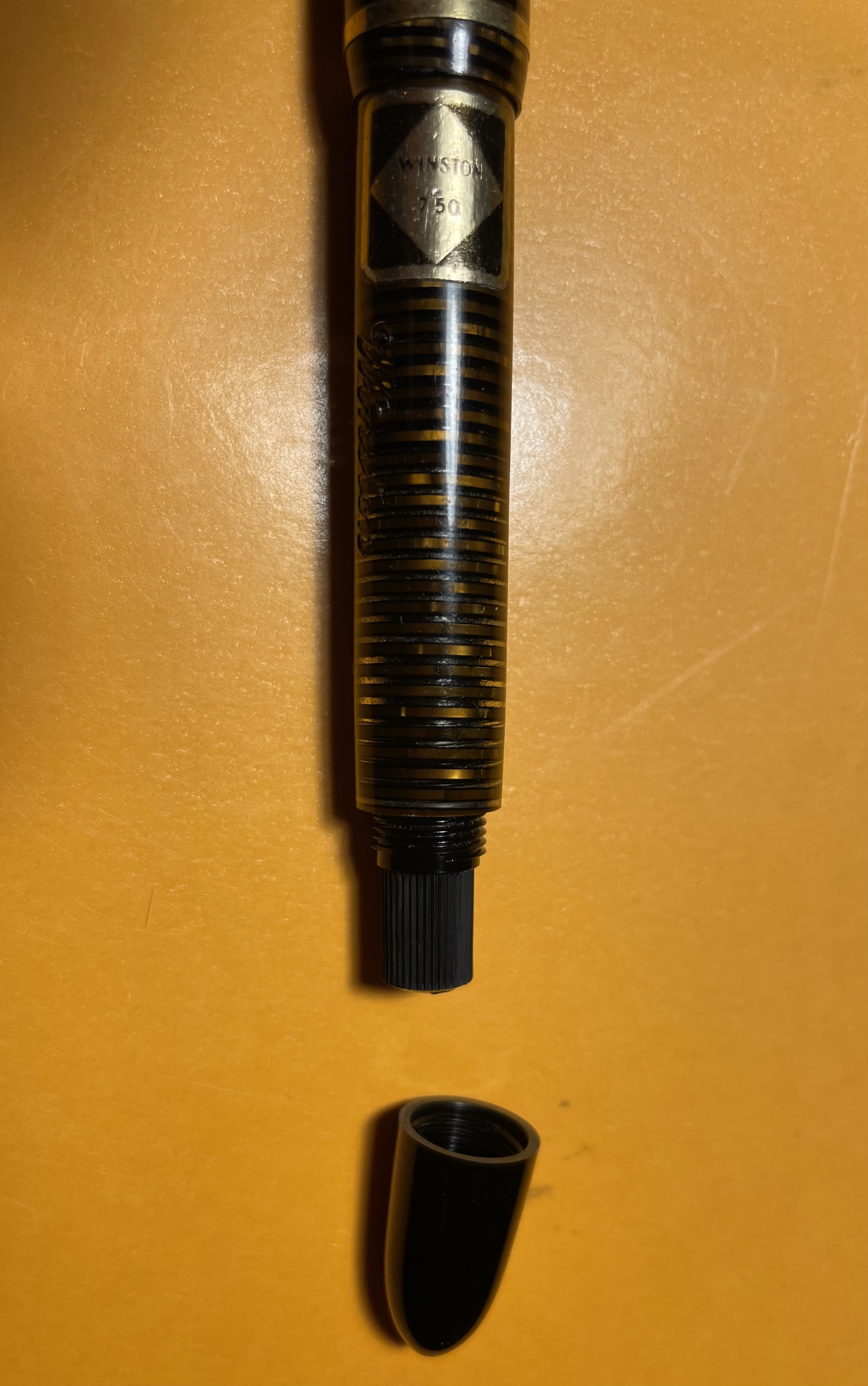 Winston è un nome mai sentito, se non per penne recenti con riferimento a Churchill. Ma Degussa è una azienda tedesca, la clip richiama un po' quella della Pelikan, e lo stantuffo con il fondello rimuovibile era molto comune nelle penne tedesche (e assai meno altrove). Indizi molto labili, però fanno preferire, in mancanza di una qualunque evidenza maggiore, l'ipotesi di origine tedesca assai più di quella di origine italiana,